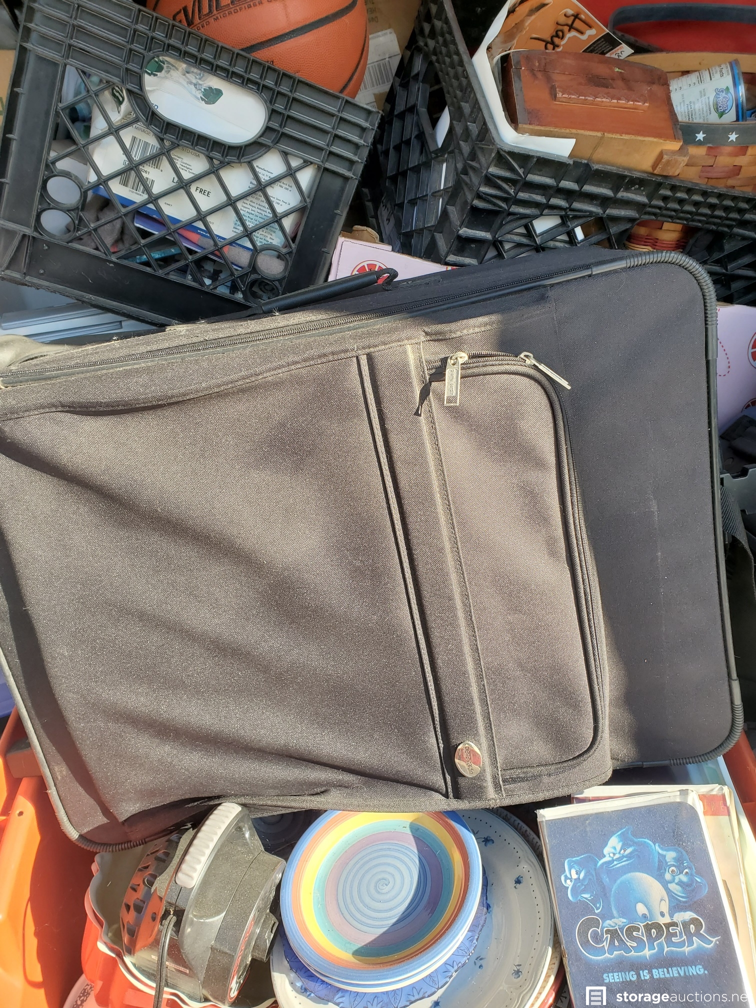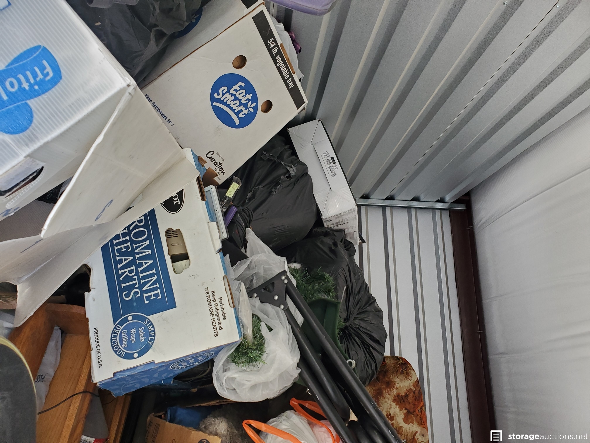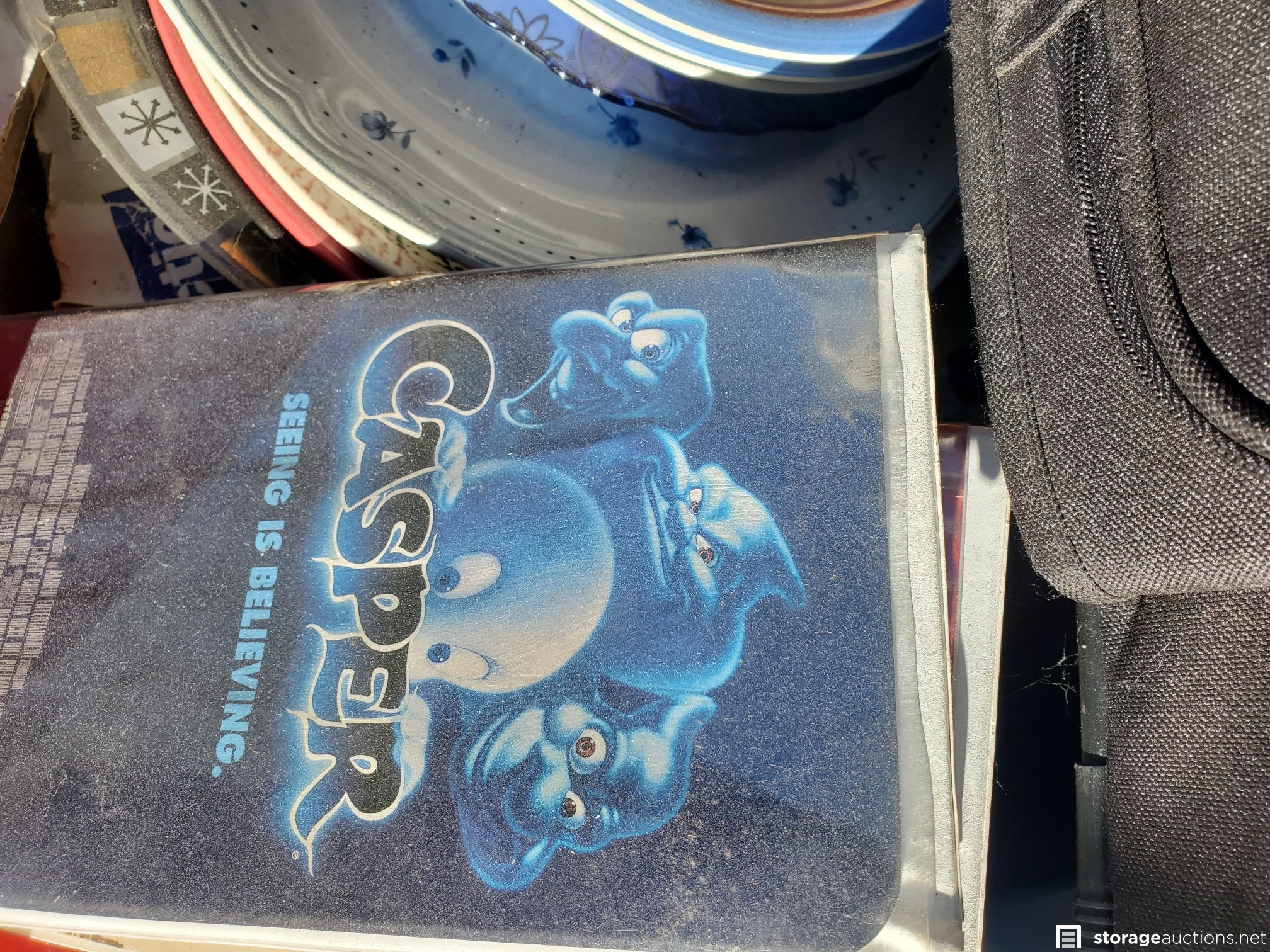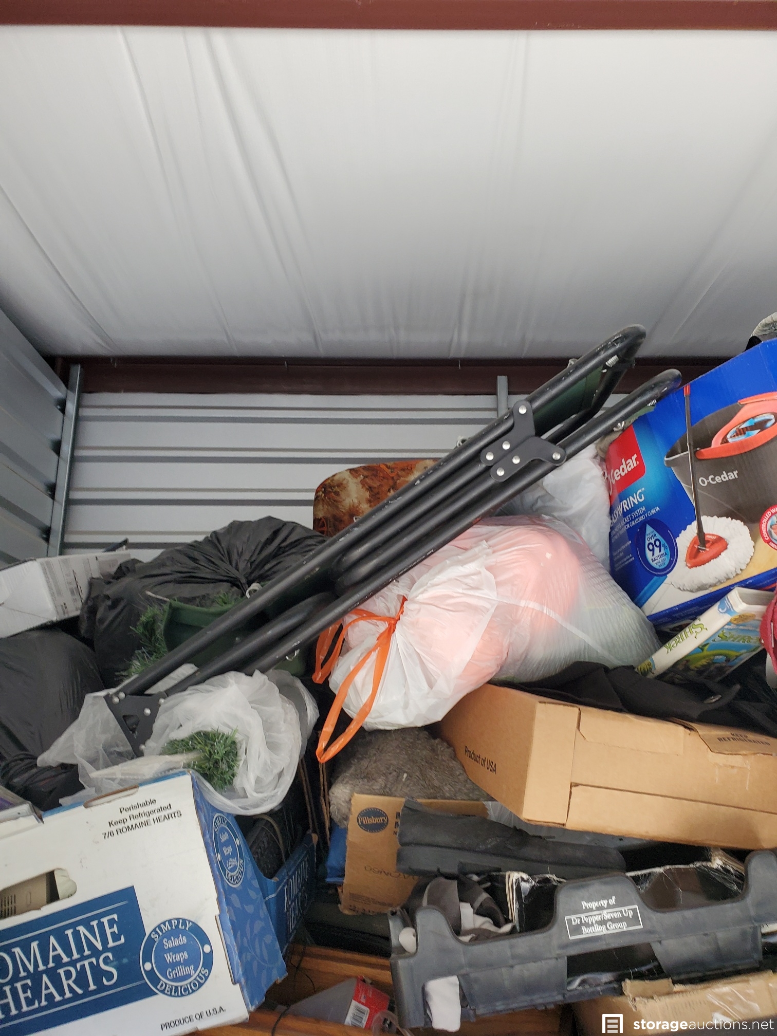 Vacuum, basketball, luggage, Kolo bike, 2 roasting pans, huge teddy bear, cot, crutches, mirror, many VHS tapes, eagle picture, boxes and bags, table,