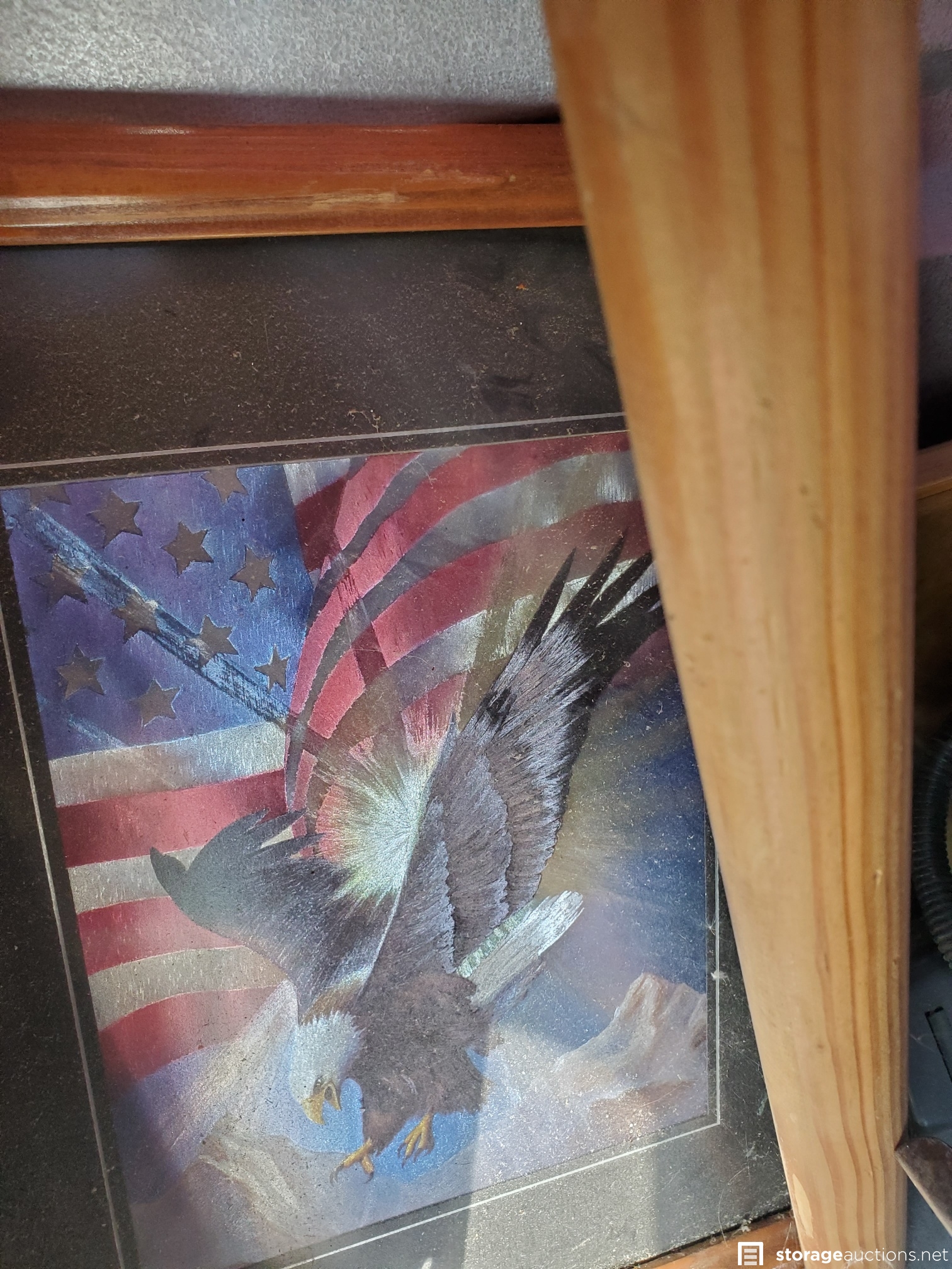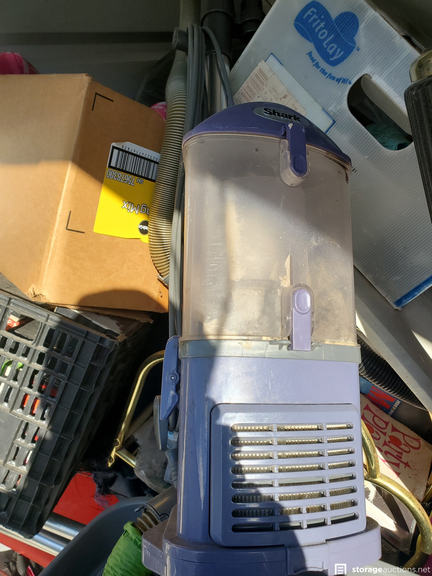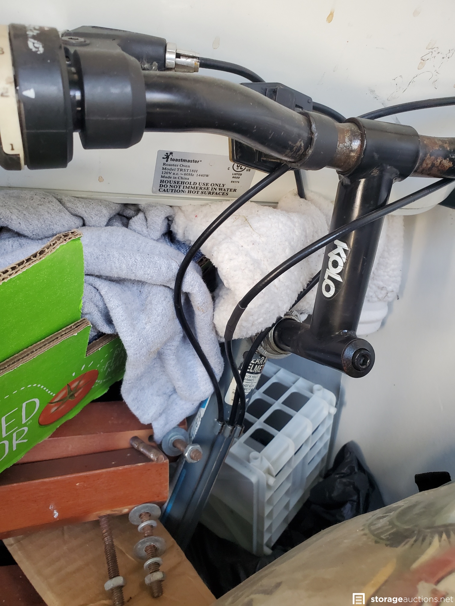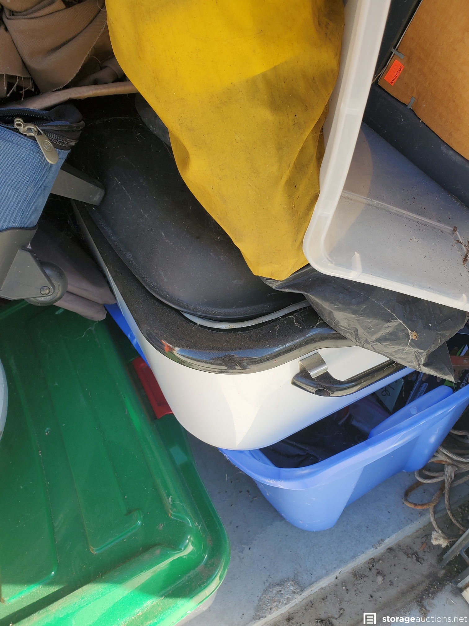 Vacuum, basketball, luggage, Kolo bike, 2 roasting pans, huge teddy bear, cot, crutches, mirror, many VHS tapes, eagle picture, boxes and bags, table,
