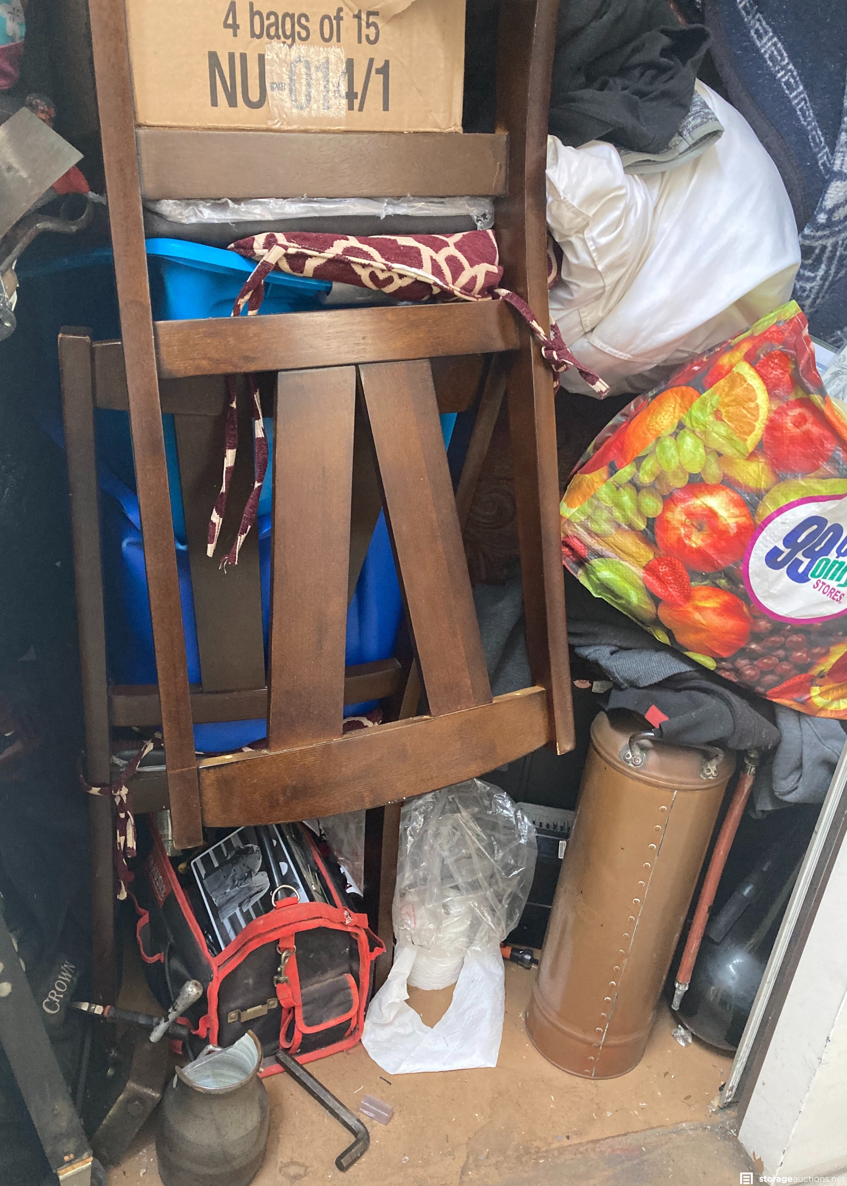 Boxes, chairs clothing, tool bag