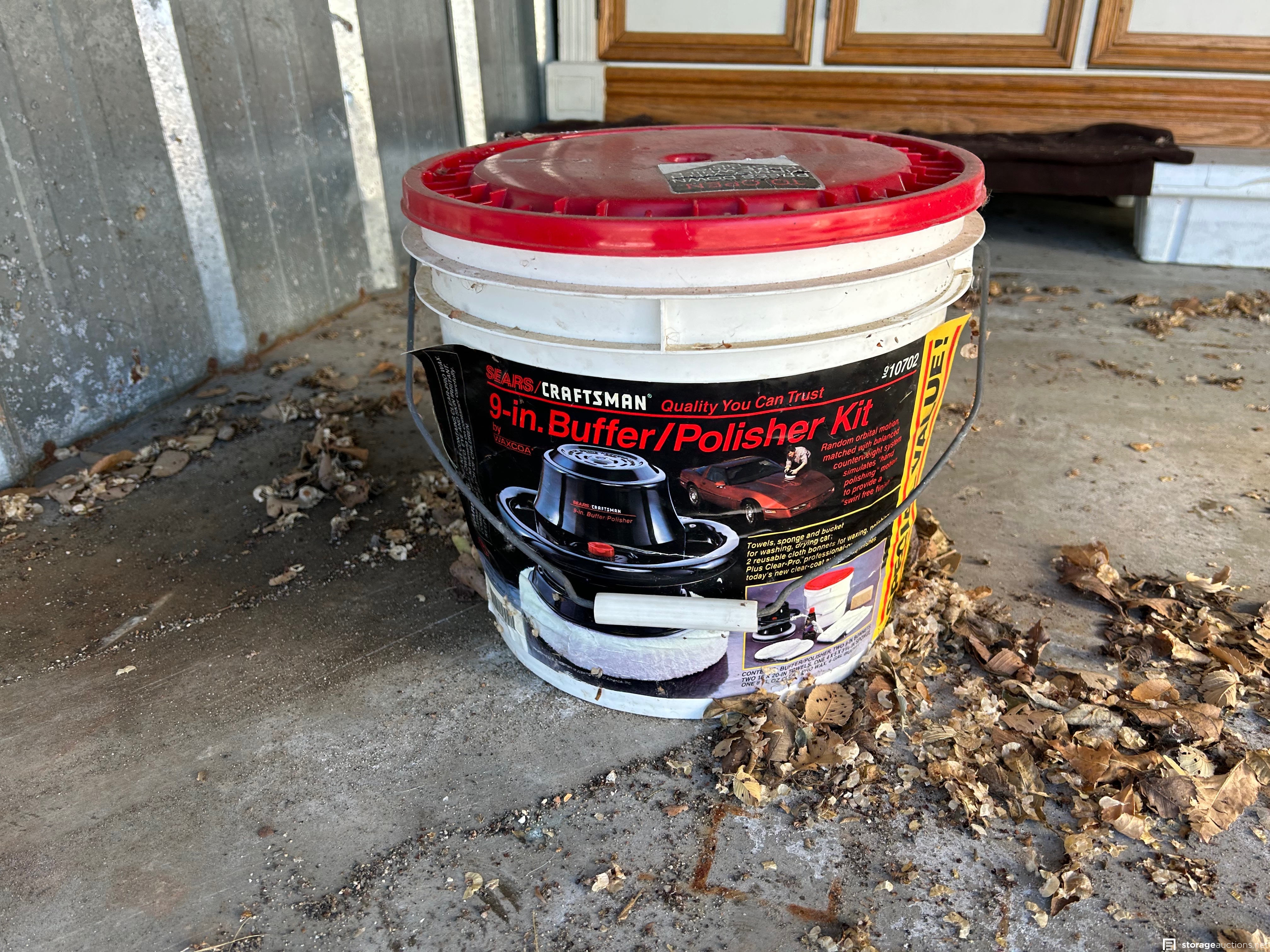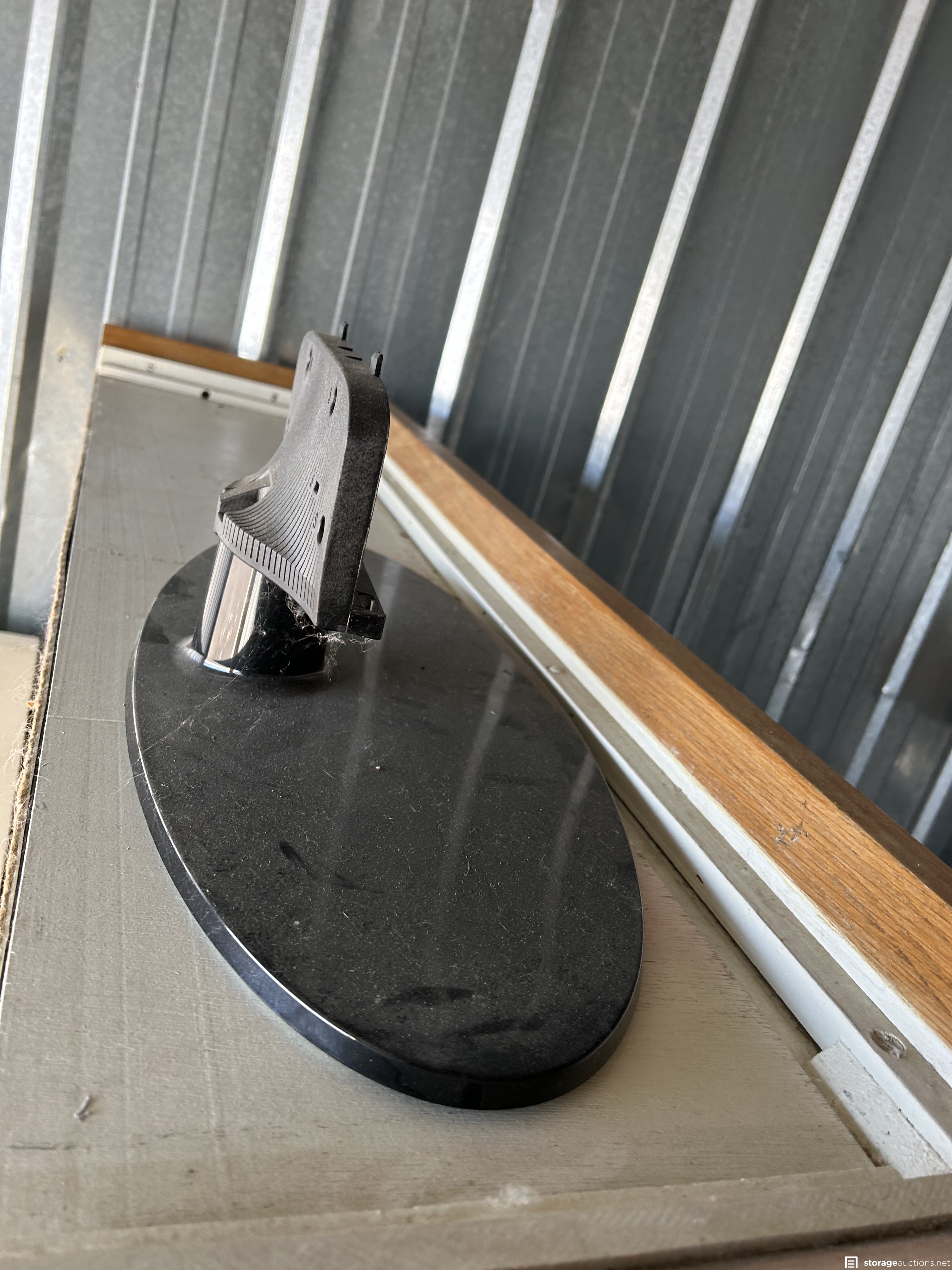 This unit appears to contain a 2 piece cabinet, plastic drawers, hangers, small propane tank, lantern, Sony speakers, TV mount, hoe and floor lamp