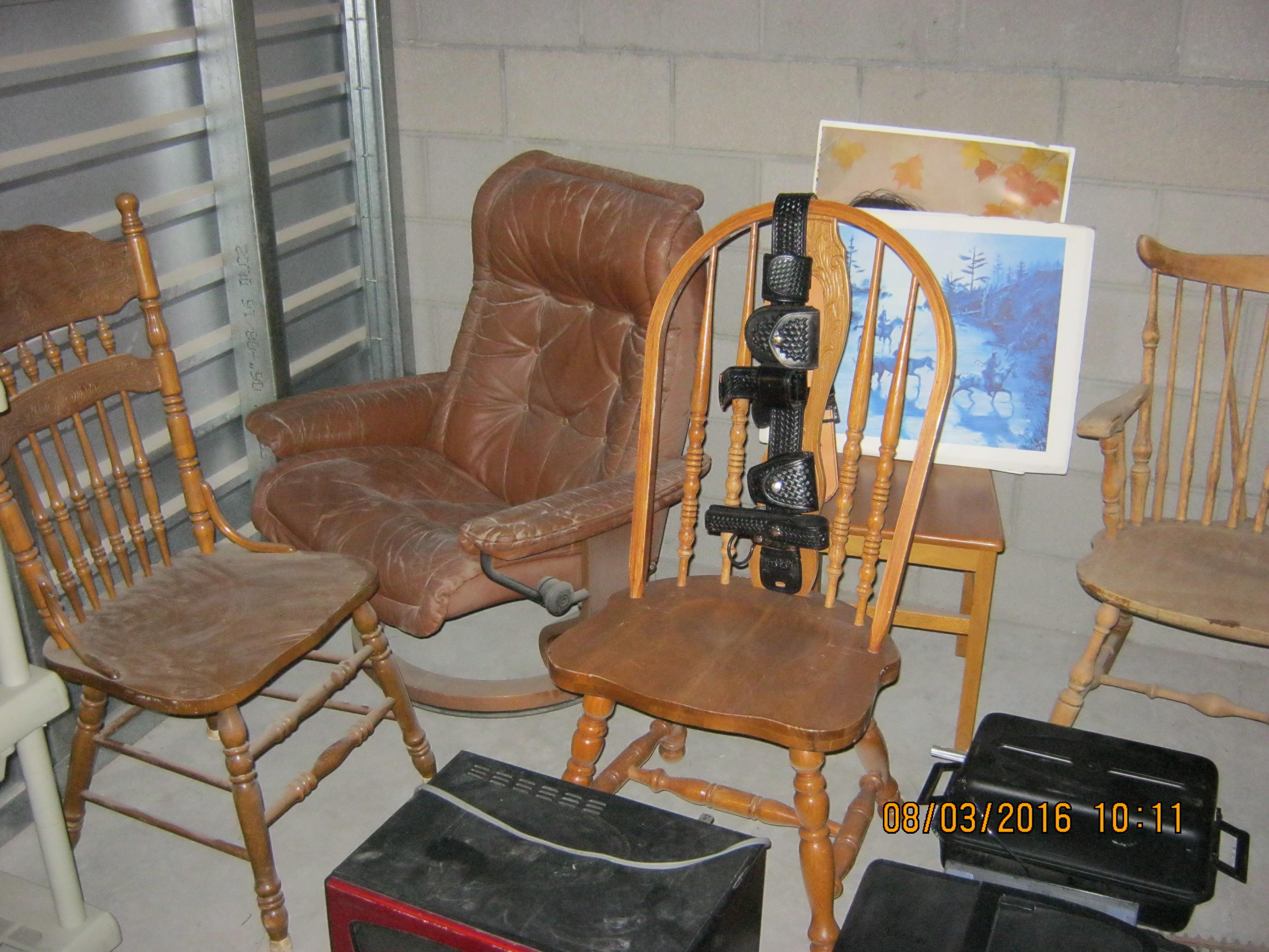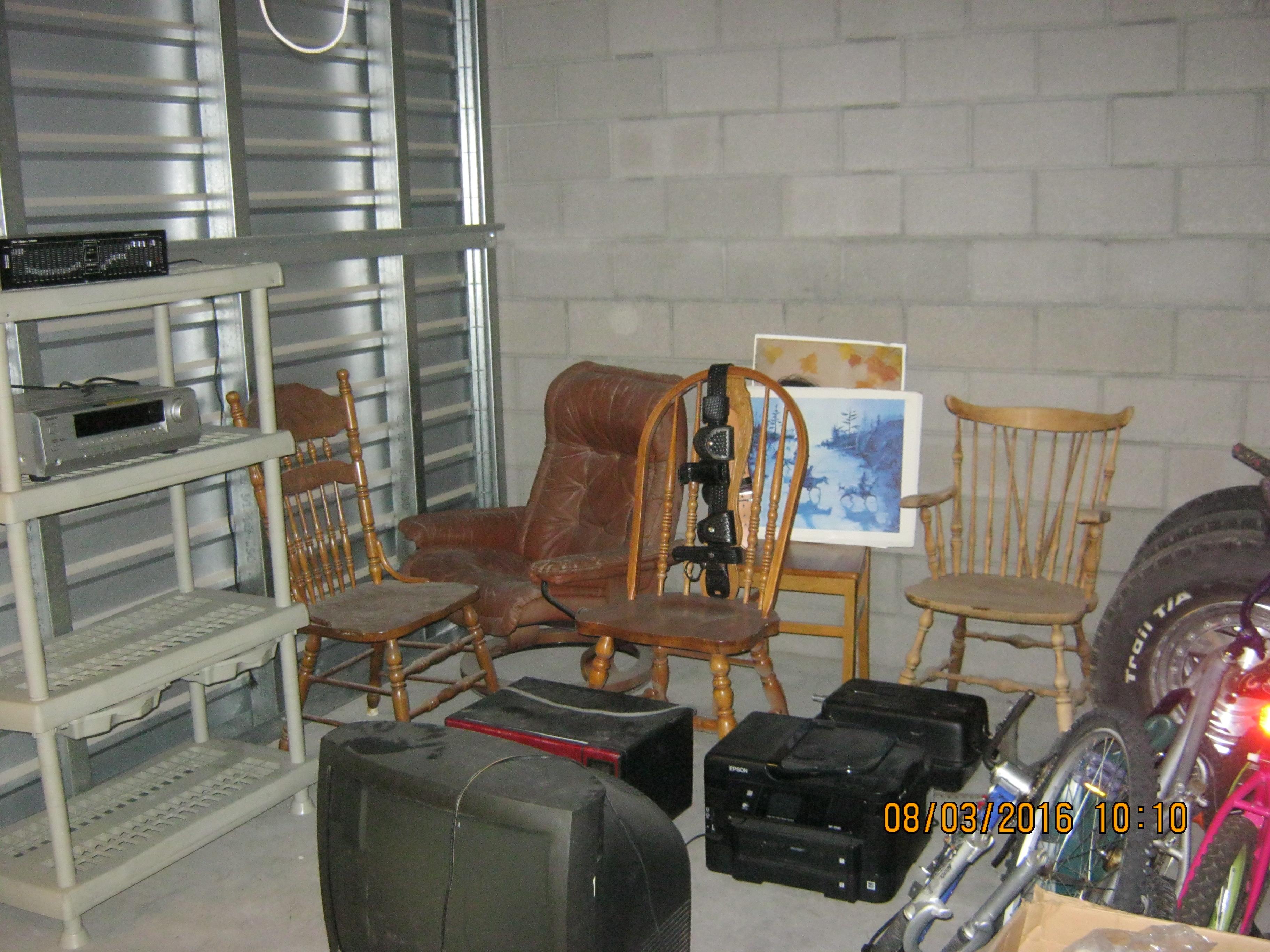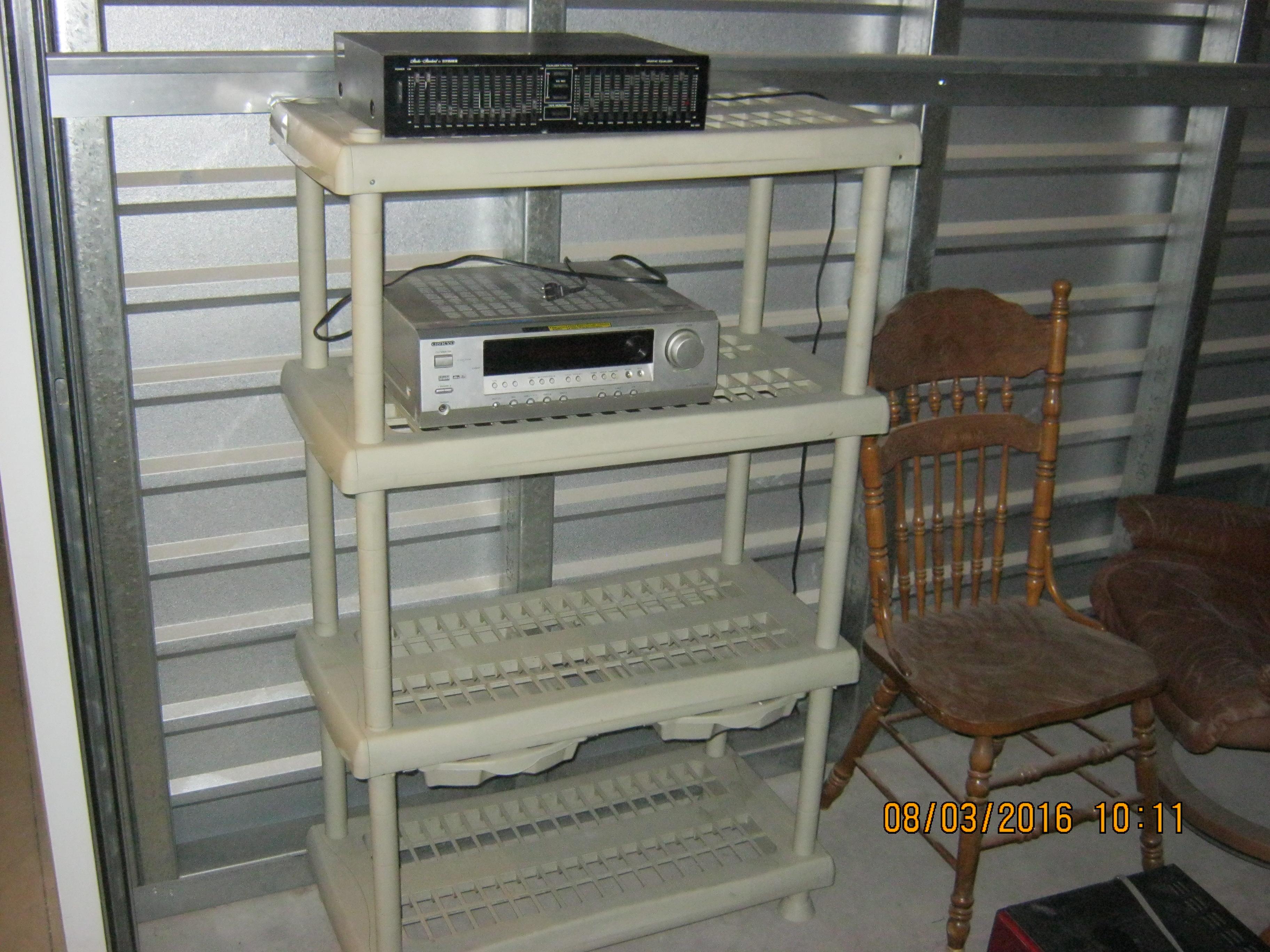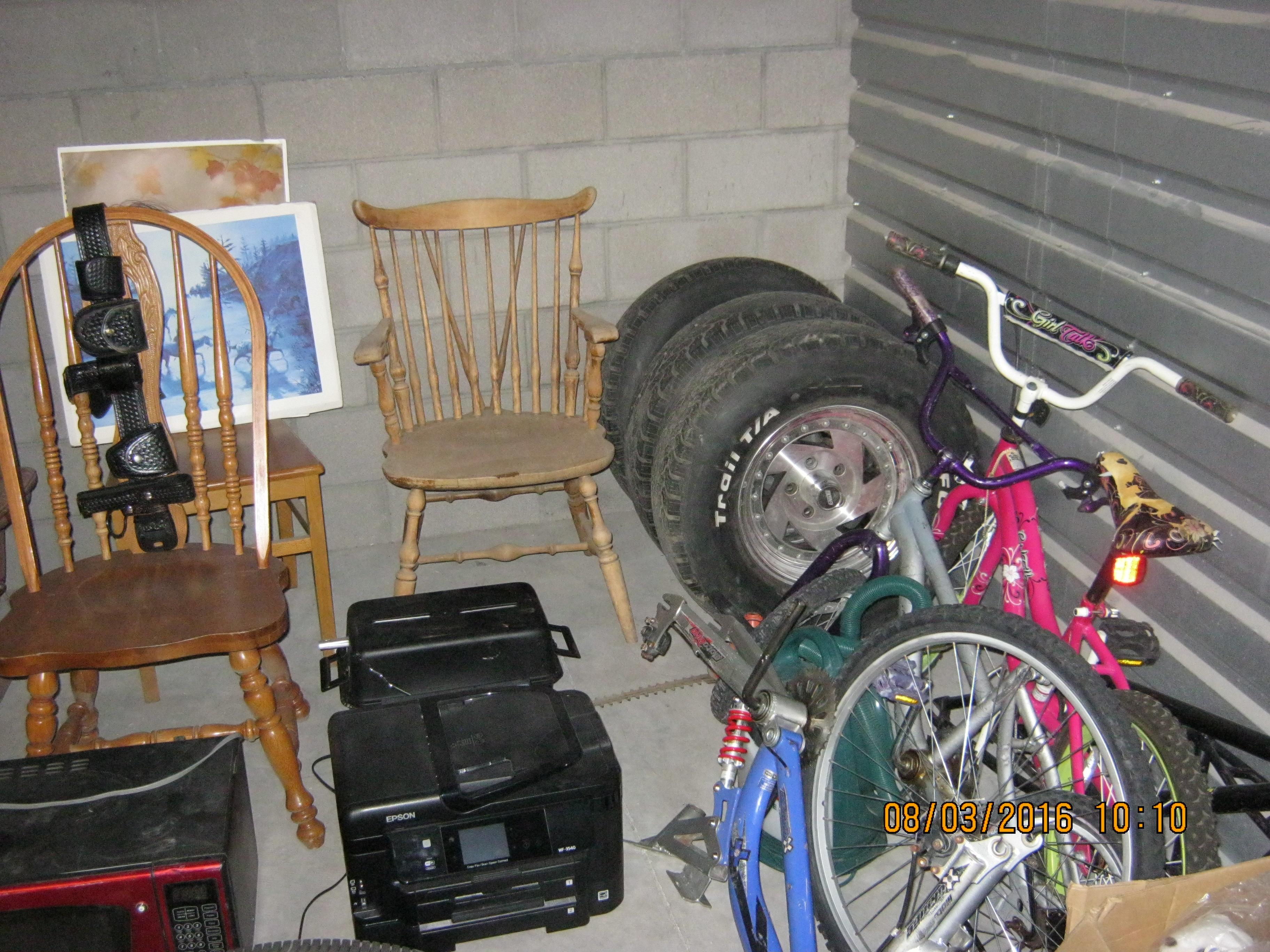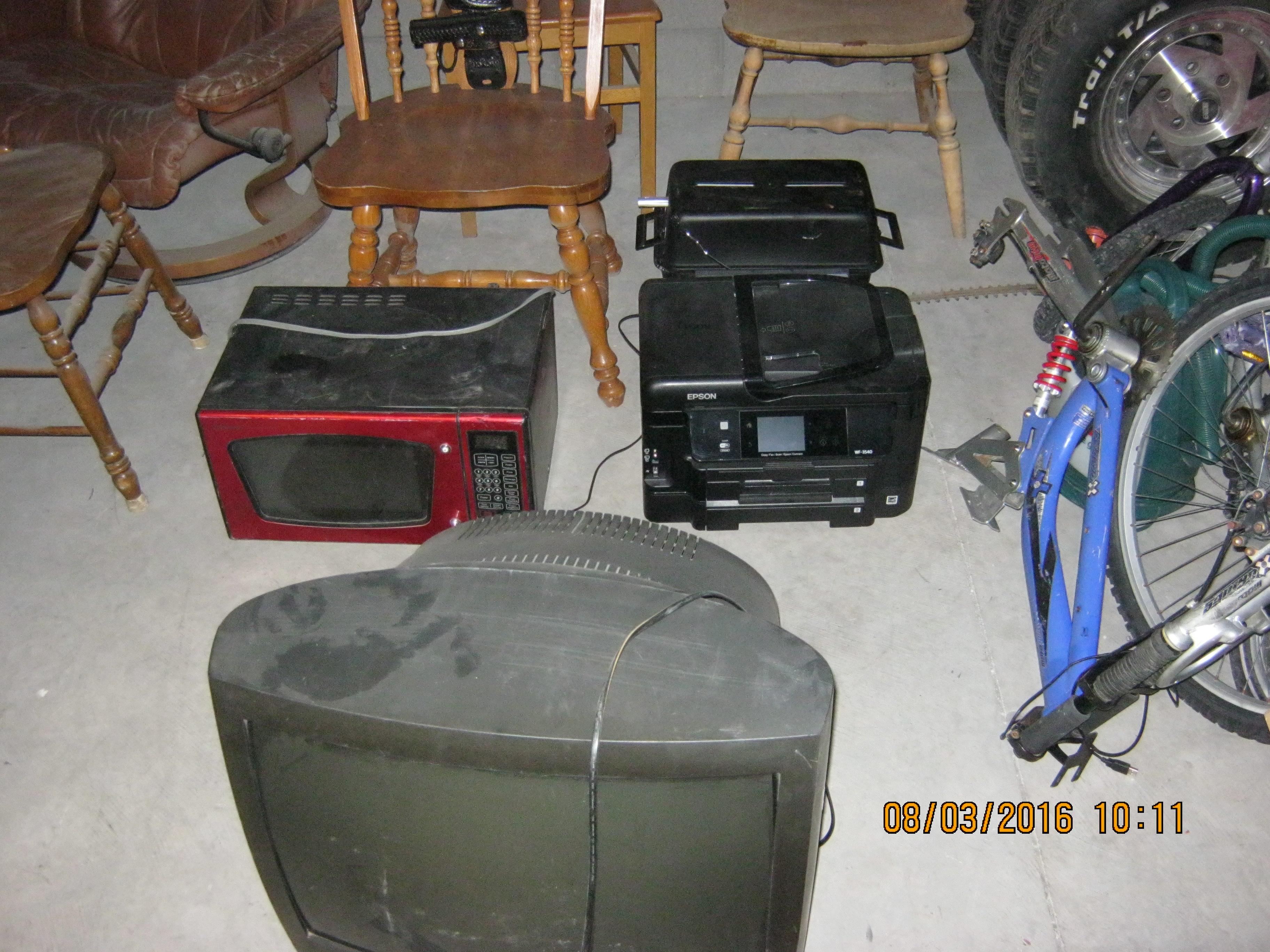 Onkyo Receiver, Fisher equalizer, wooden chairs, leather chair, TV, microwave oven, propane camp stove, Epson printer, bicycle frames, girls bike, Police/Security Guard leather belt, shelving unit