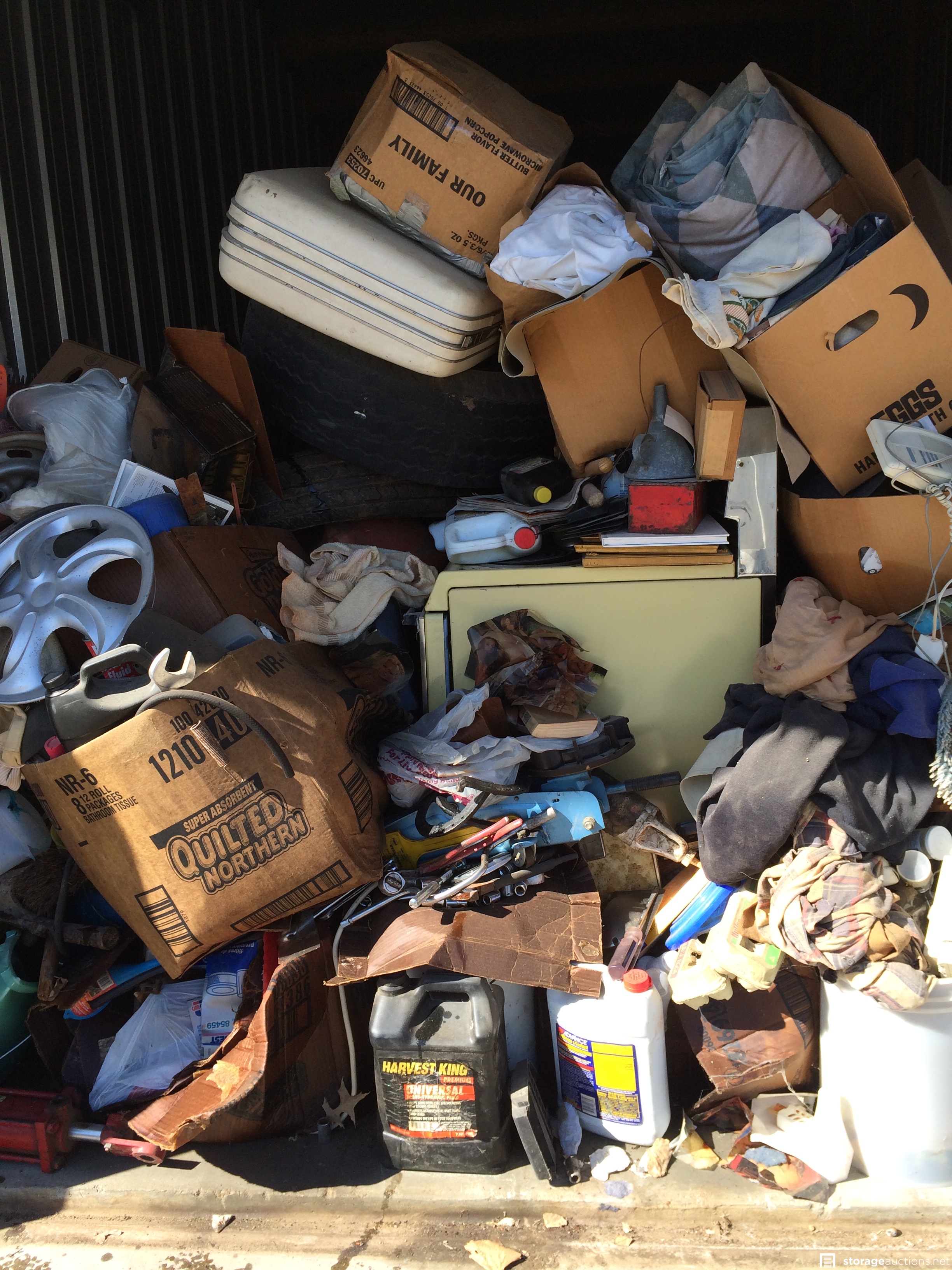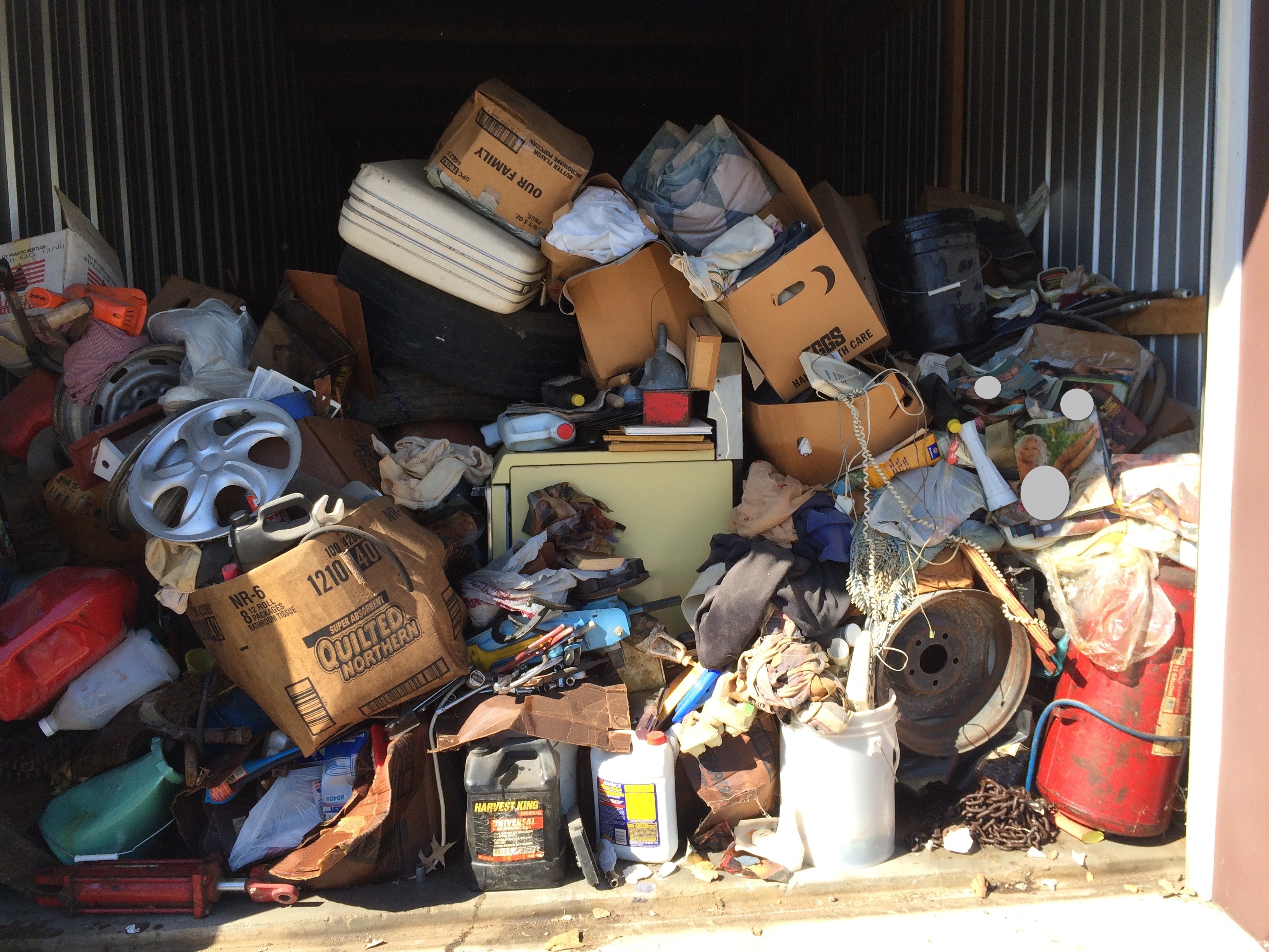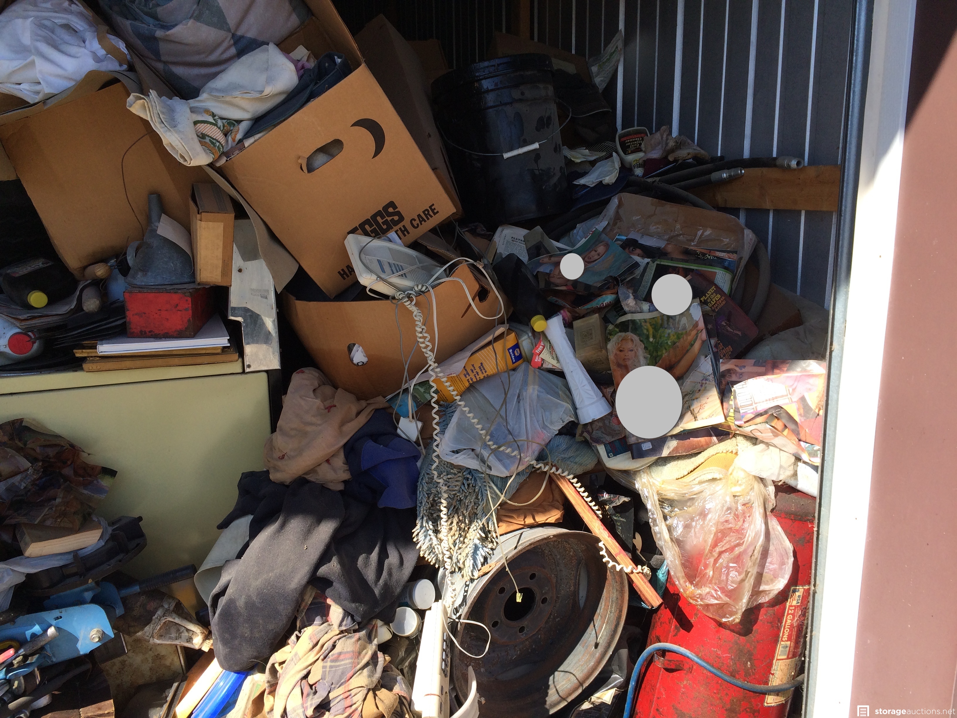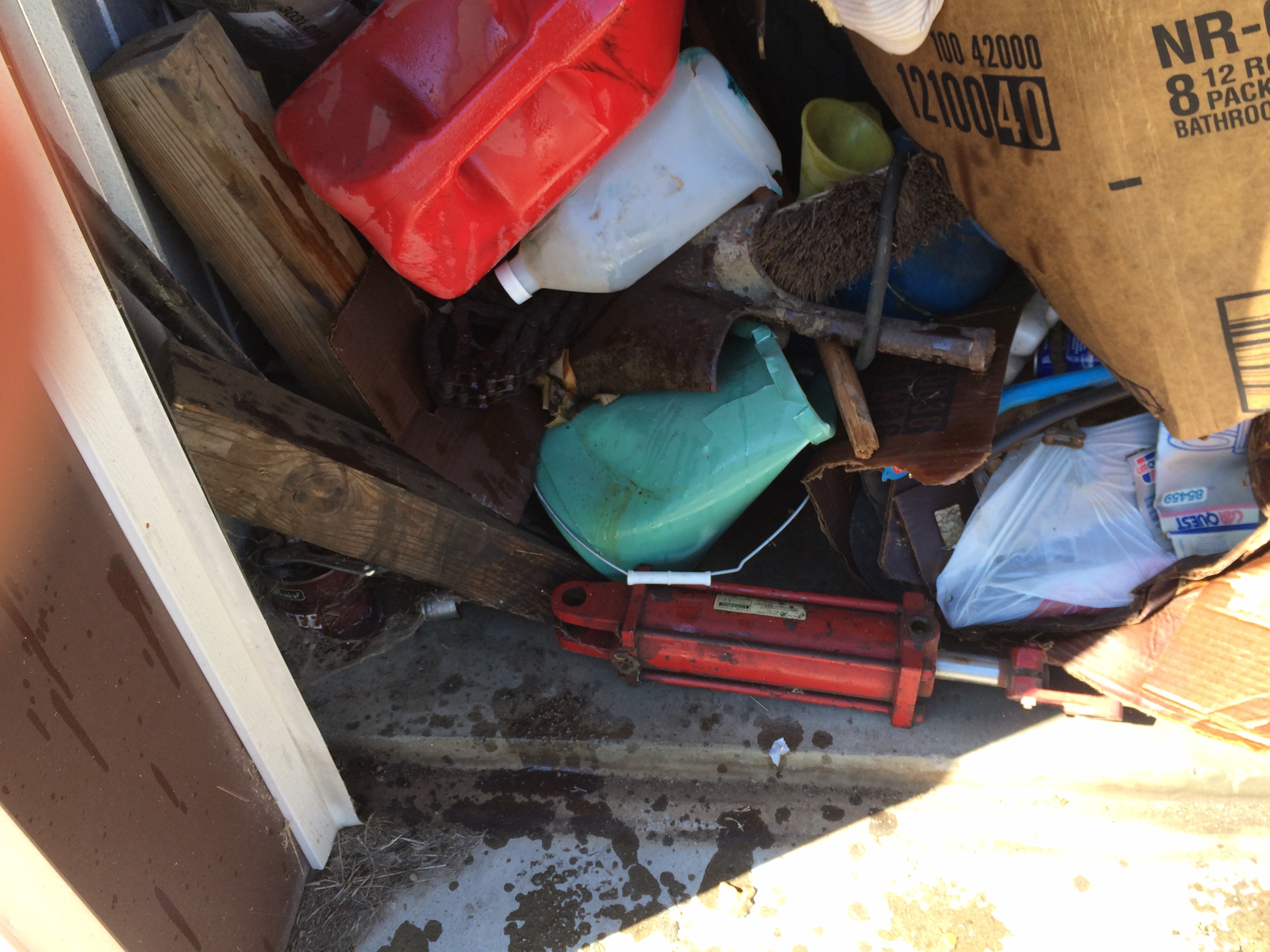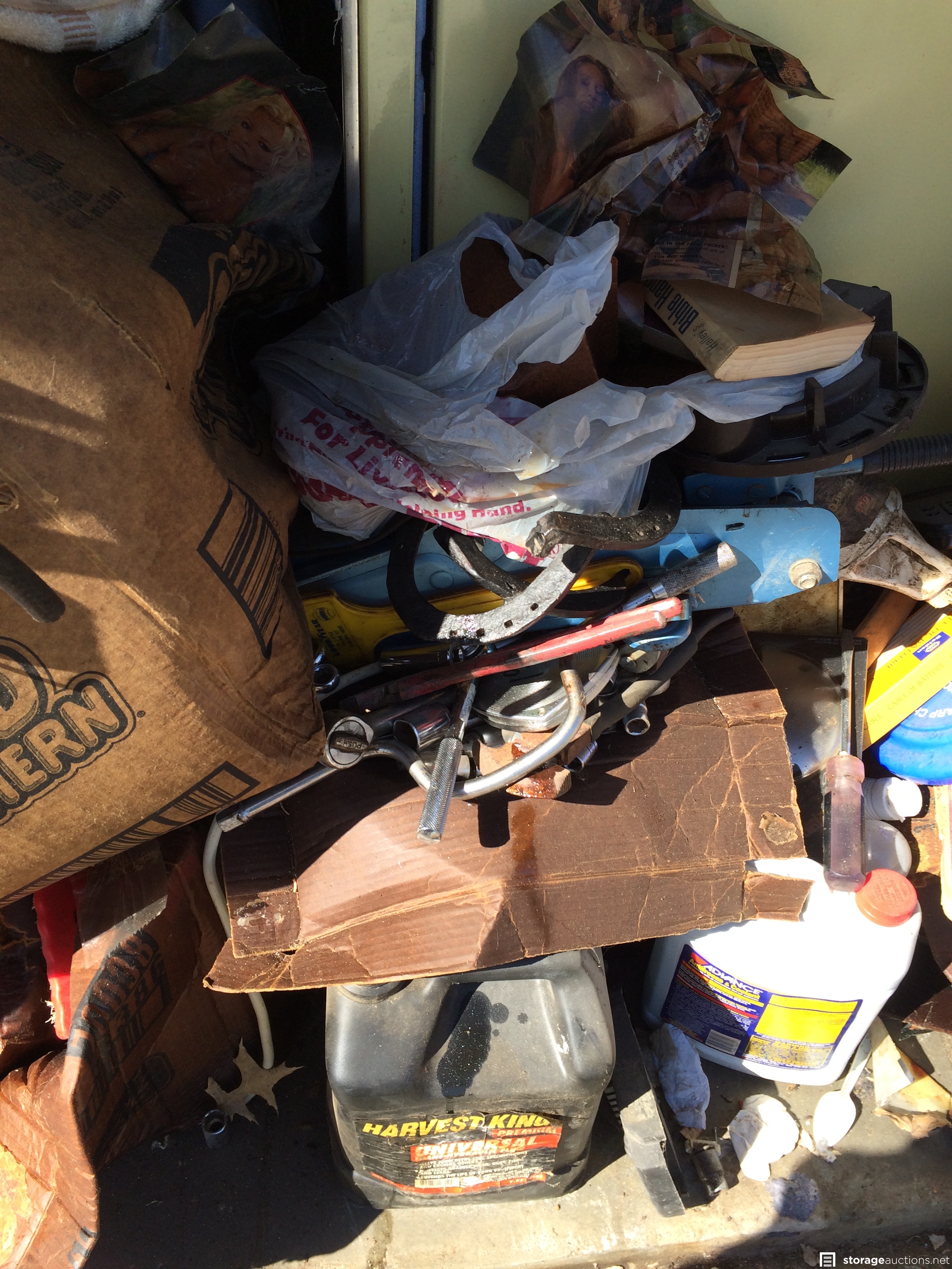 Hubcaps, tire rims, compressed air tank, tools, sockets, stove, luggage, hydrolic hose and equipment, gas can, horse shoes, chairs, nude magazines, etc.