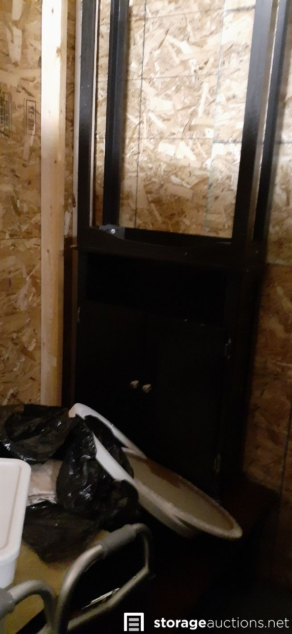 ONE CABINET WITH FROSTED GLASS SHELF COVERING, three shelves