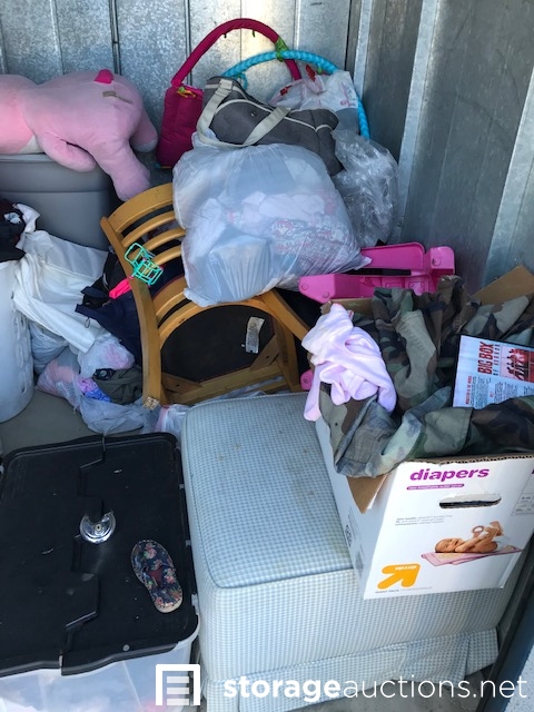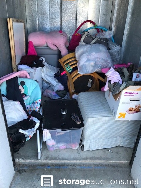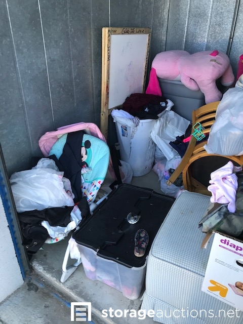 Unit appears to contain bags, clothing, 3 totes, hamper, chair, baby seat, baby toys