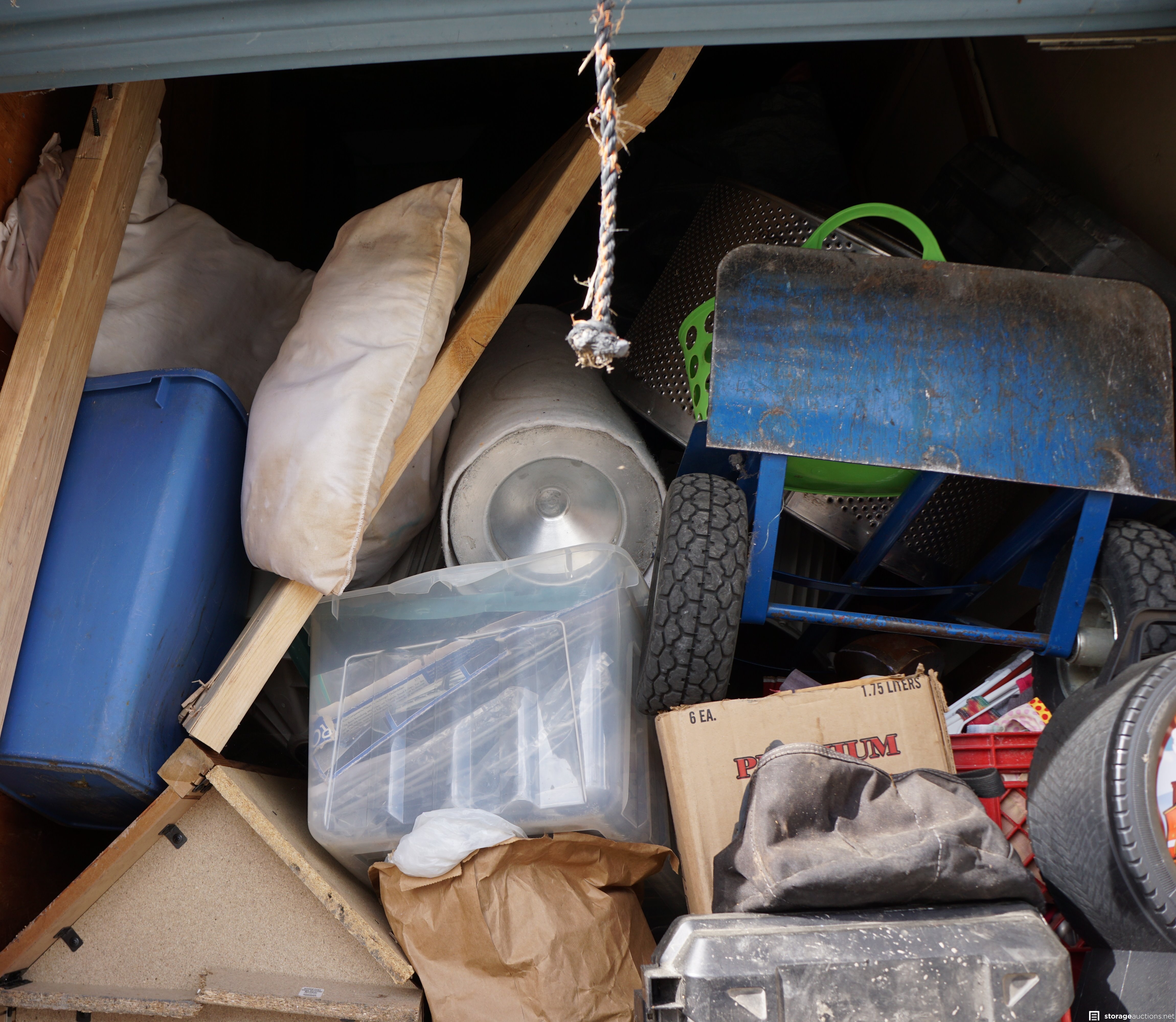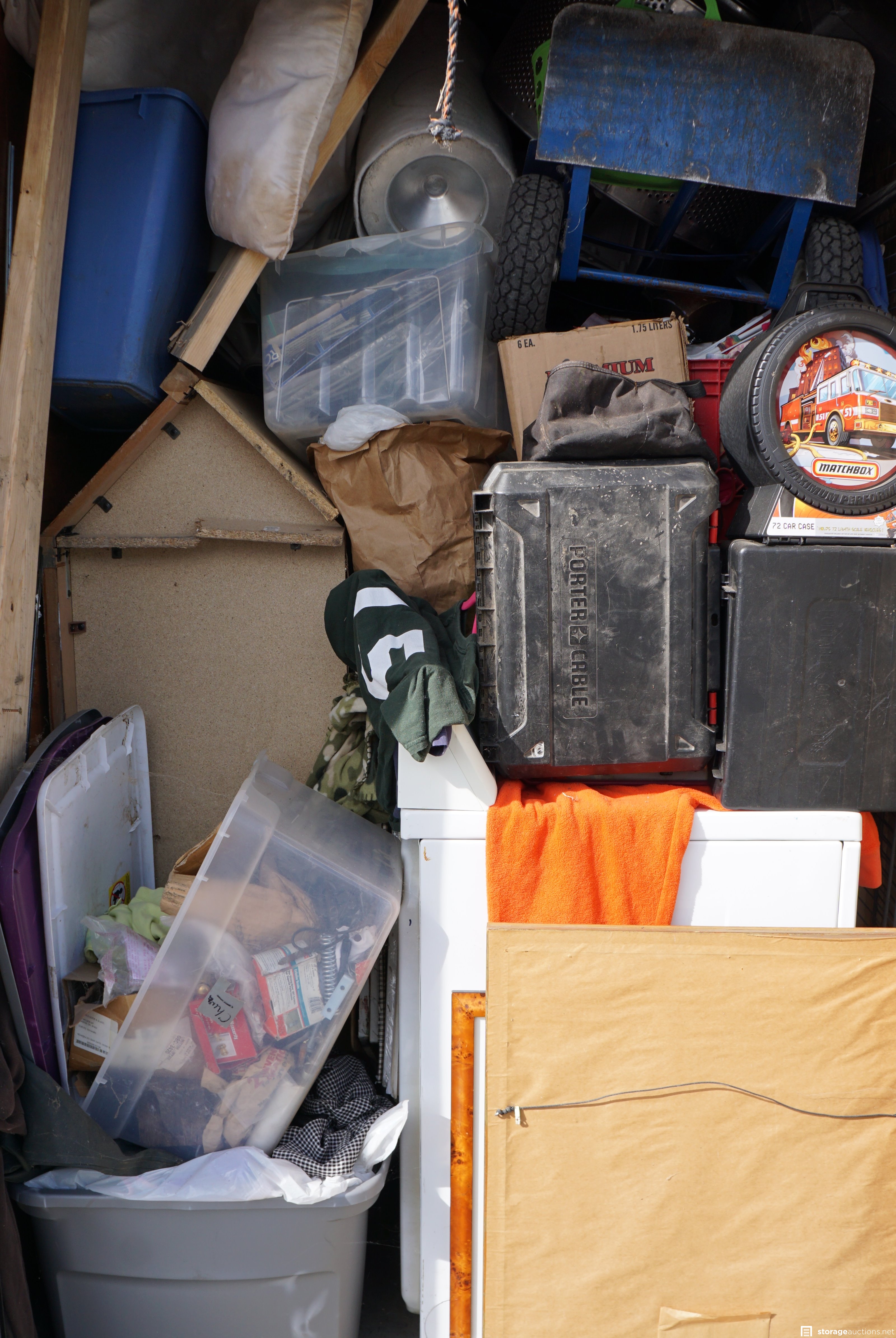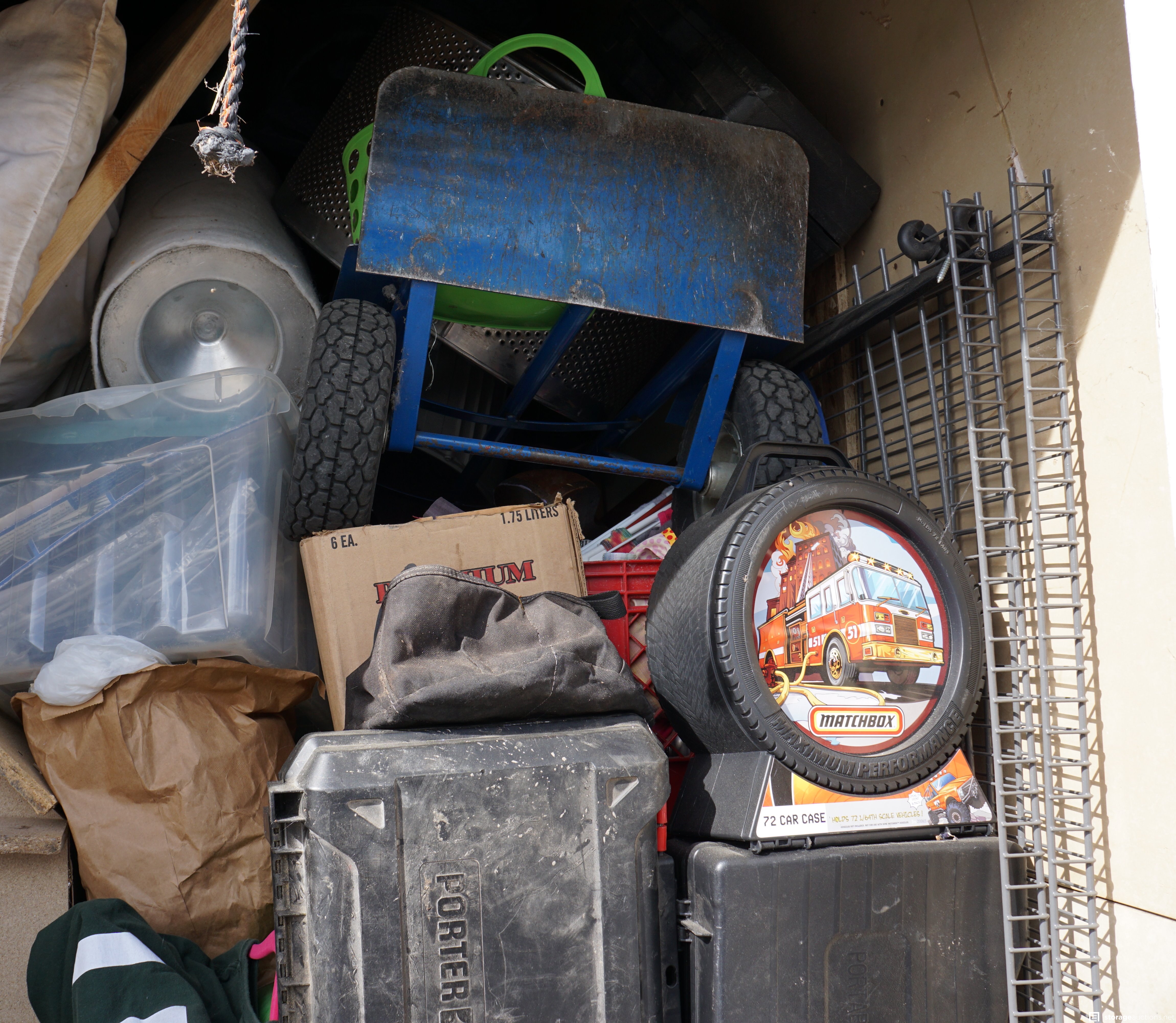 Unit appears to contain a washer and/or dryer; a hand truck/dolly; framed art; wire shelving; Matchbox car case; various boxes and containers.