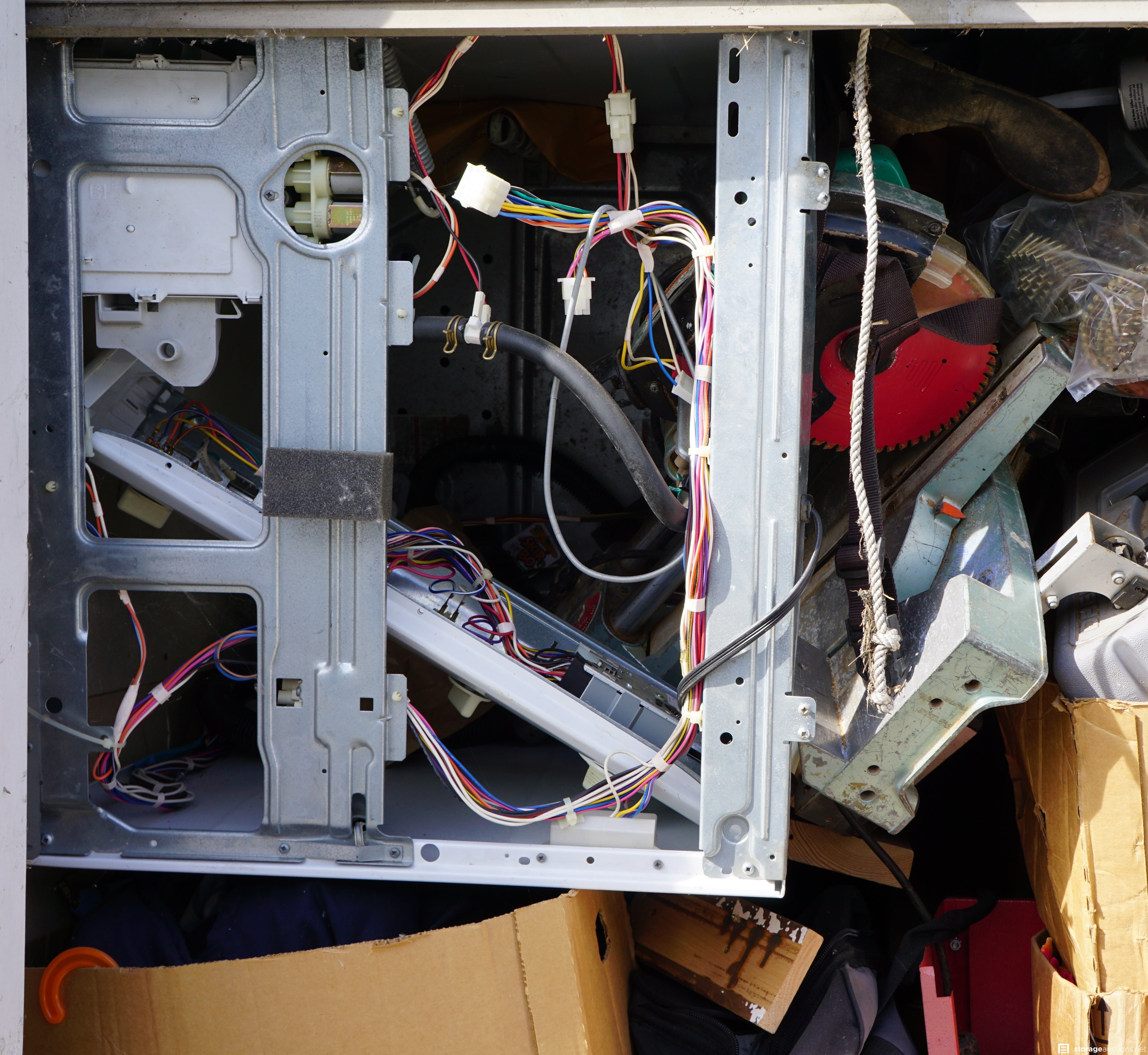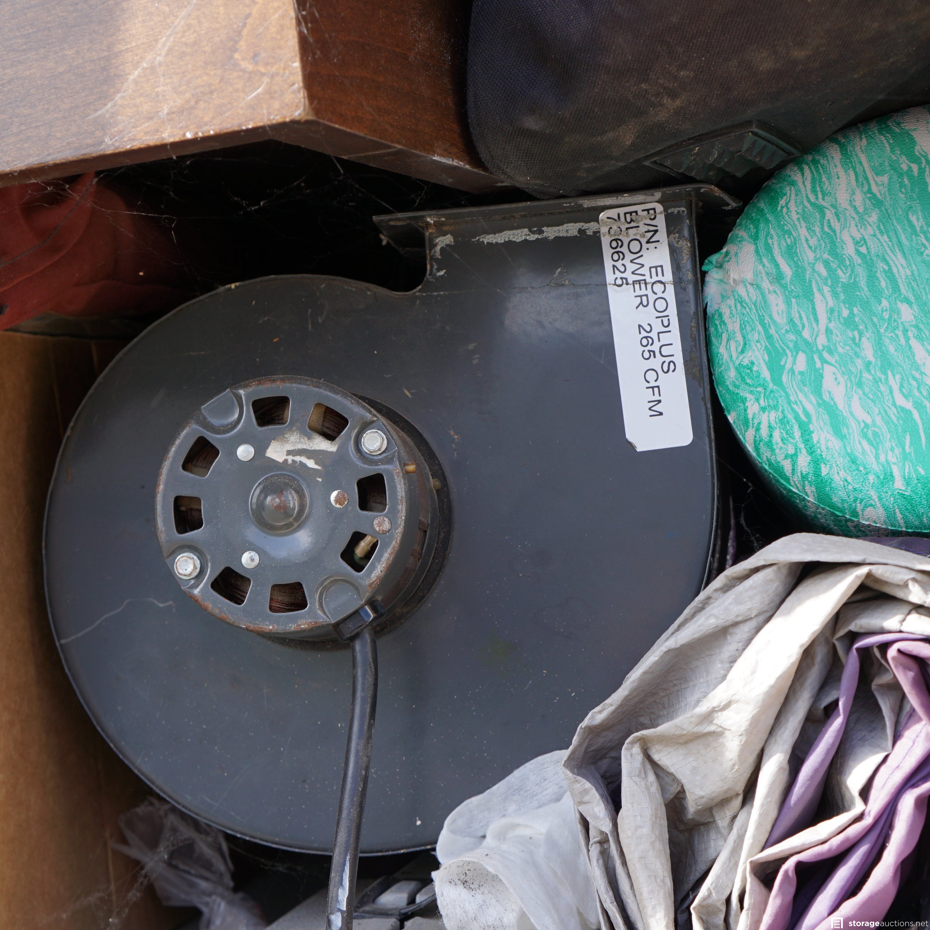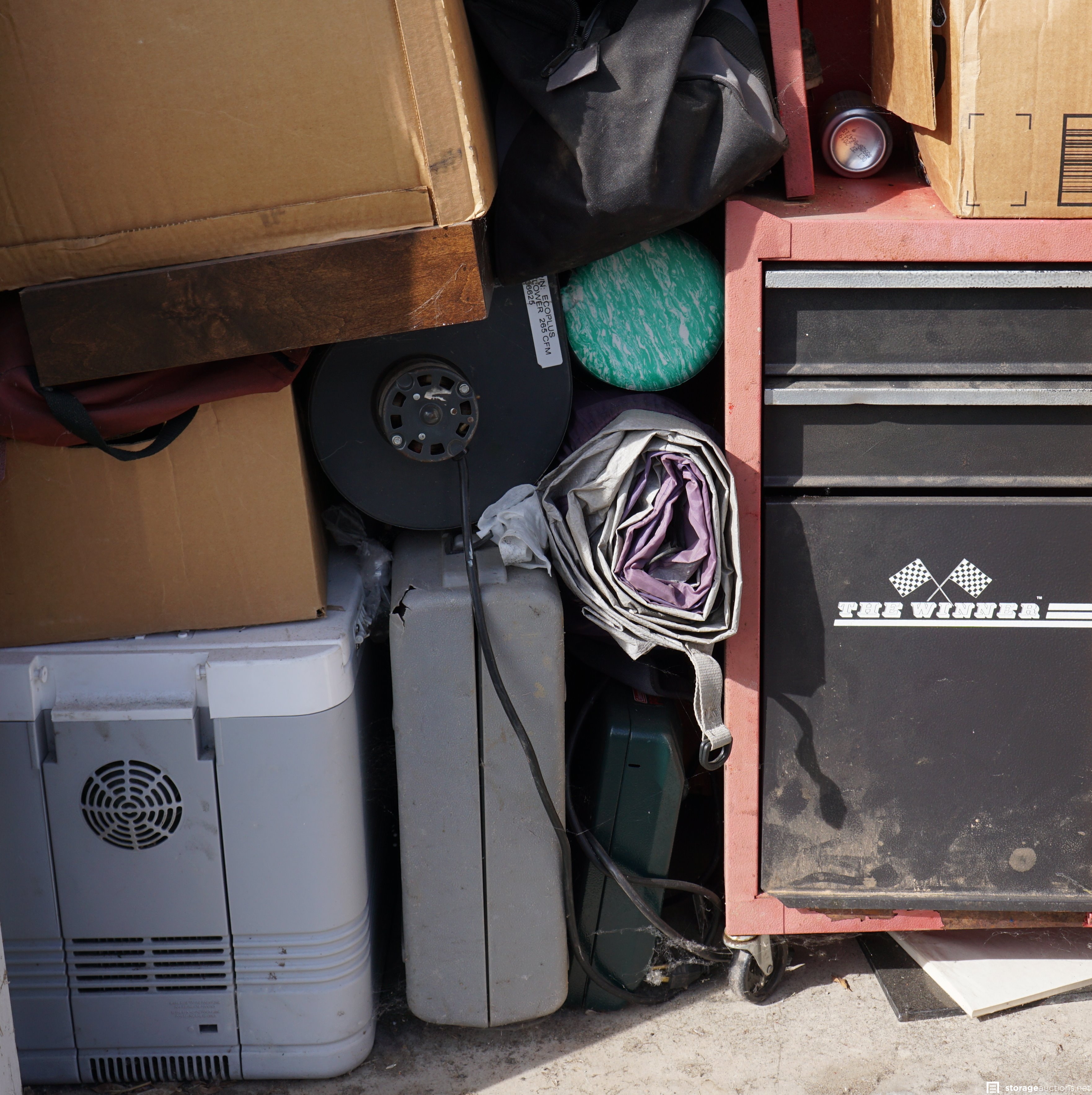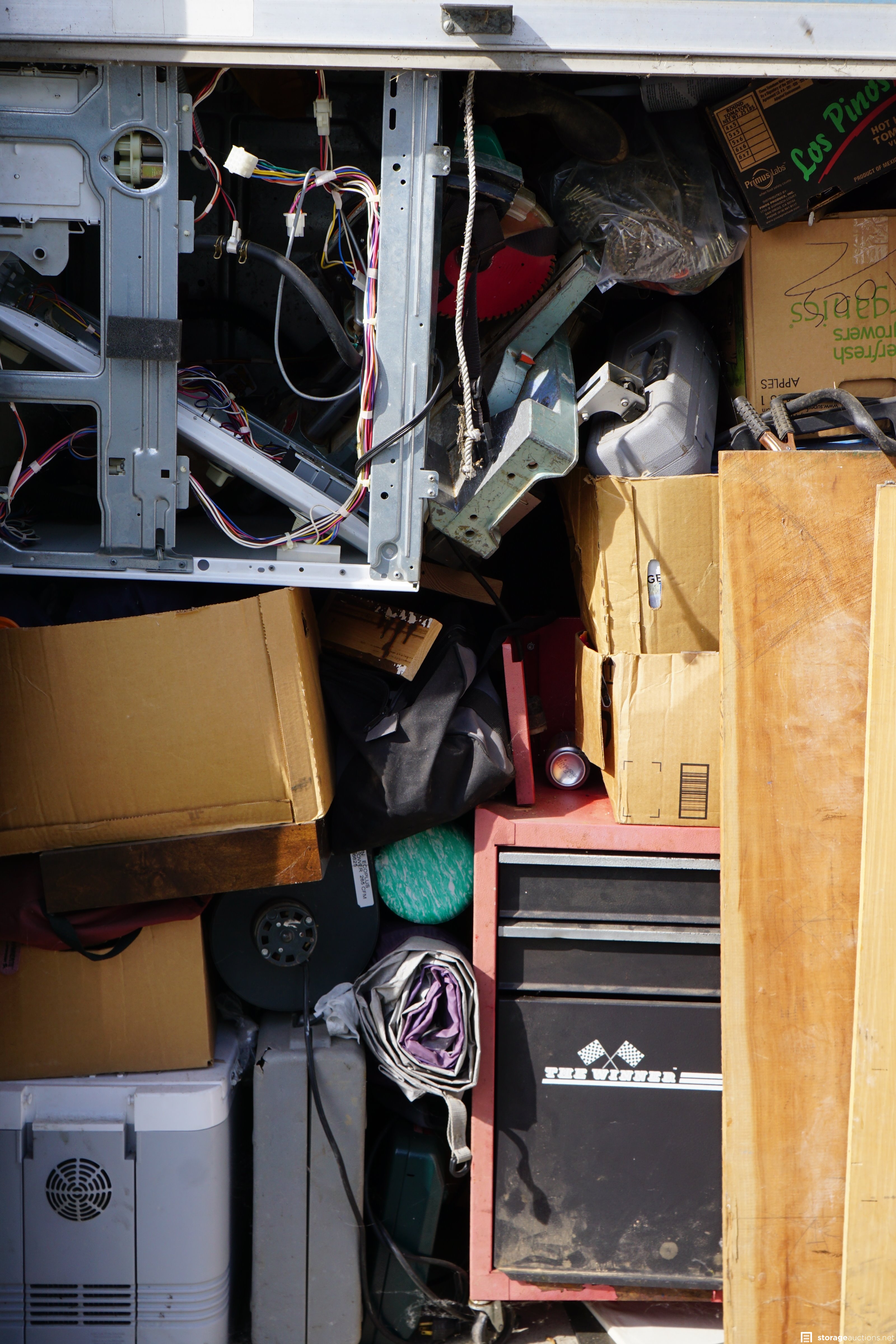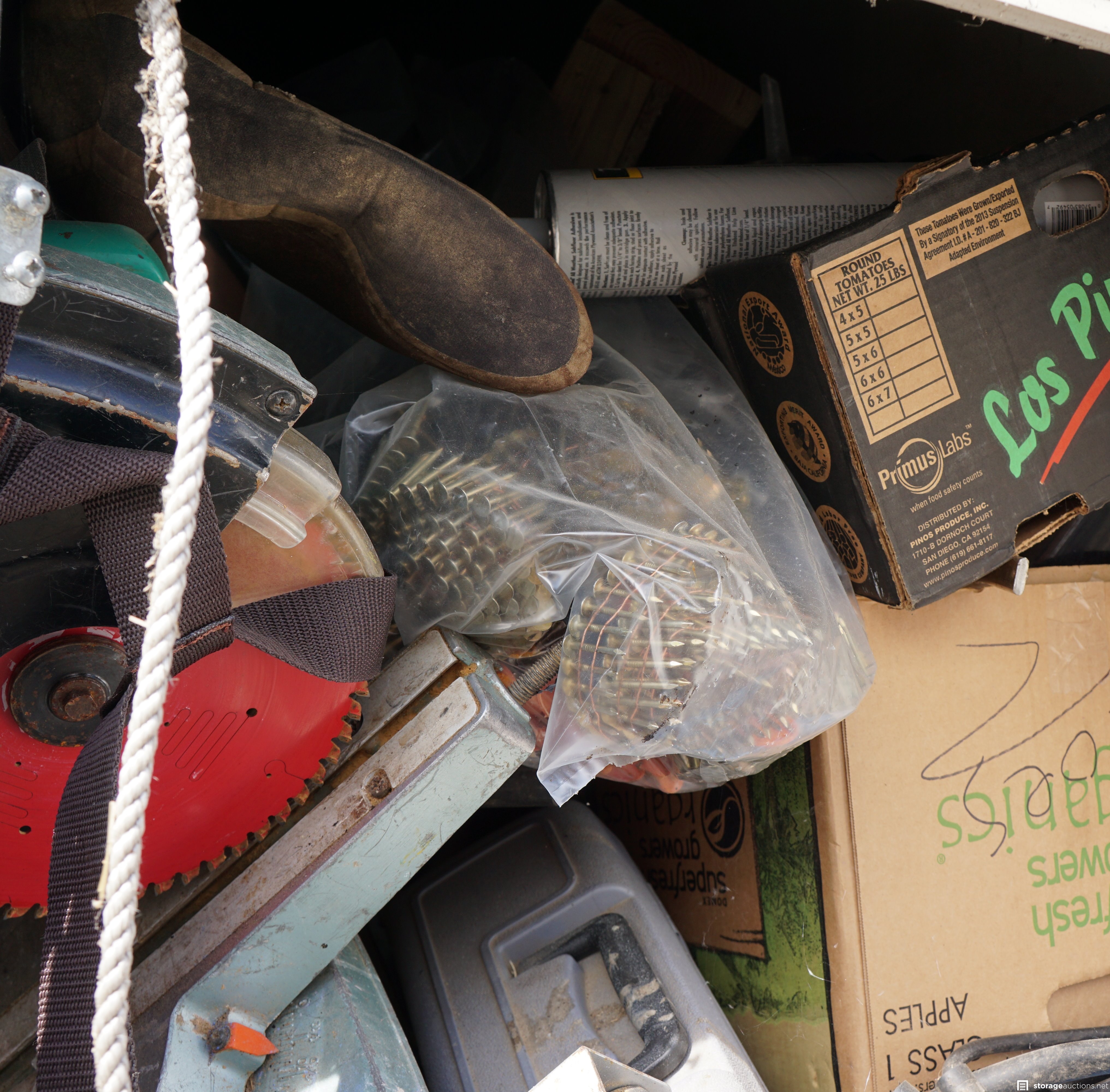 Unit appears to contain a deconstructed appliance frame with wiring; an upright tool chest; a saw; construction-type nail coils (for roofing?); Ecoplus blower; etc.