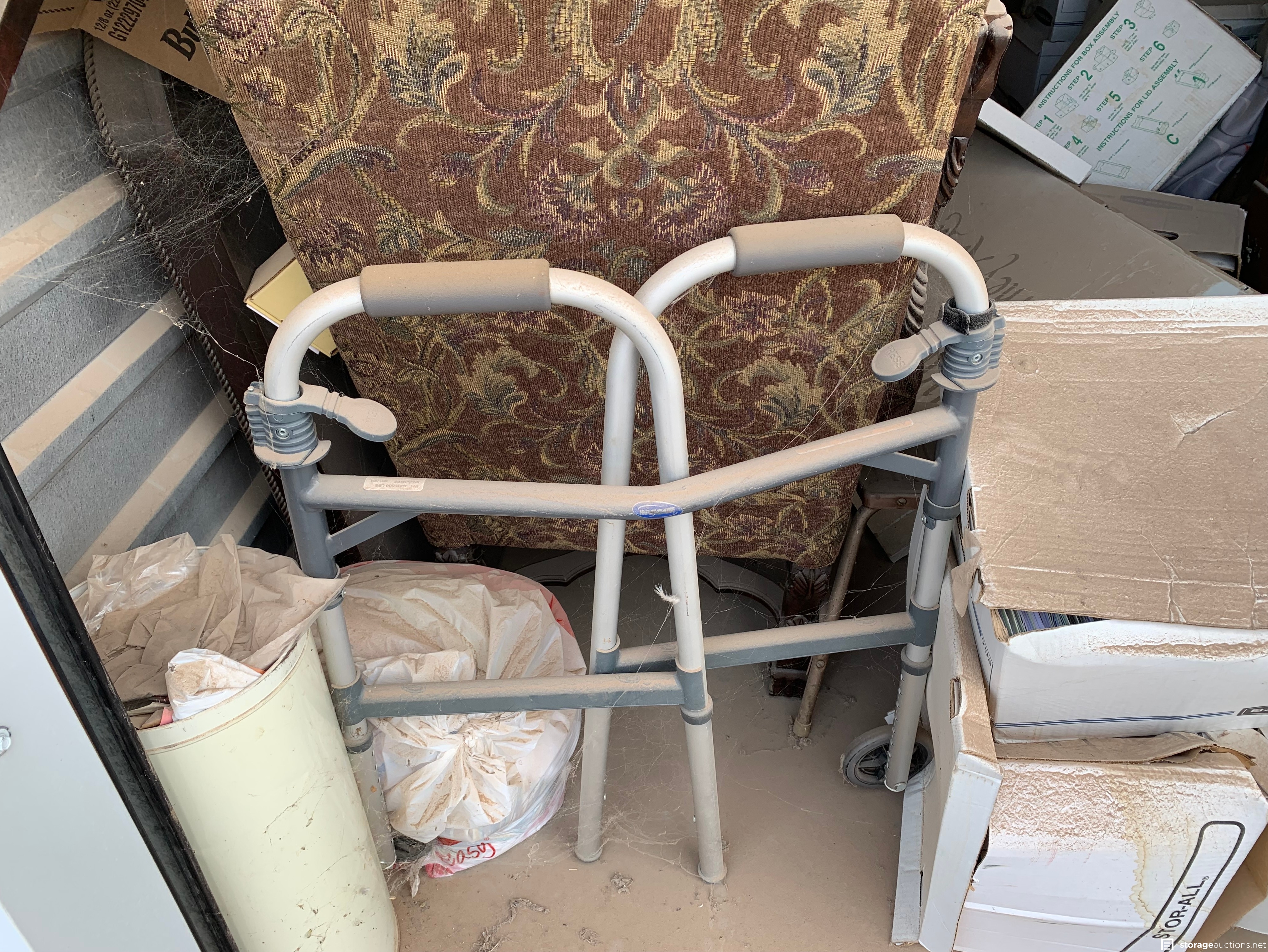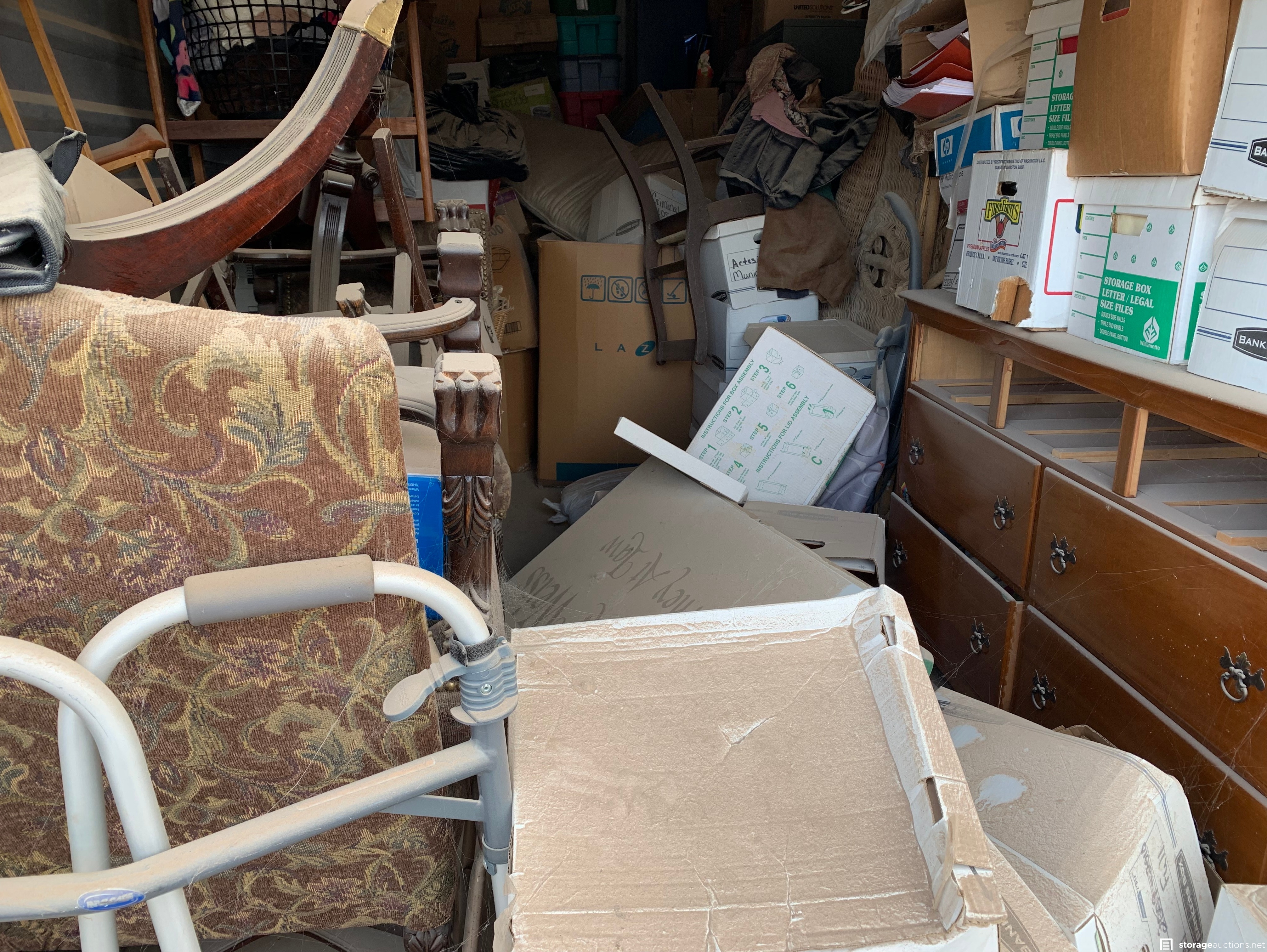 Multiple files of Criminal files, walker, accent chair, wooden crutches, multiple boxes, dresser, wooden shelf, hangers, dining chair and table, paper shredder, luggage bags, file cabinets, hangers, clothes.