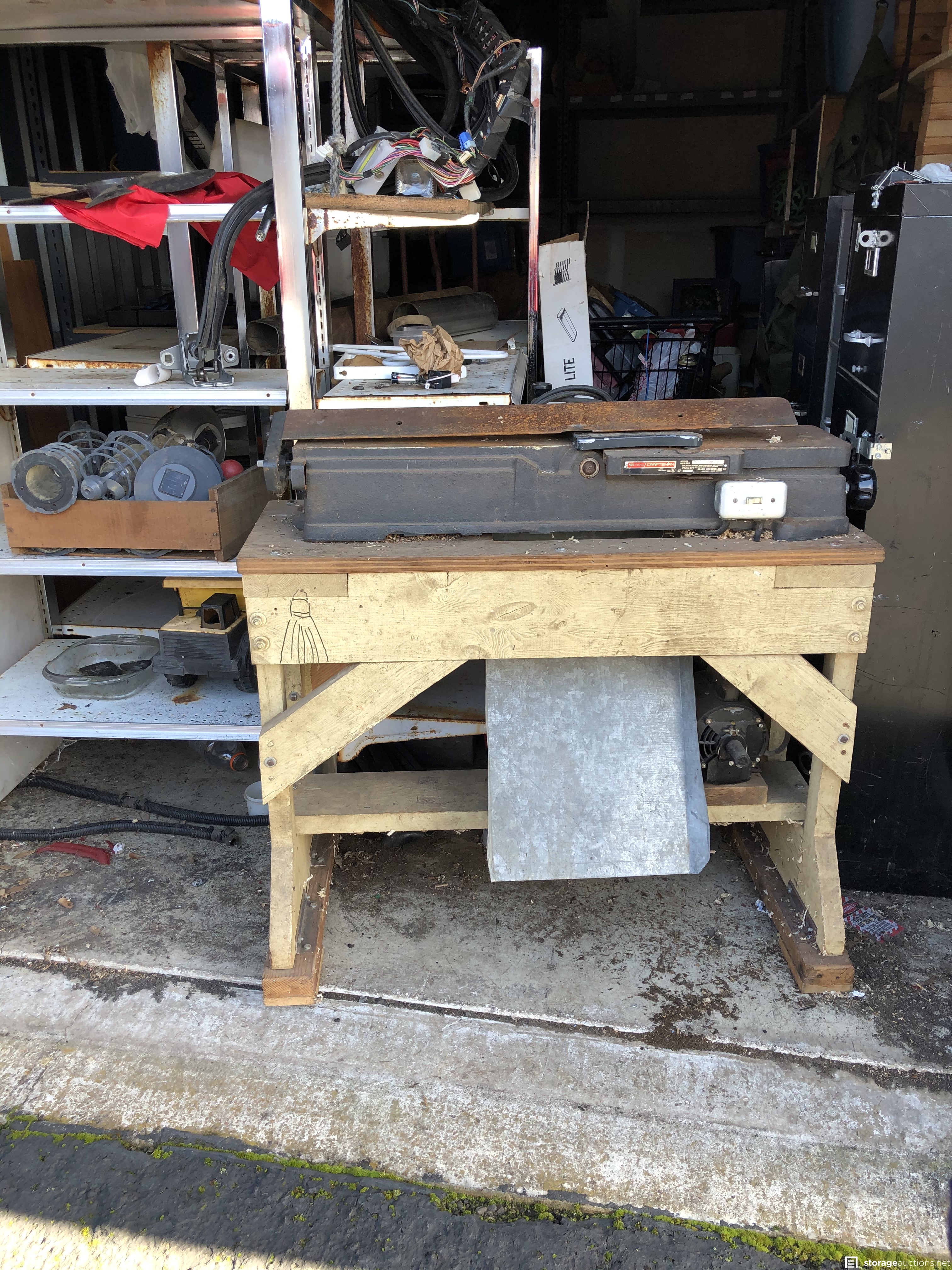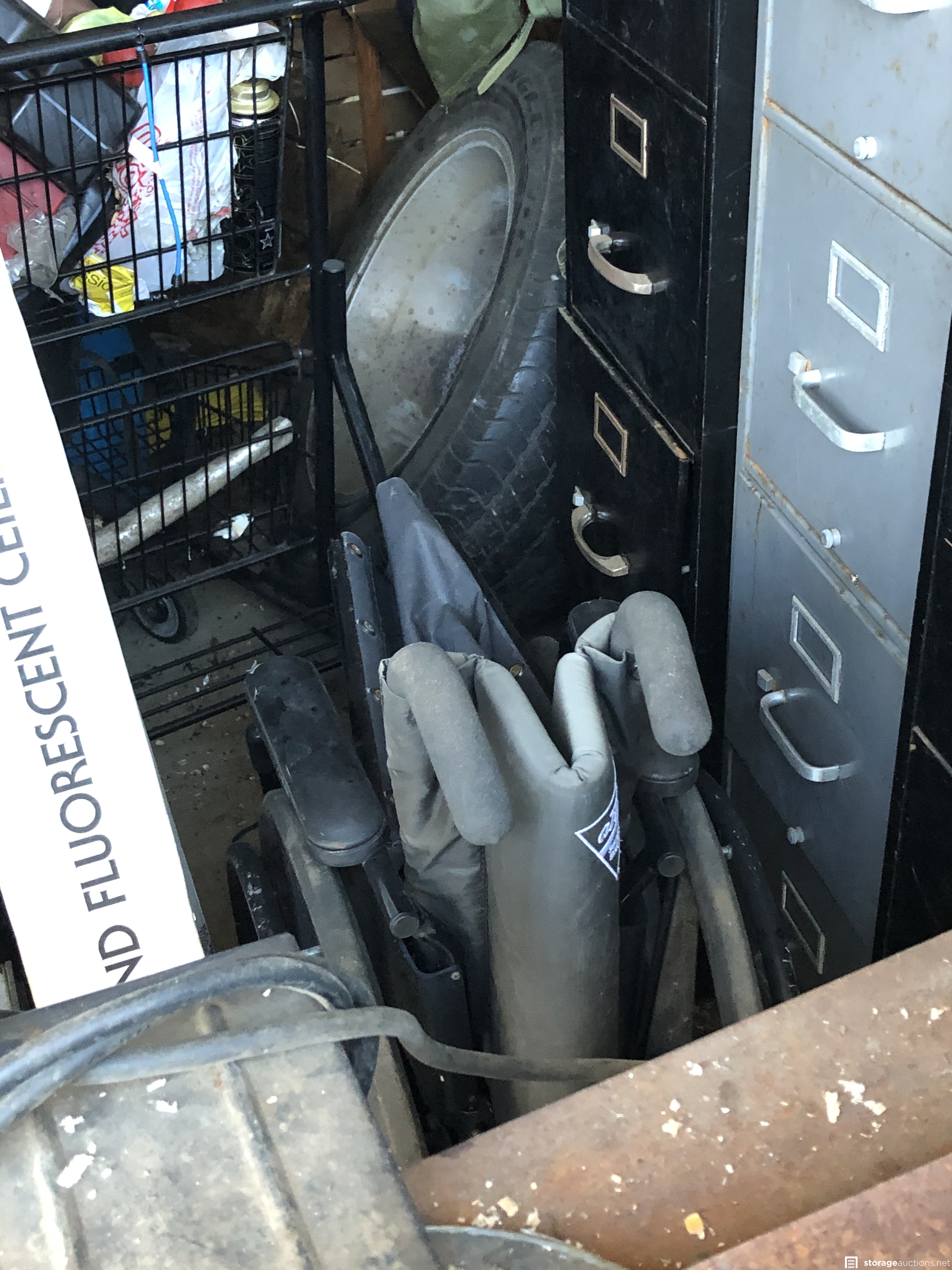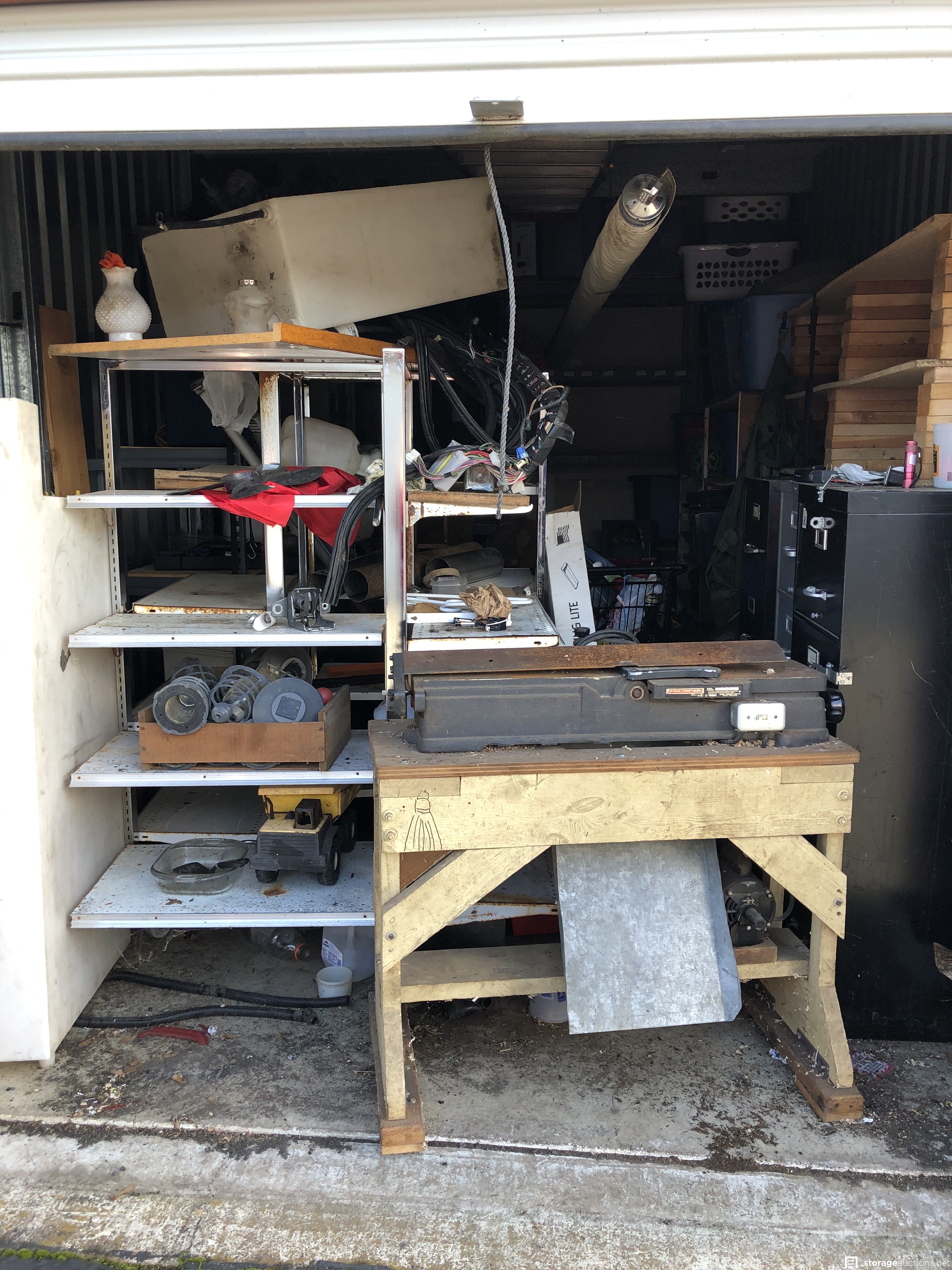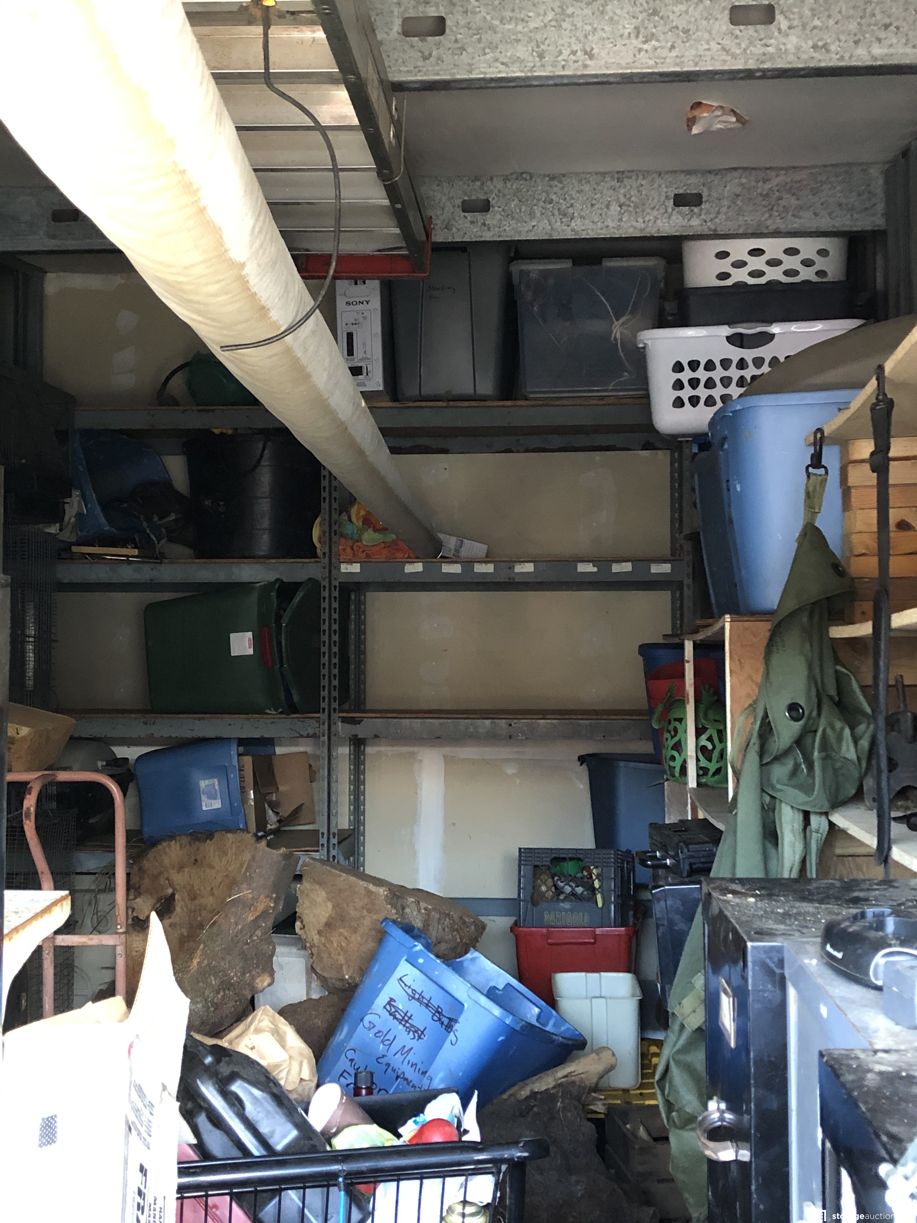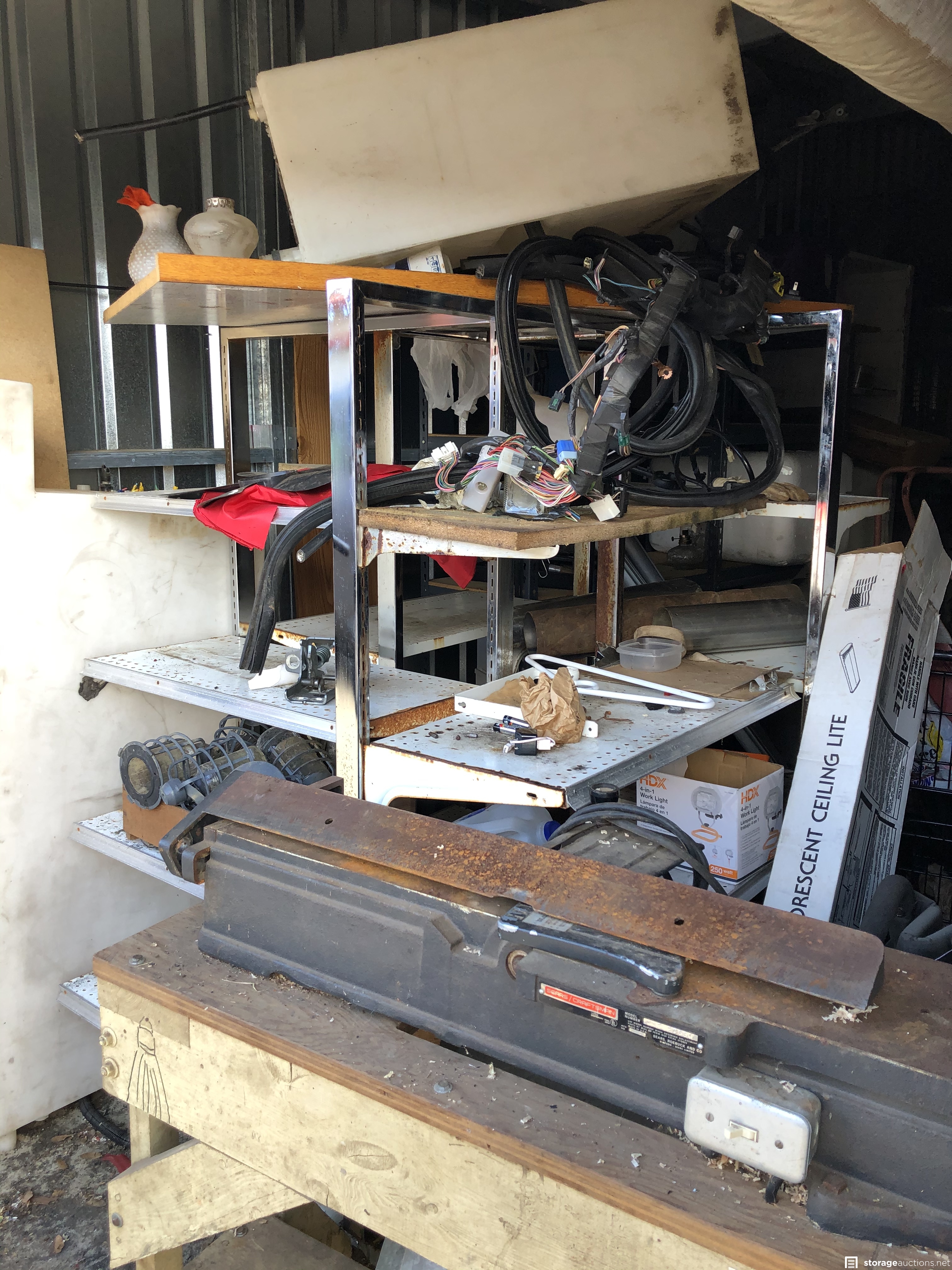 There appears to be: metal shelving, car parts, file cabinets, shopping cart, wheel chair, wood burrows, live traps, dolly, aluminum ladder, wood plainer, microwave, laundry baskets, table BBQ, totes, and other misc. items