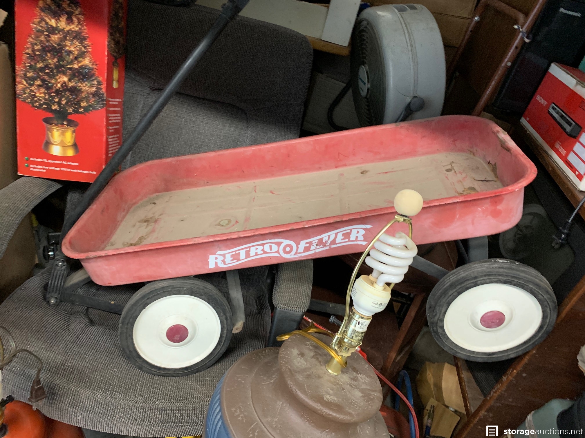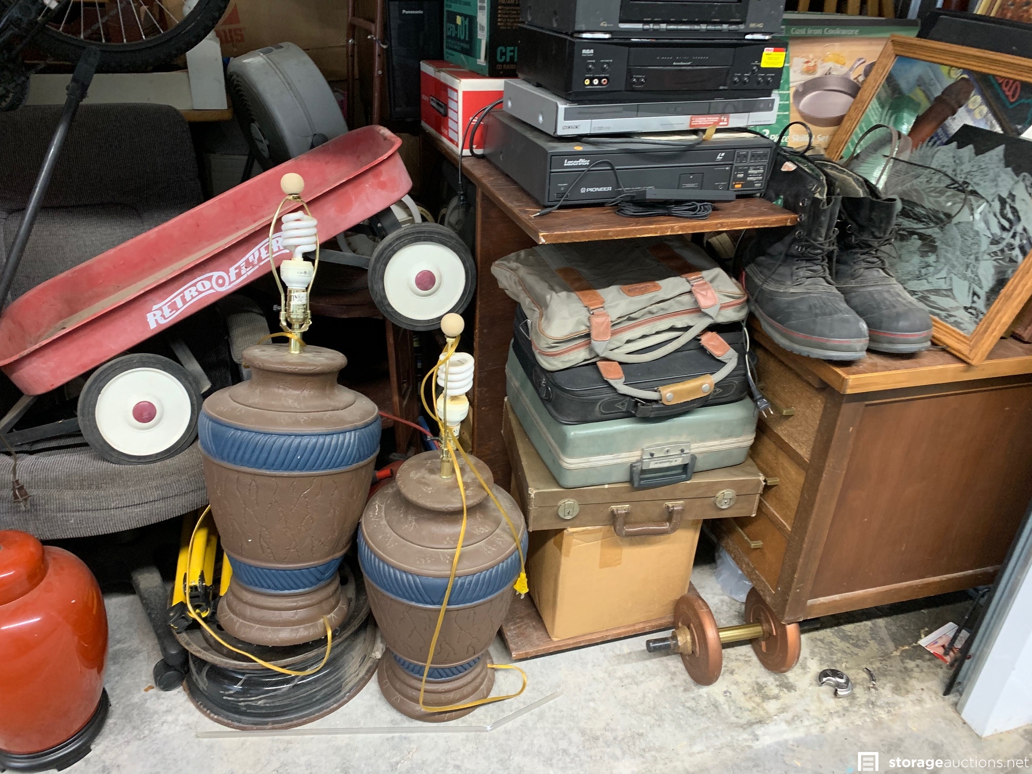 LAMPS, WAGON, BICYCLE, WOOD TABLES, COUCH, STEREO EQUIPMENT, MICROWAVES, DESK, WALL ART, WOODEN CHAIRS