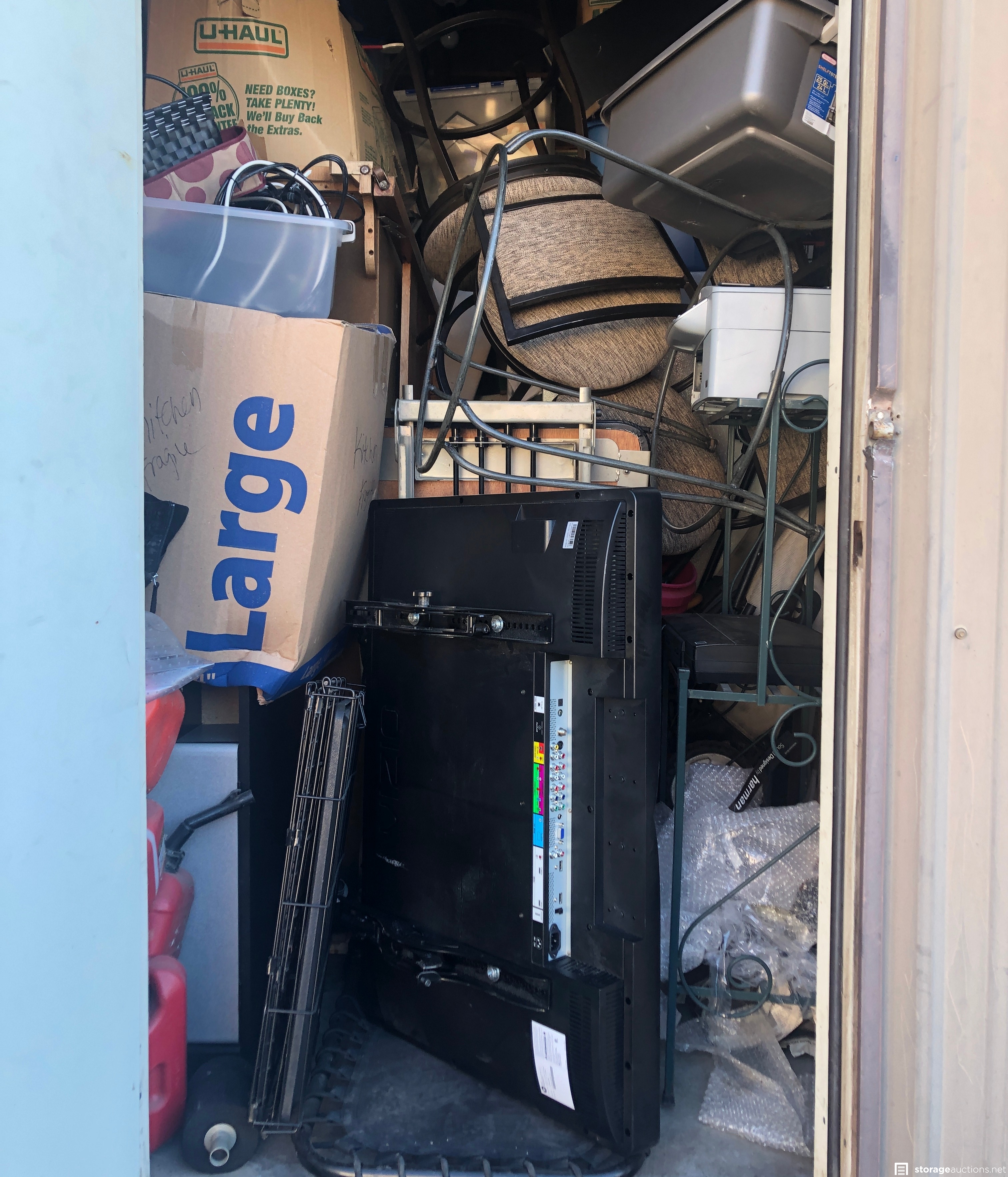 This unit has been inventoried from the entrance. Items that can be visibly seen, but not guaranteed include the following: television, printer or fax machine, gas can, possibly a dog crate, potting shelf/rack, some type of exercise equipment, 4 barstools, desk, lawnmower, mattresses, horse tack, equipment and home decor.