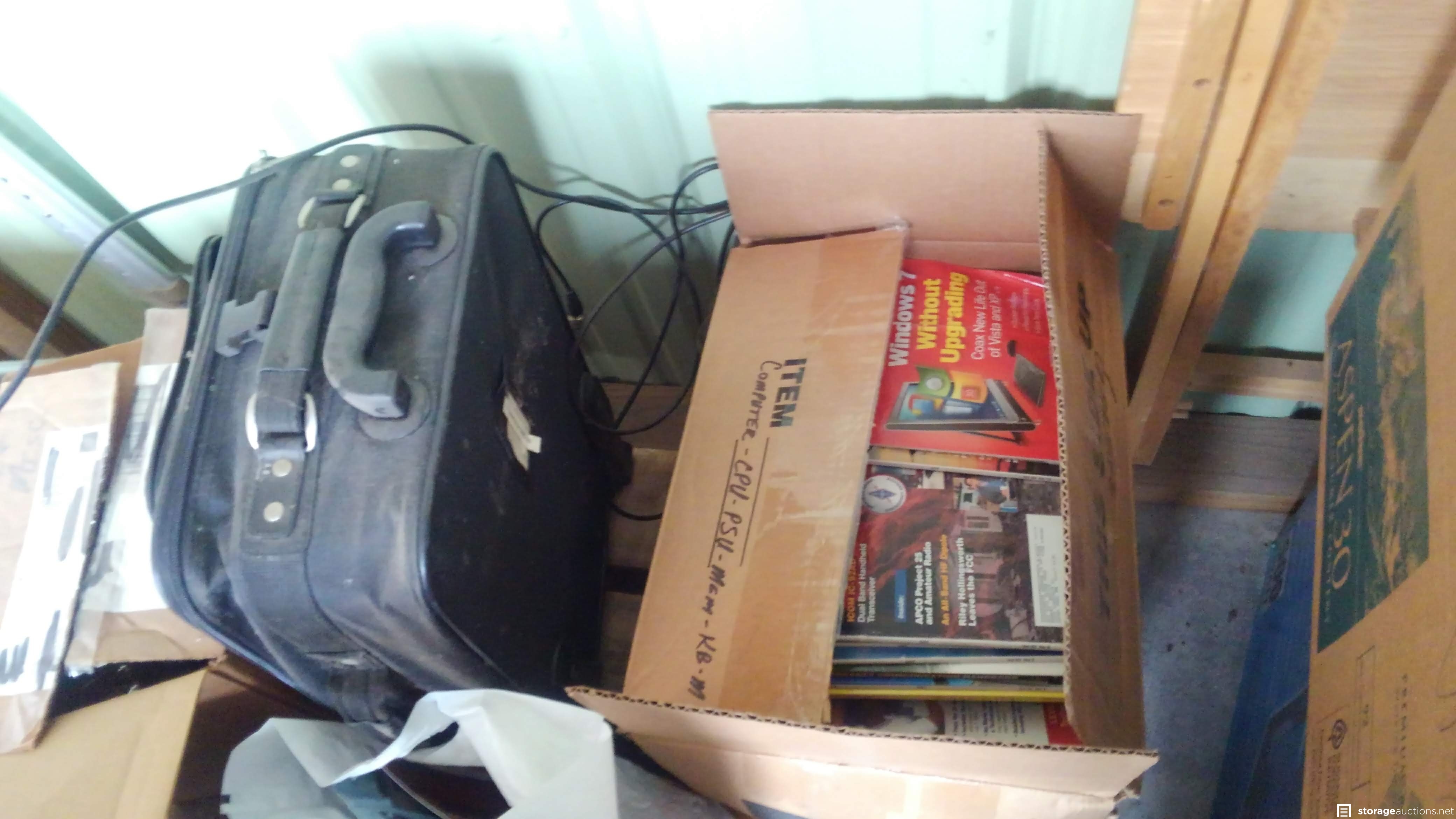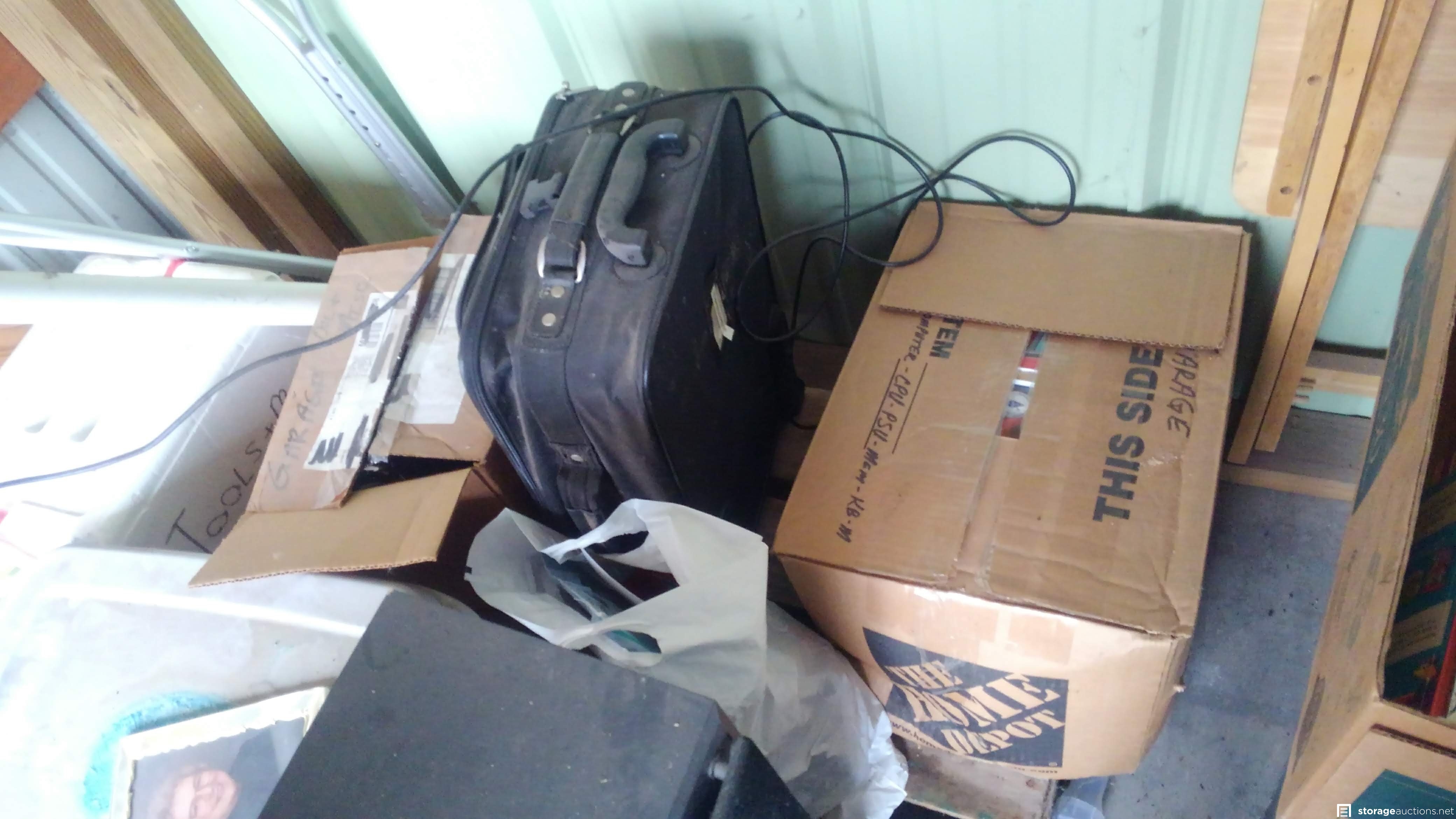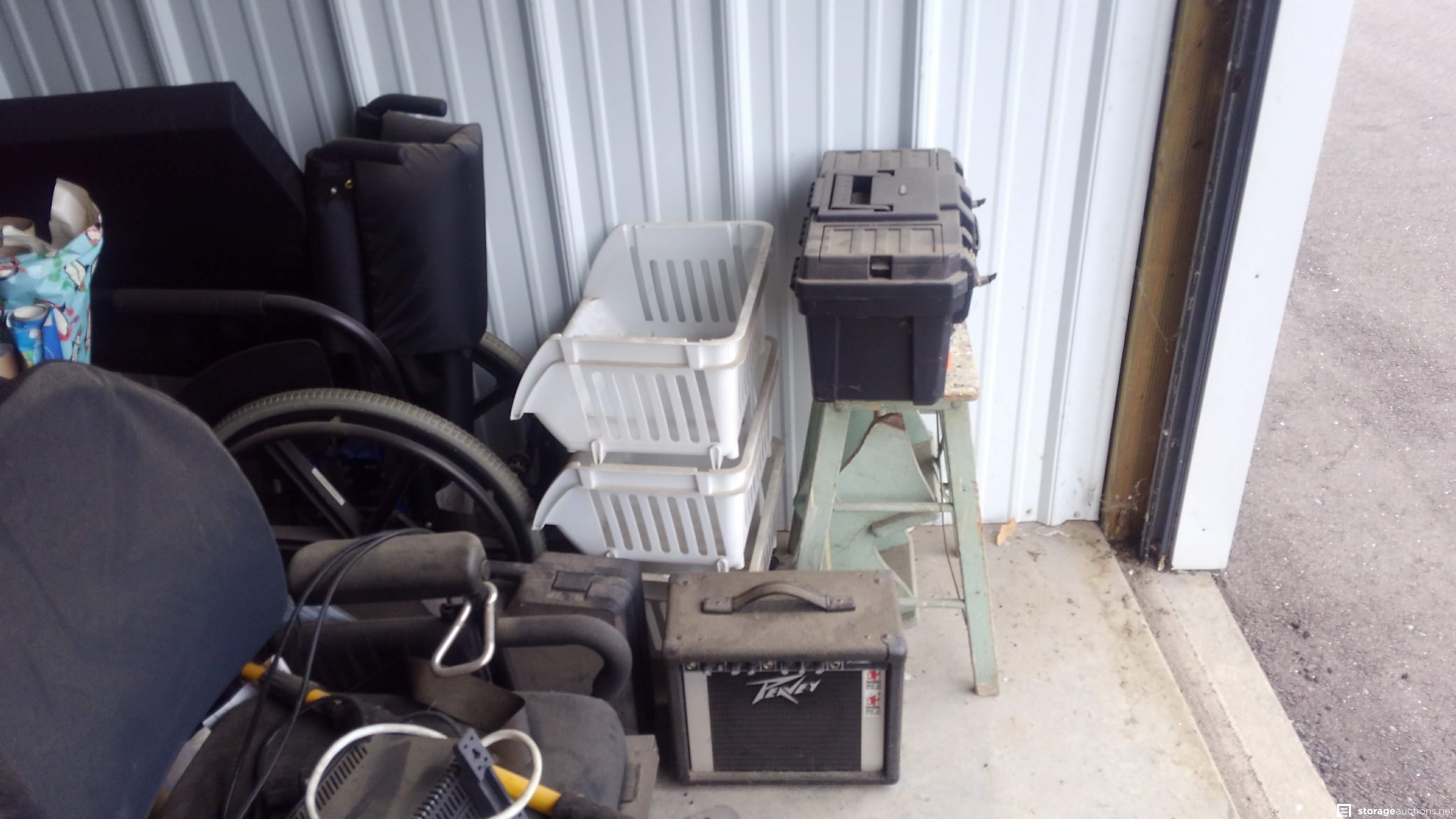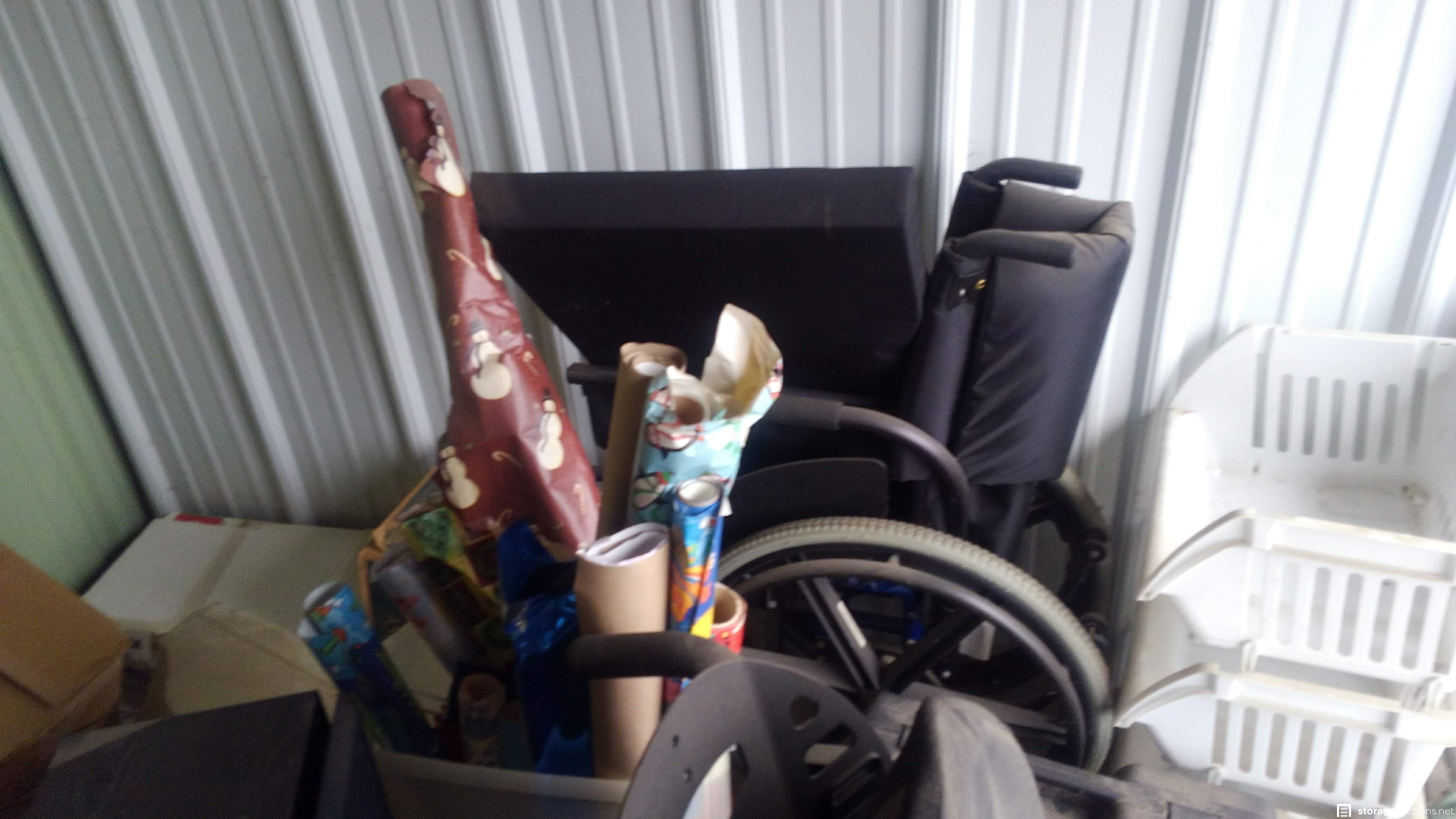 This unit appears to contain electric wheel chair, manual wheel chair, crutches, carry-on luggage, cooler, Peavey Amp, tool box,wrapping paper, storage bins, magazines, miscellaneous boxes