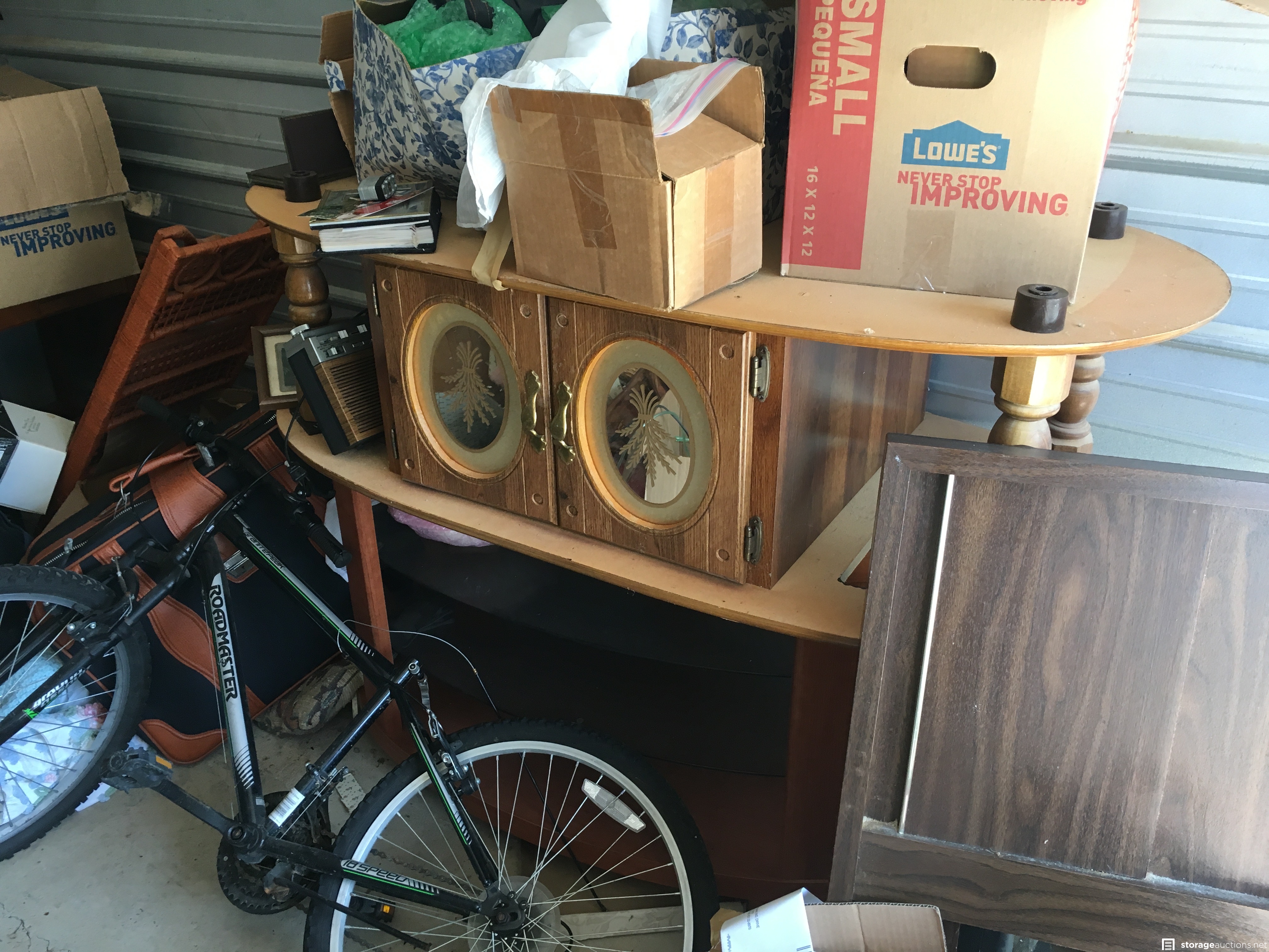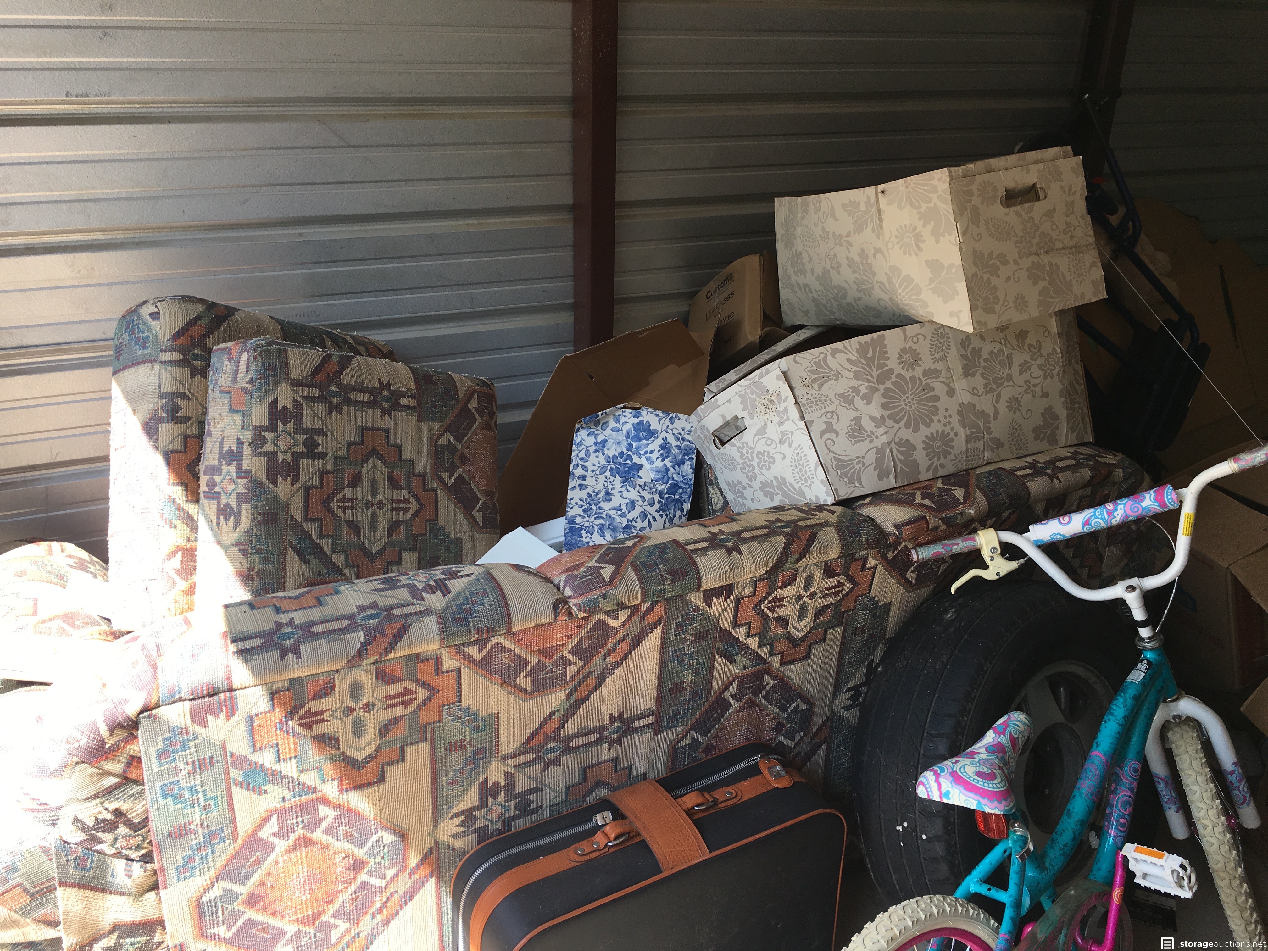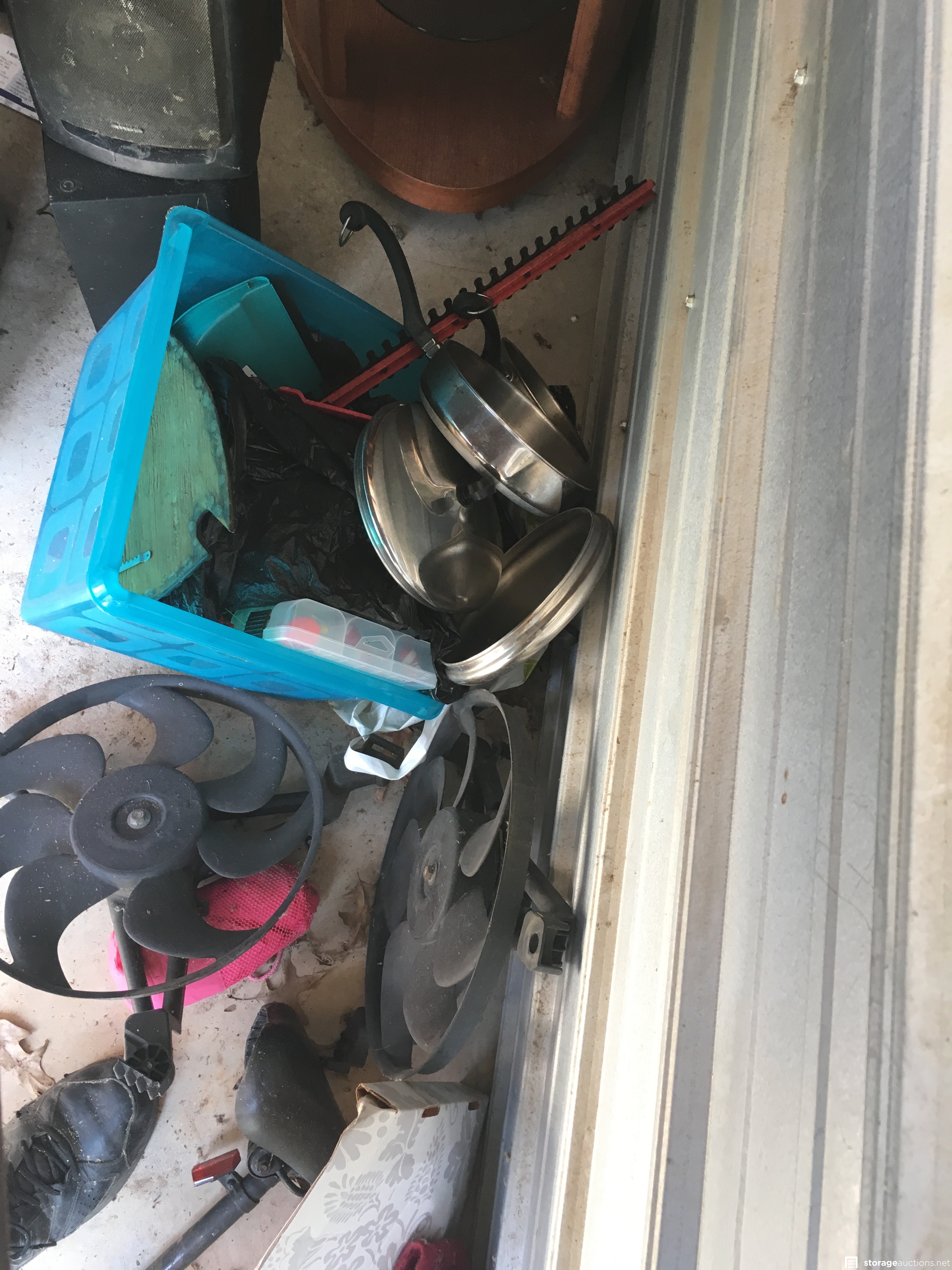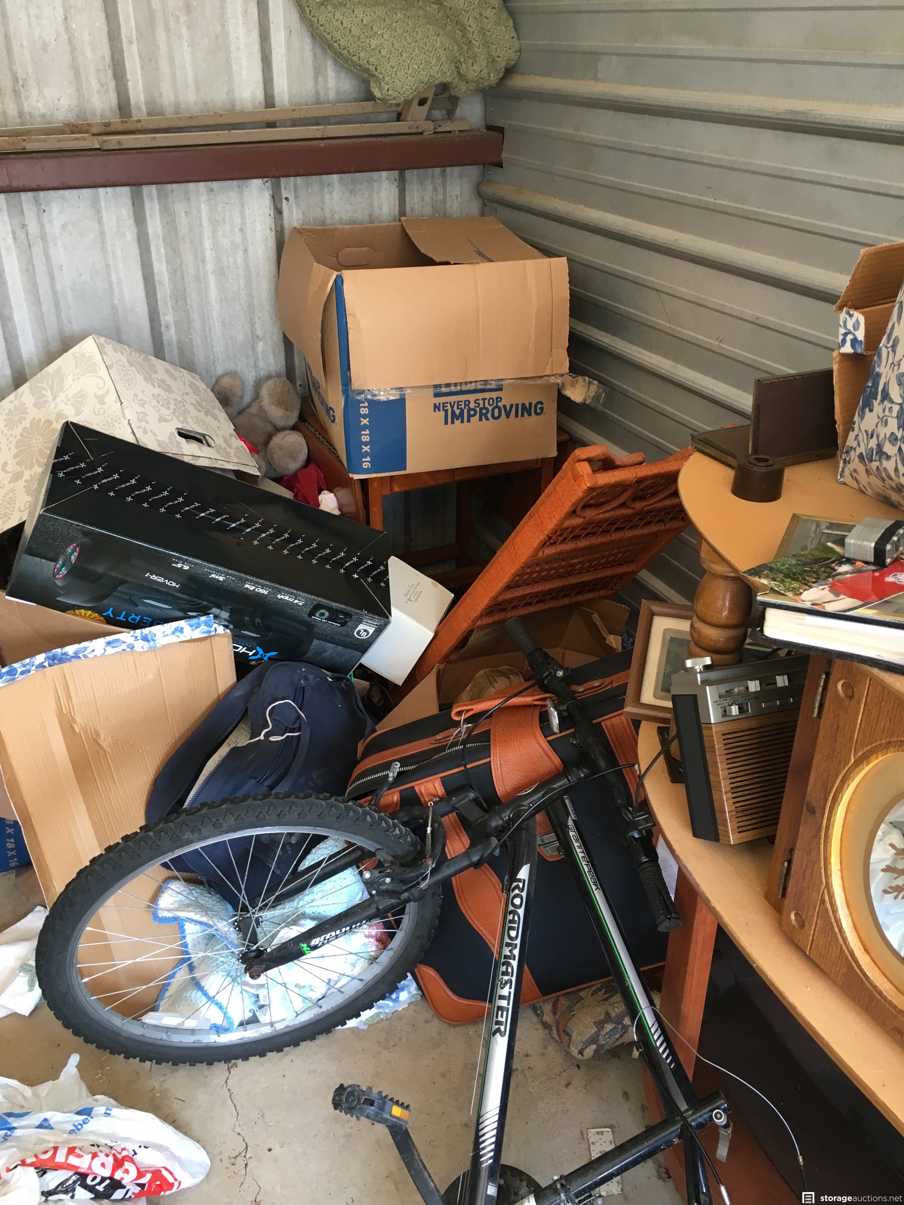 Sofa, bicycles (3), Wheel chair, lamp, bed frame, suitcases, stuffed toys, radio, table, kitchen pans, tackle box, hedge trimmer, car tire,