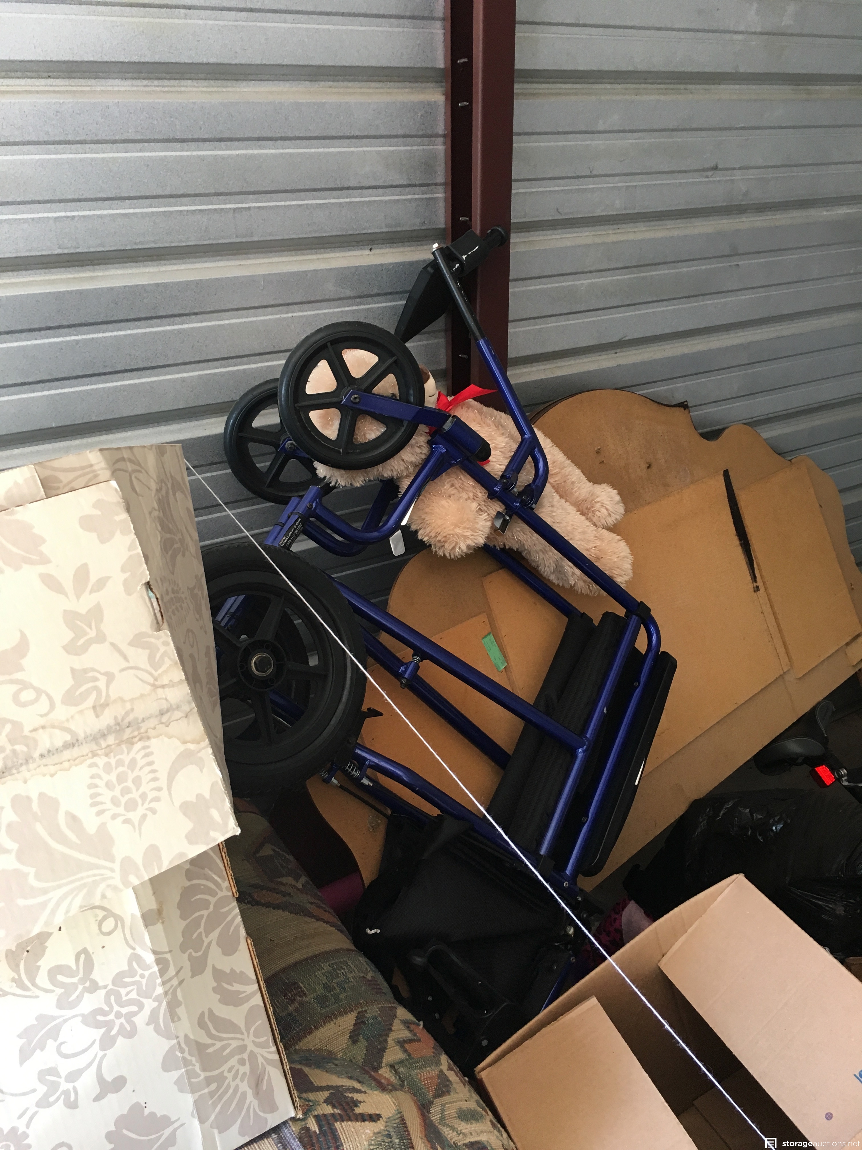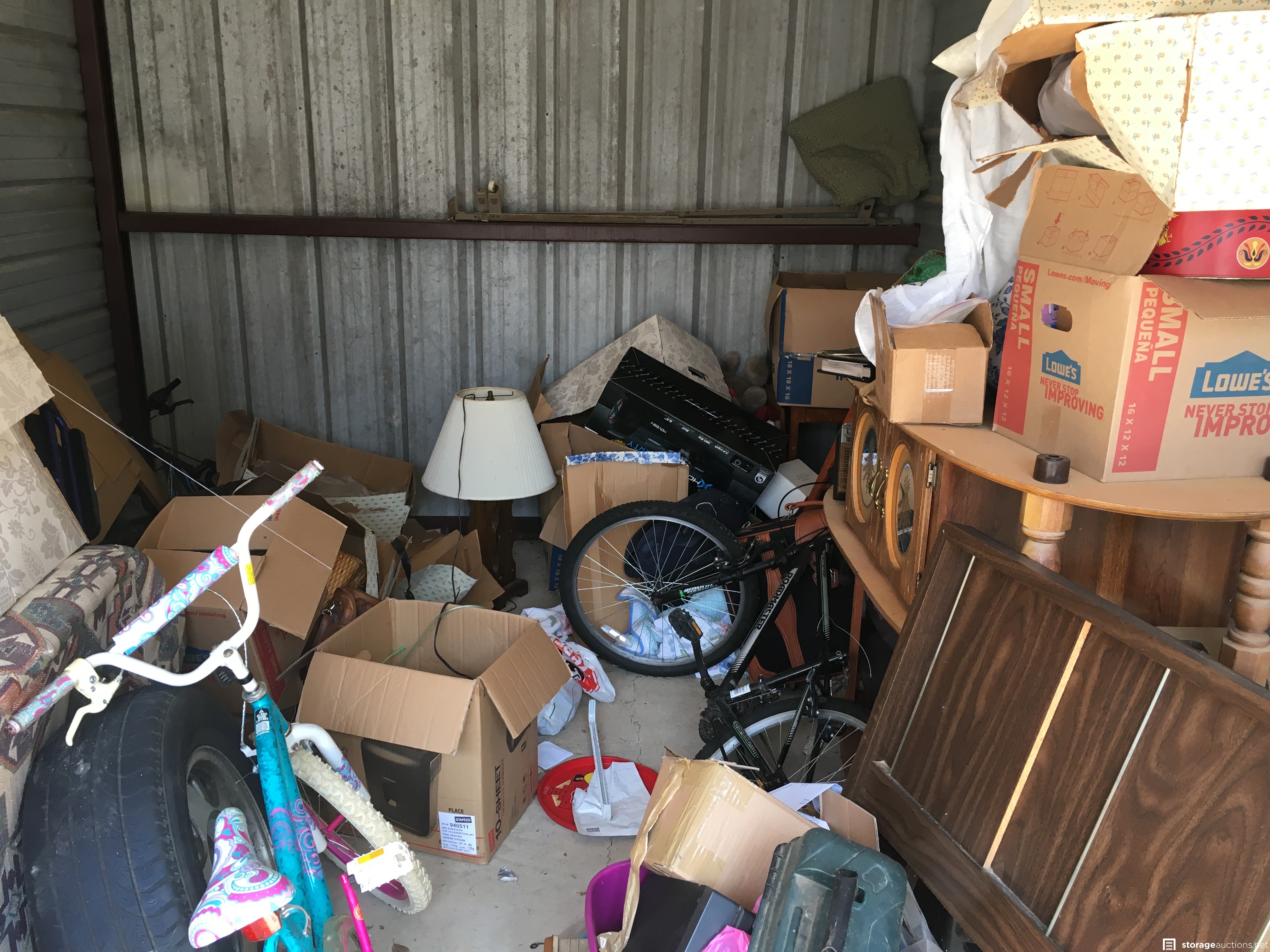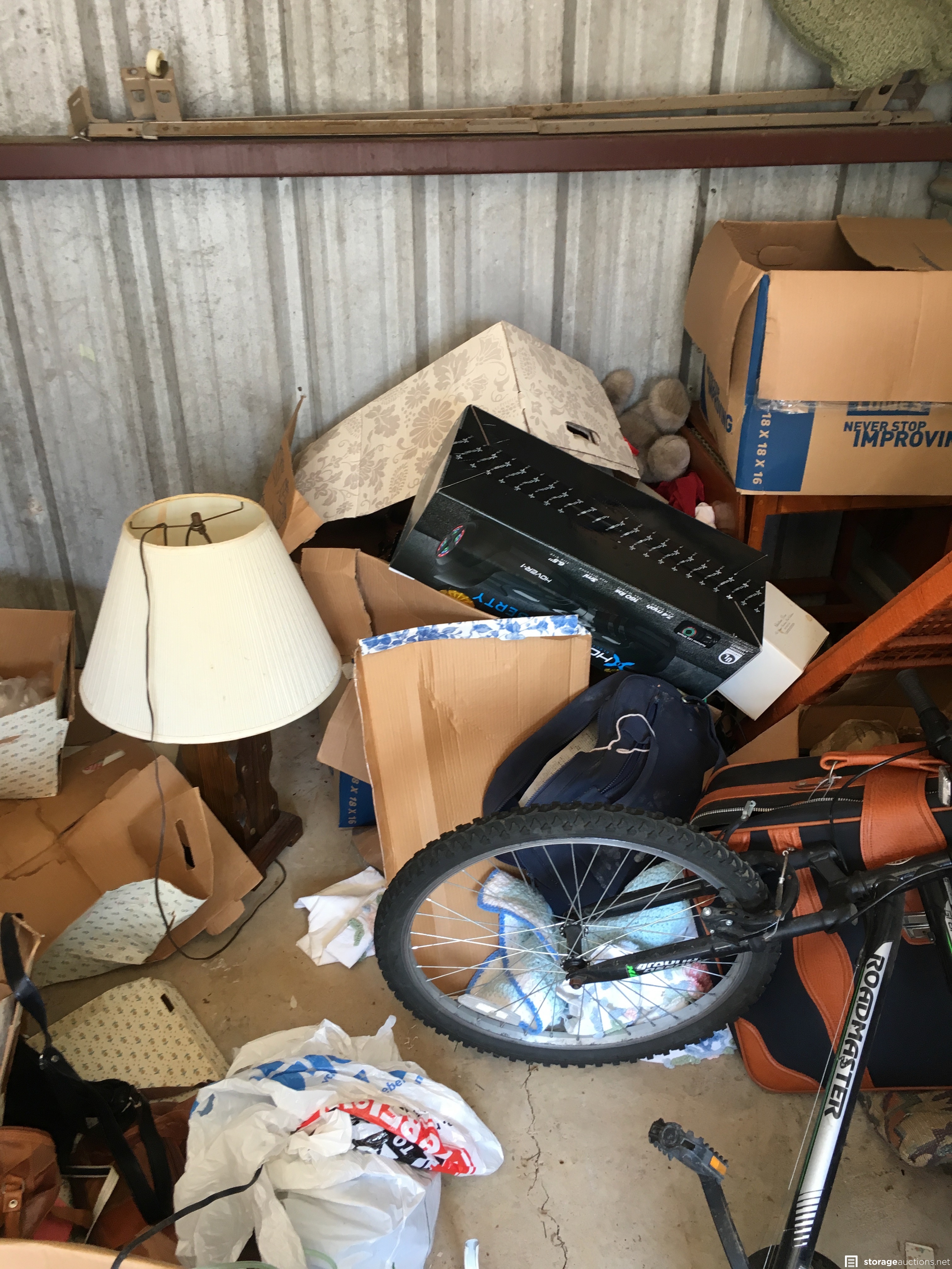 Sofa, bicycles (3), Wheel chair, lamp, bed frame, suitcases, stuffed toys, radio, table, kitchen pans, tackle box, hedge trimmer, car tire,