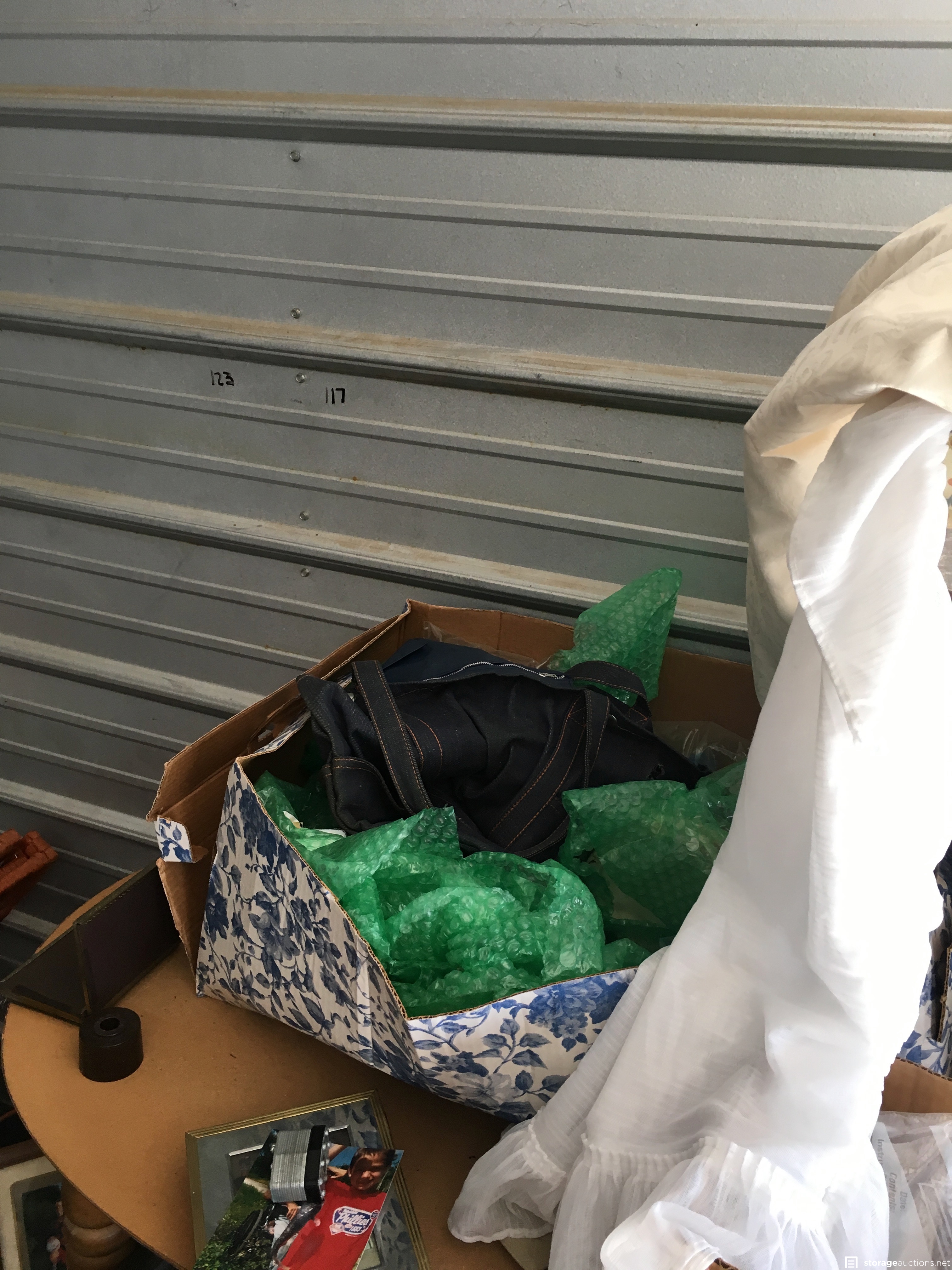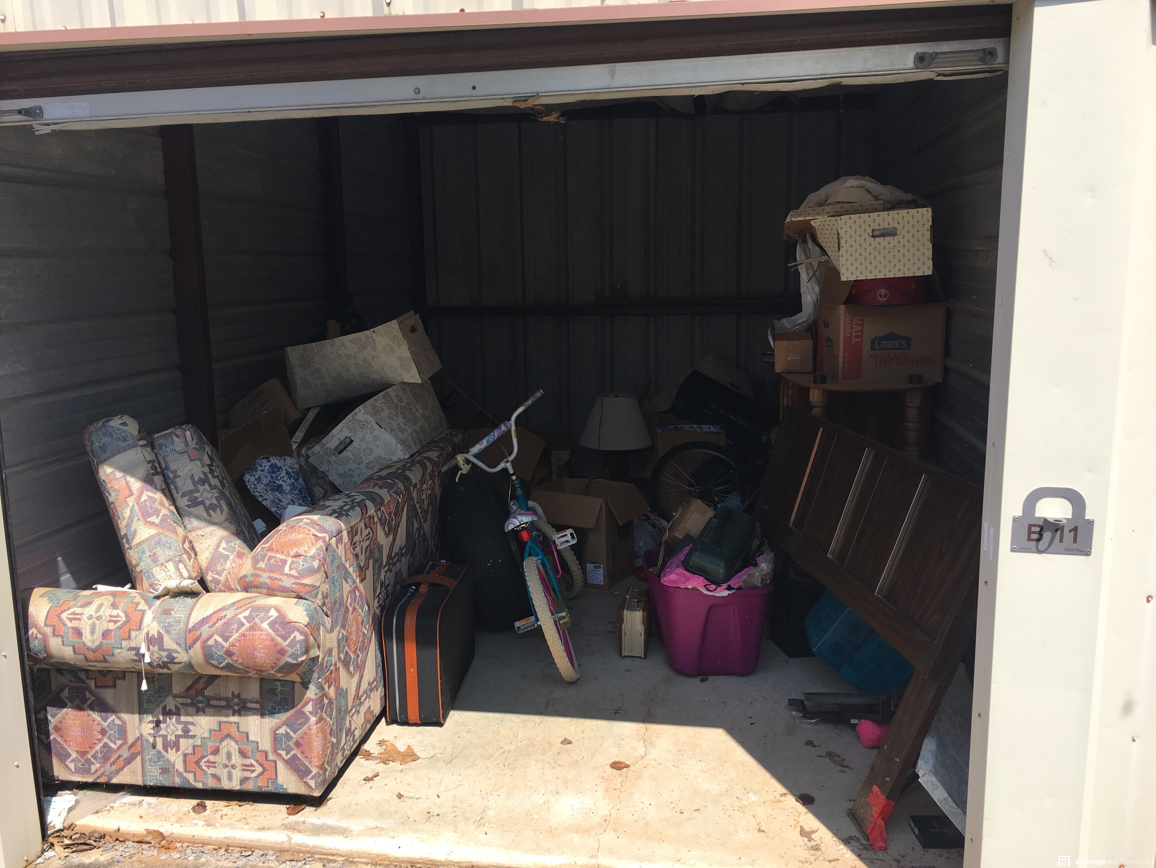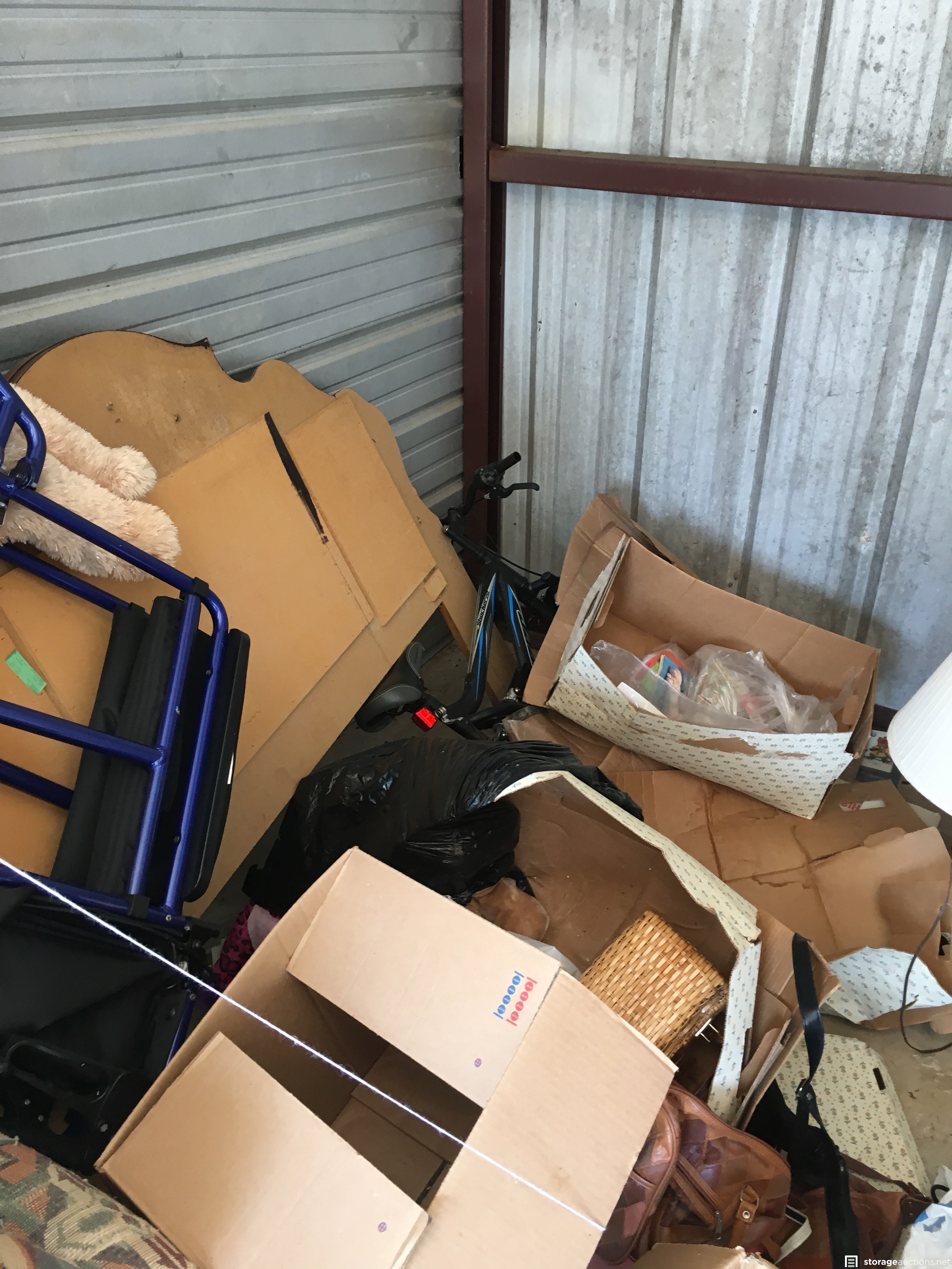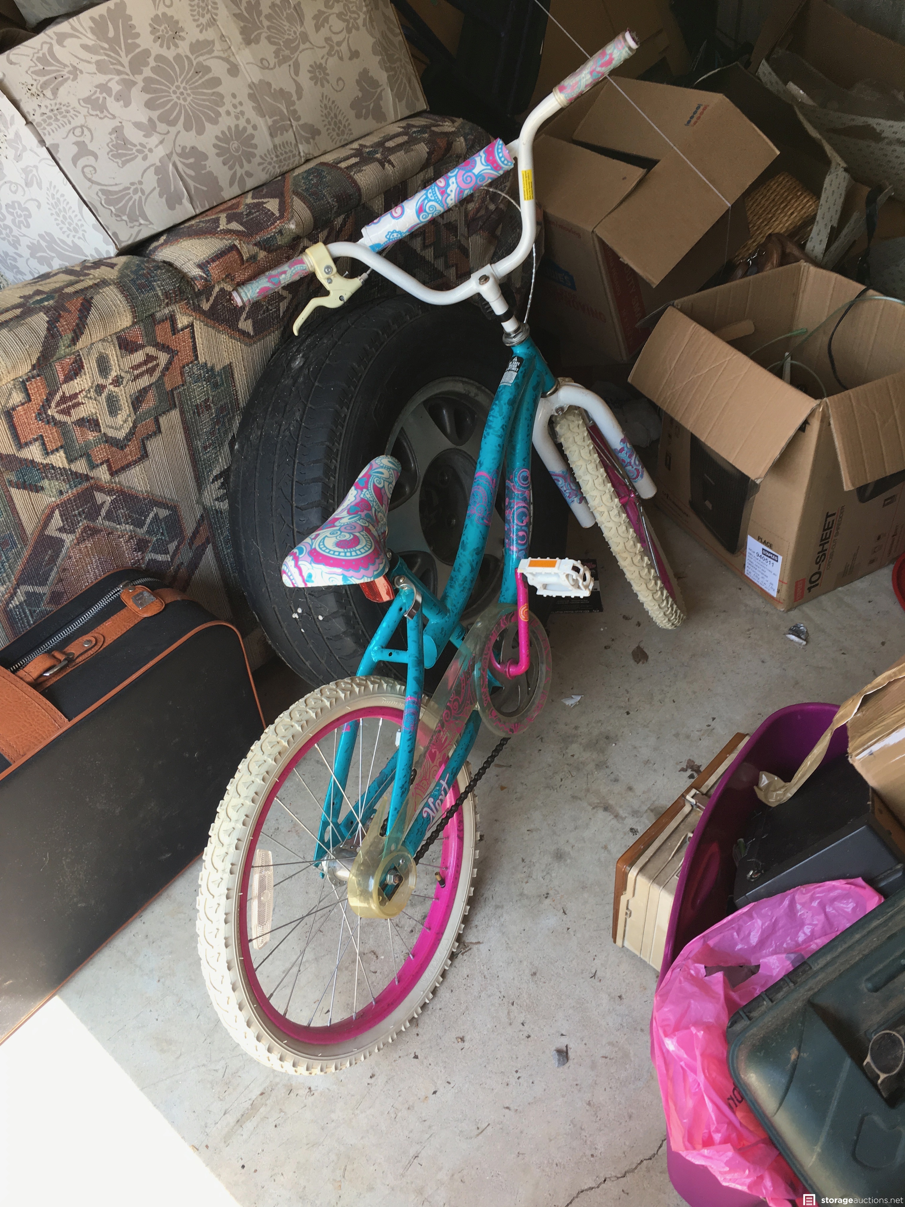 Sofa, bicycles (3), Wheel chair, lamp, bed frame, suitcases, stuffed toys, radio, table, kitchen pans, tackle box, hedge trimmer, car tire,