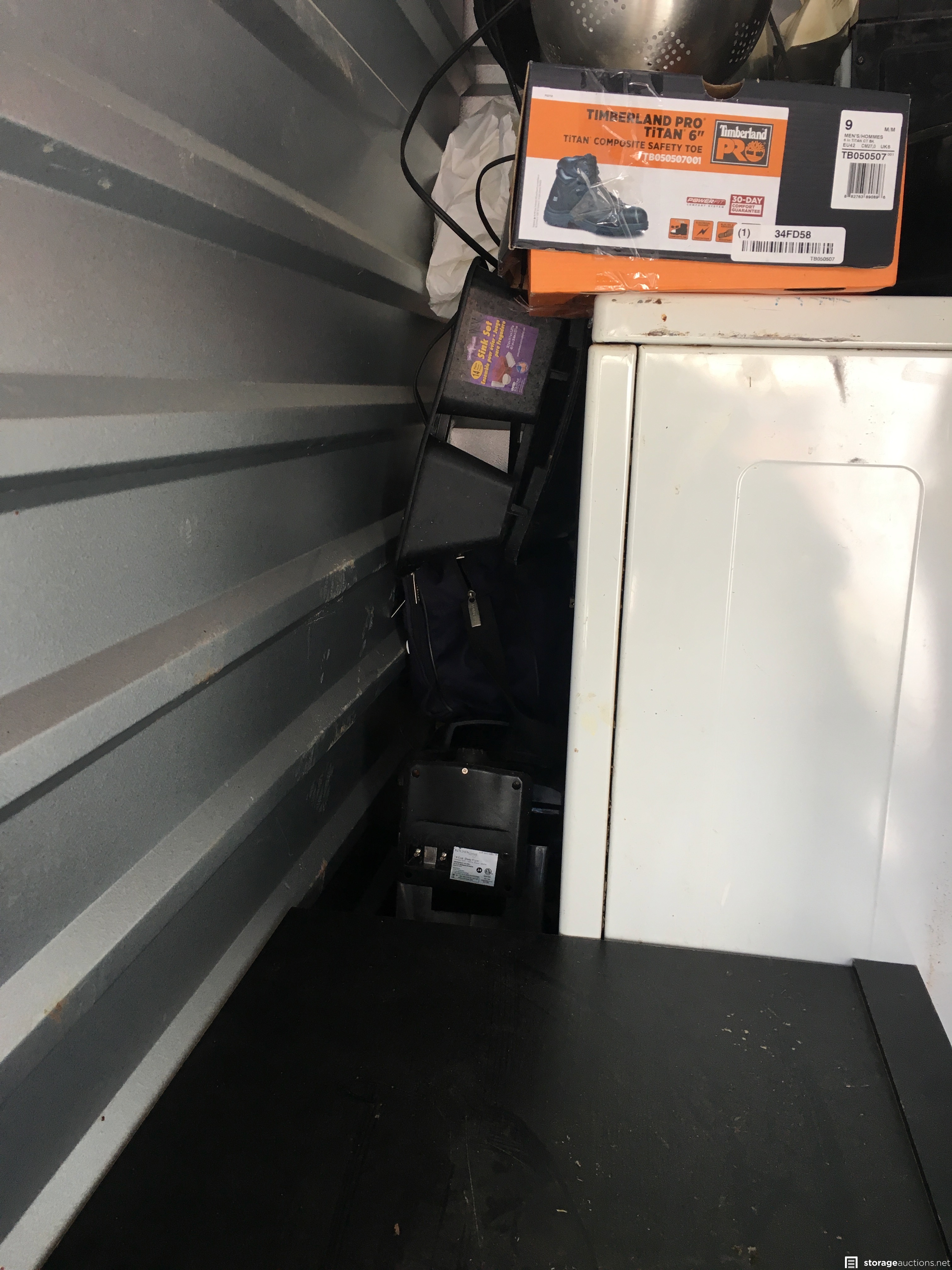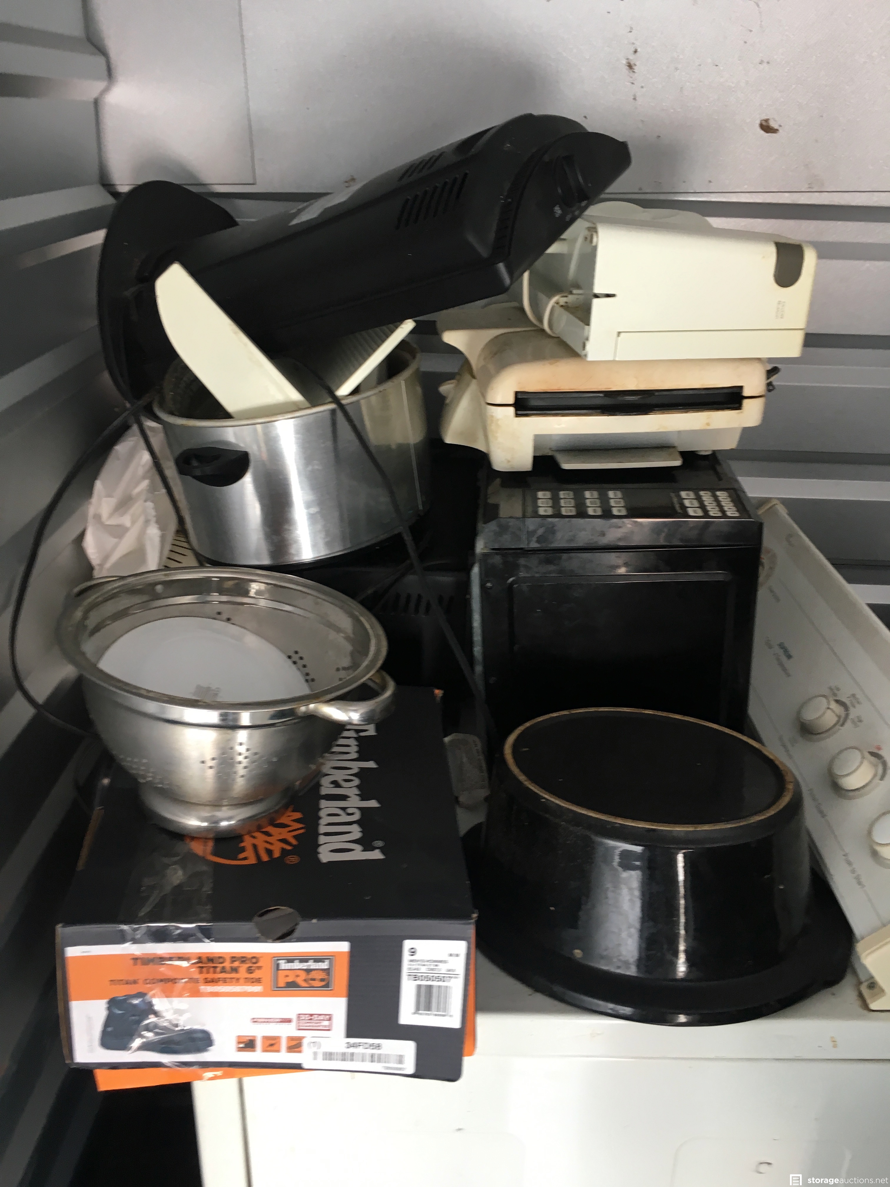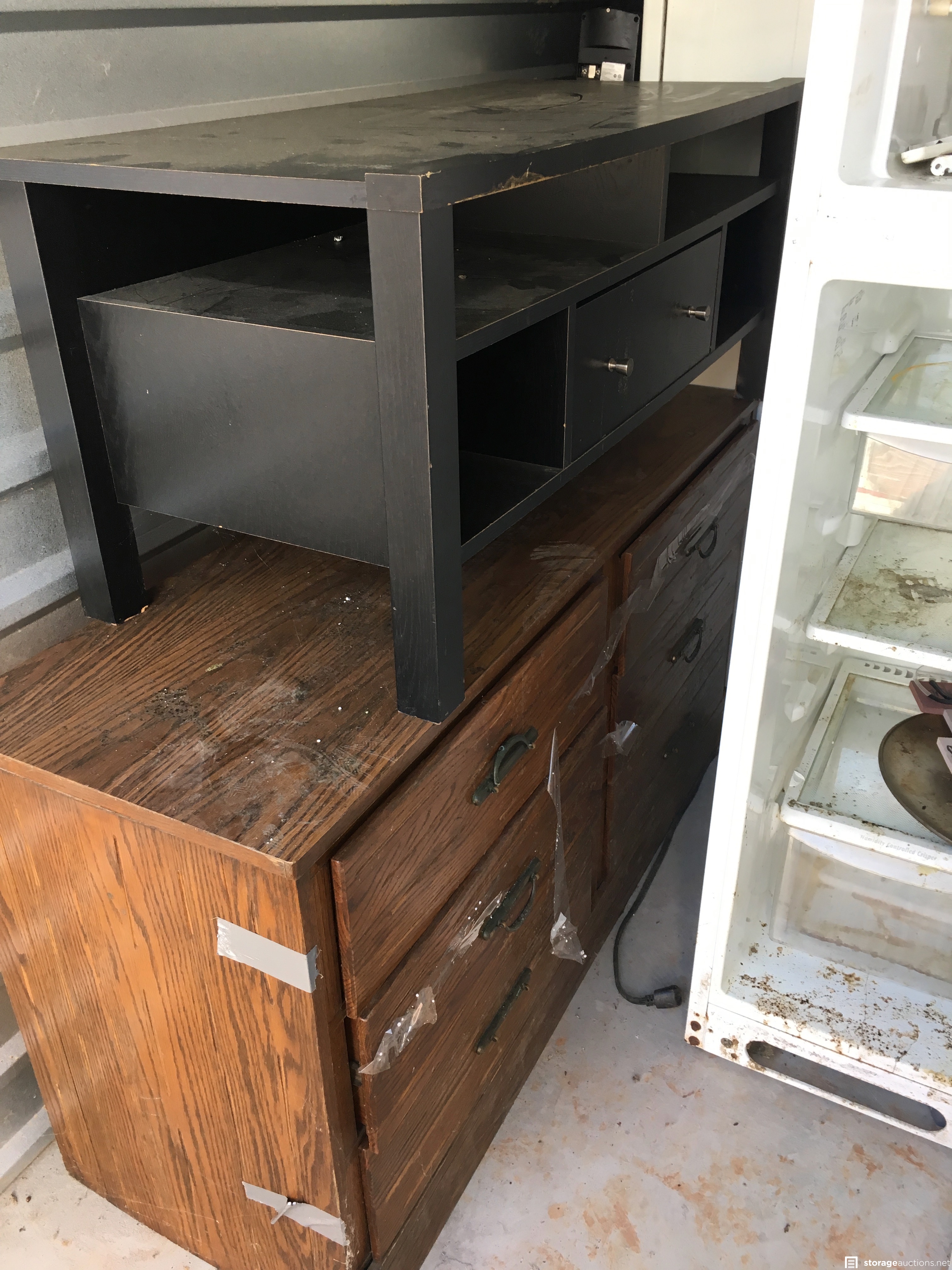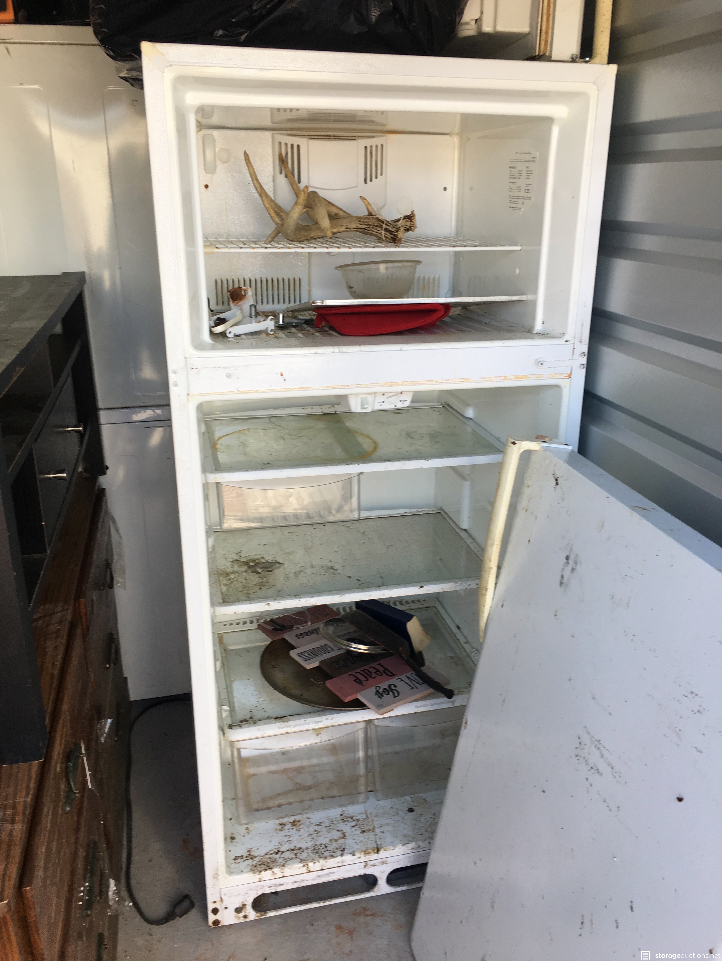 Chest of drawers, TV stand, Frig, Antlers, Deep Fryer, Microwave, griddle (George Foreman?), dehydrater, washer, dryer, misc