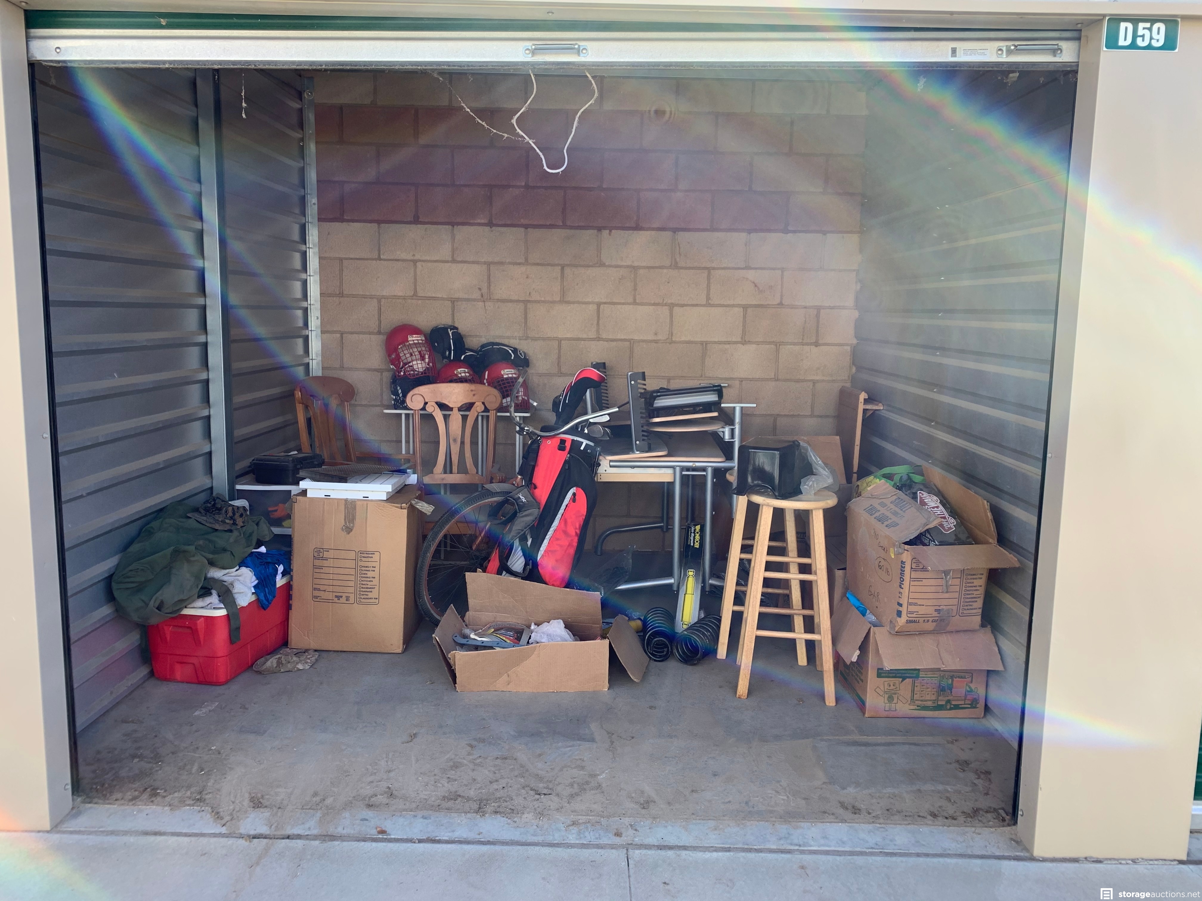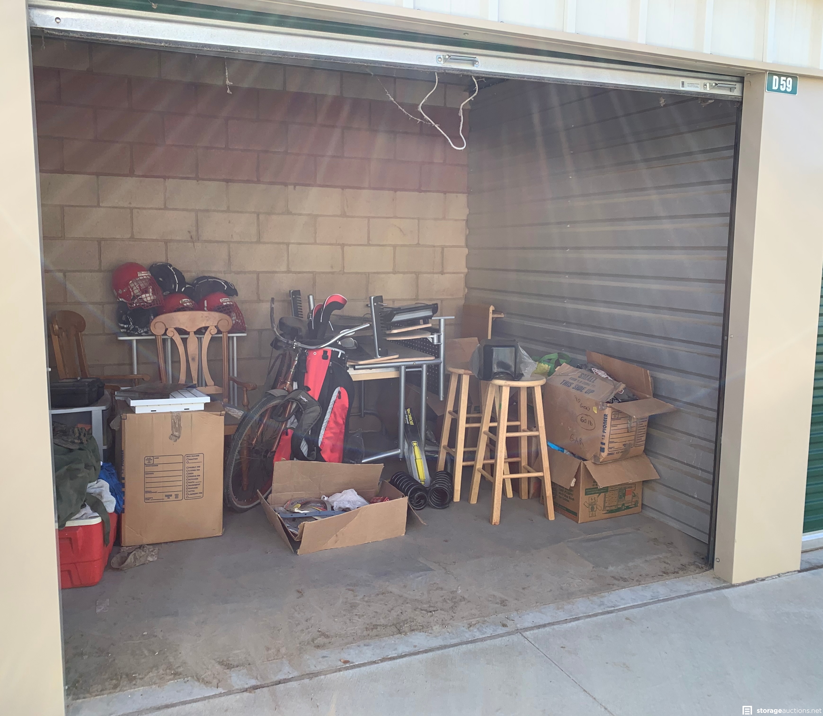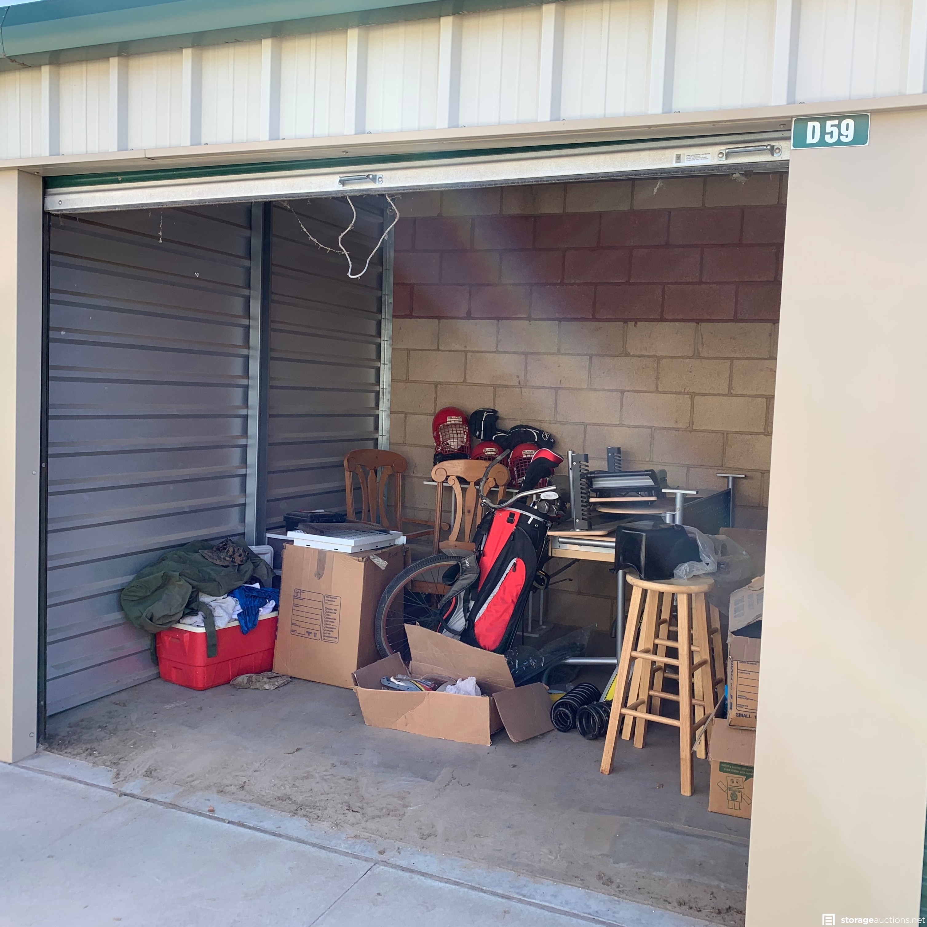 Additional Terms: **NOTICE - Defaulted tenant has legal right to cure account, thus cancelling the auction, up until cash payment is received from the winning bidder.** Buyers must be 18 years old to bid and pay winning bid. Winning bidder must pay within 48 hours in person. Cash or money order only. $100 deposit. If paying with money order, deposit must be on a separate money order. Unit must be cleaned out within 72 hours after payment. Deposit will be returned after unit is cleaned out. If unit is not cleaned out after 72 hours, unit will be considered abandoned and deposit will be kept by the storage facility. Must have a paid confirmation and valid photo ID to pick up contents of unit. All sales are final, all sales are AS IS for the entire content of unit, unless otherwise specified. Items containing personal information found with in unit must be returned to the office upon clean-out of the unit. No dumping, No pets allowed. All auction unit(s) are subject to cancellation by the storage facility.
