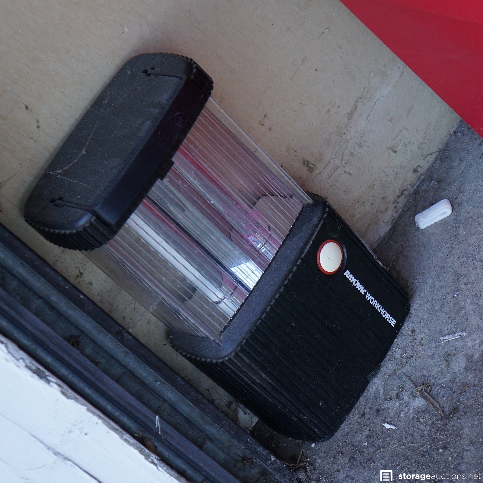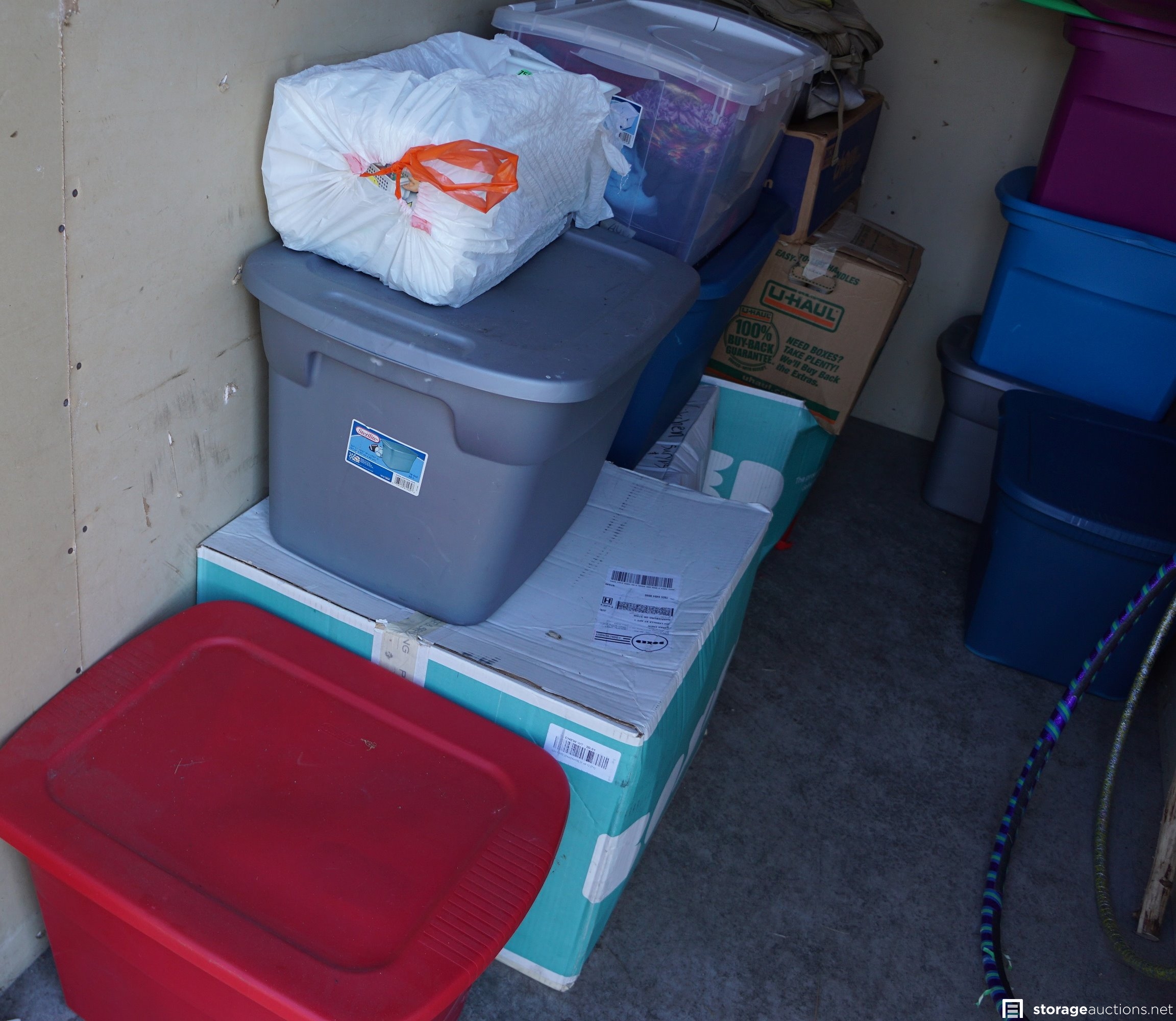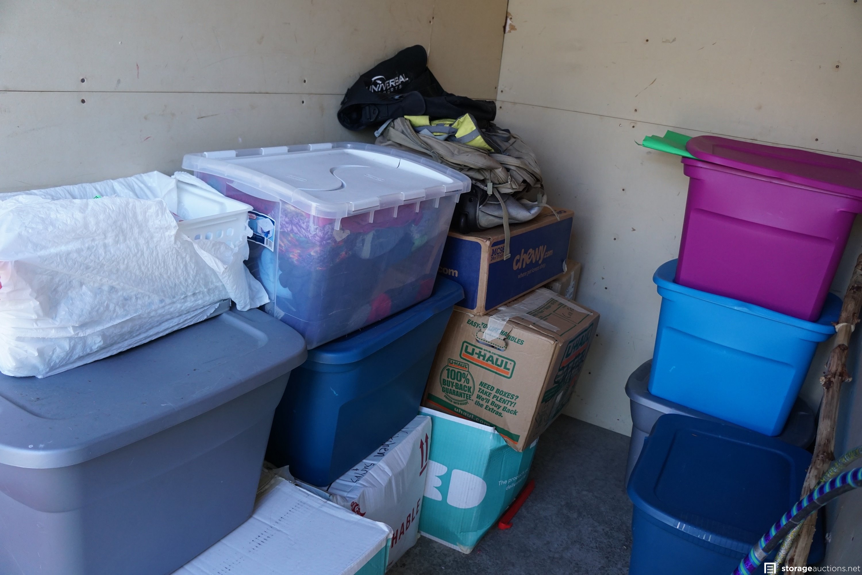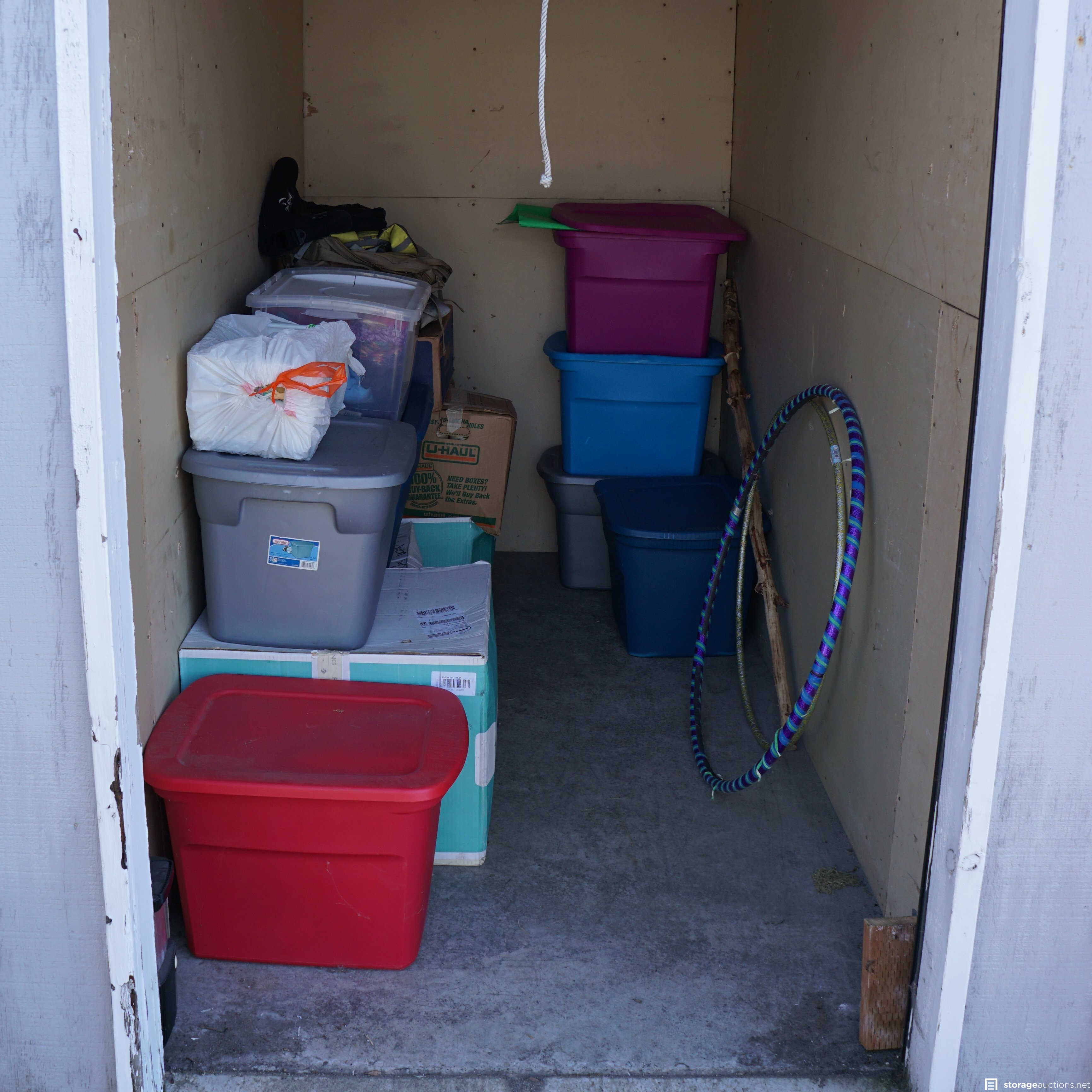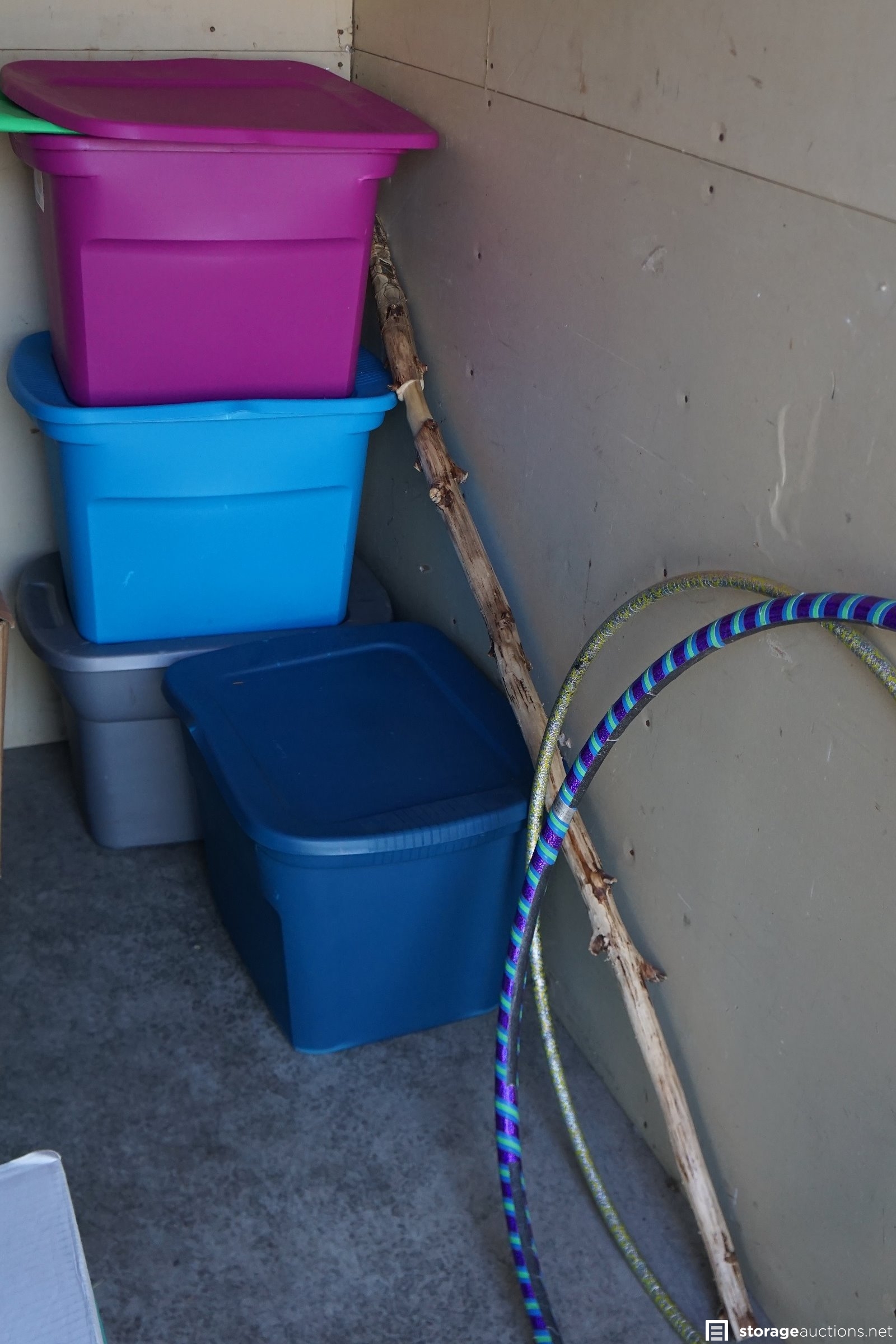 Unit appears to contain boxes and tubs, hula hoops, a battery-powered lantern, and a wooden walking stick.