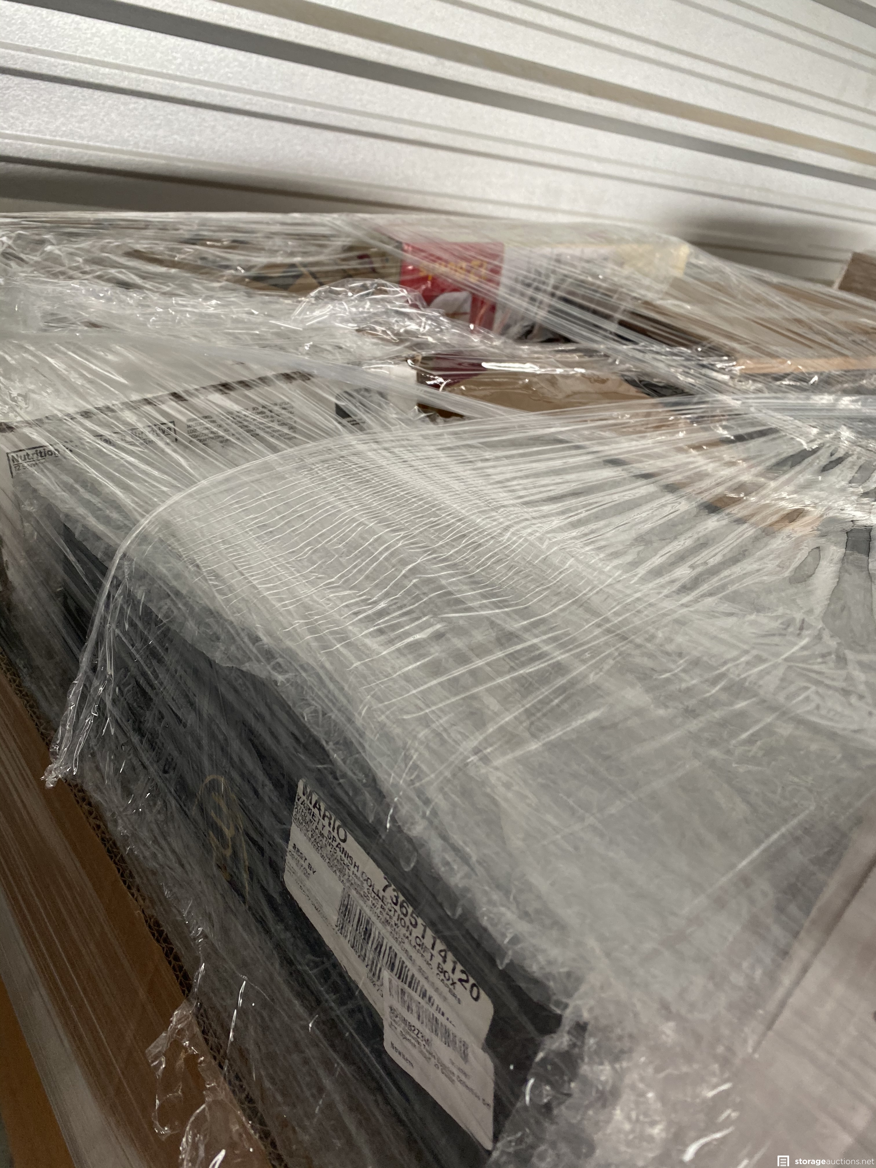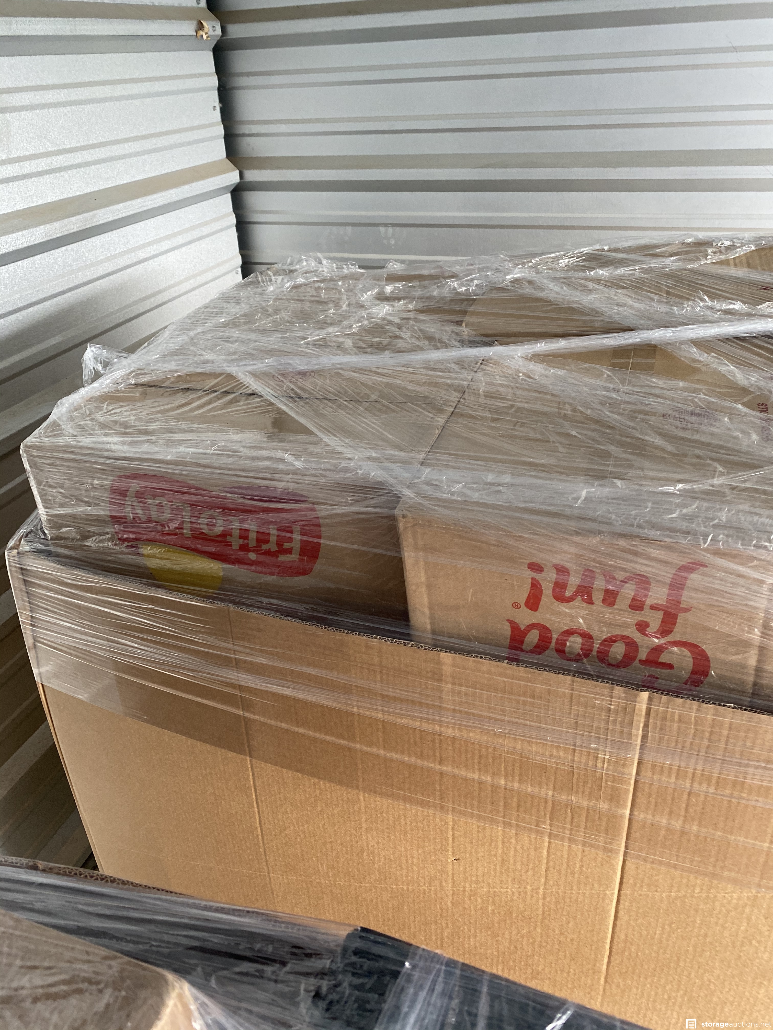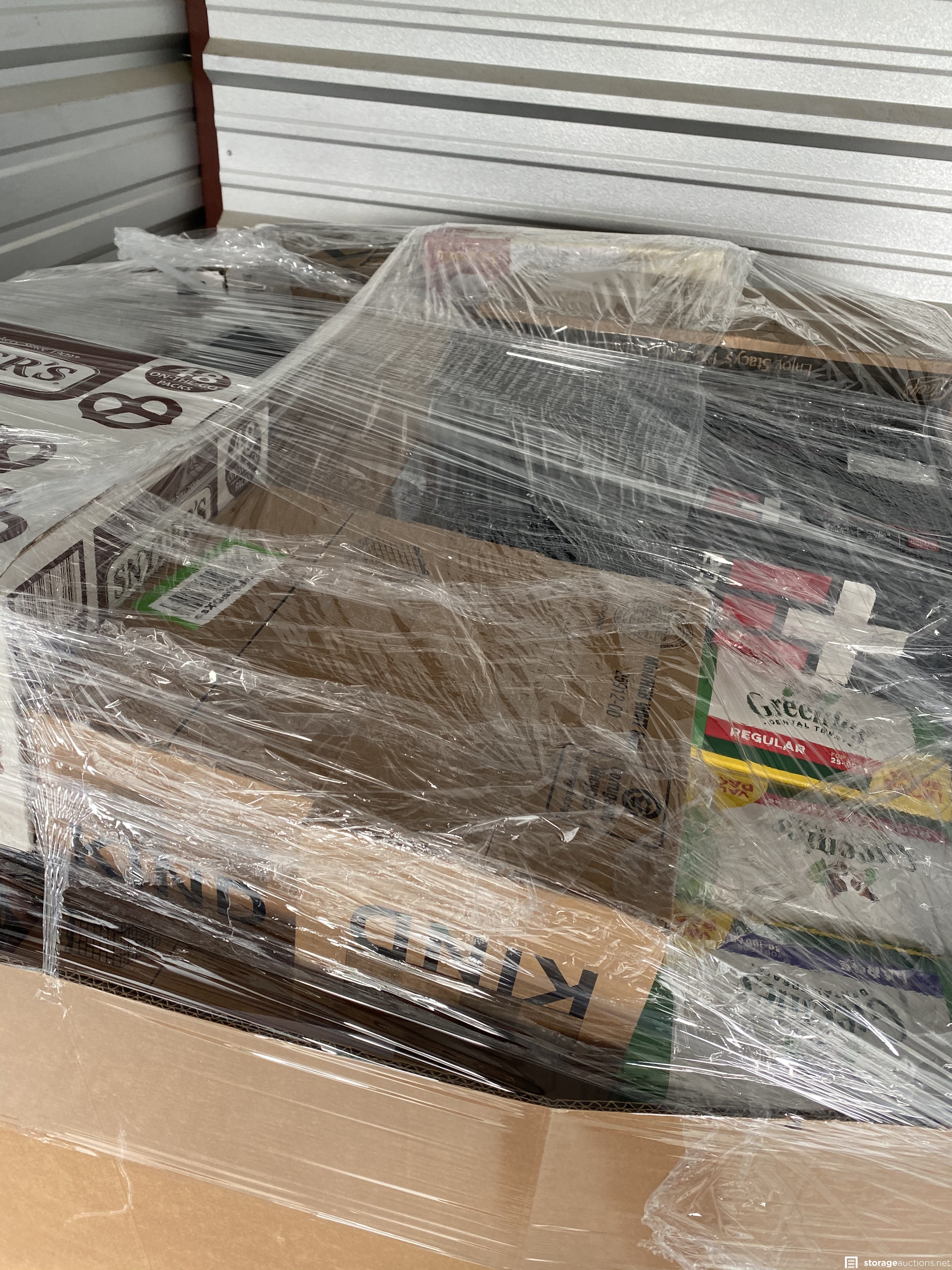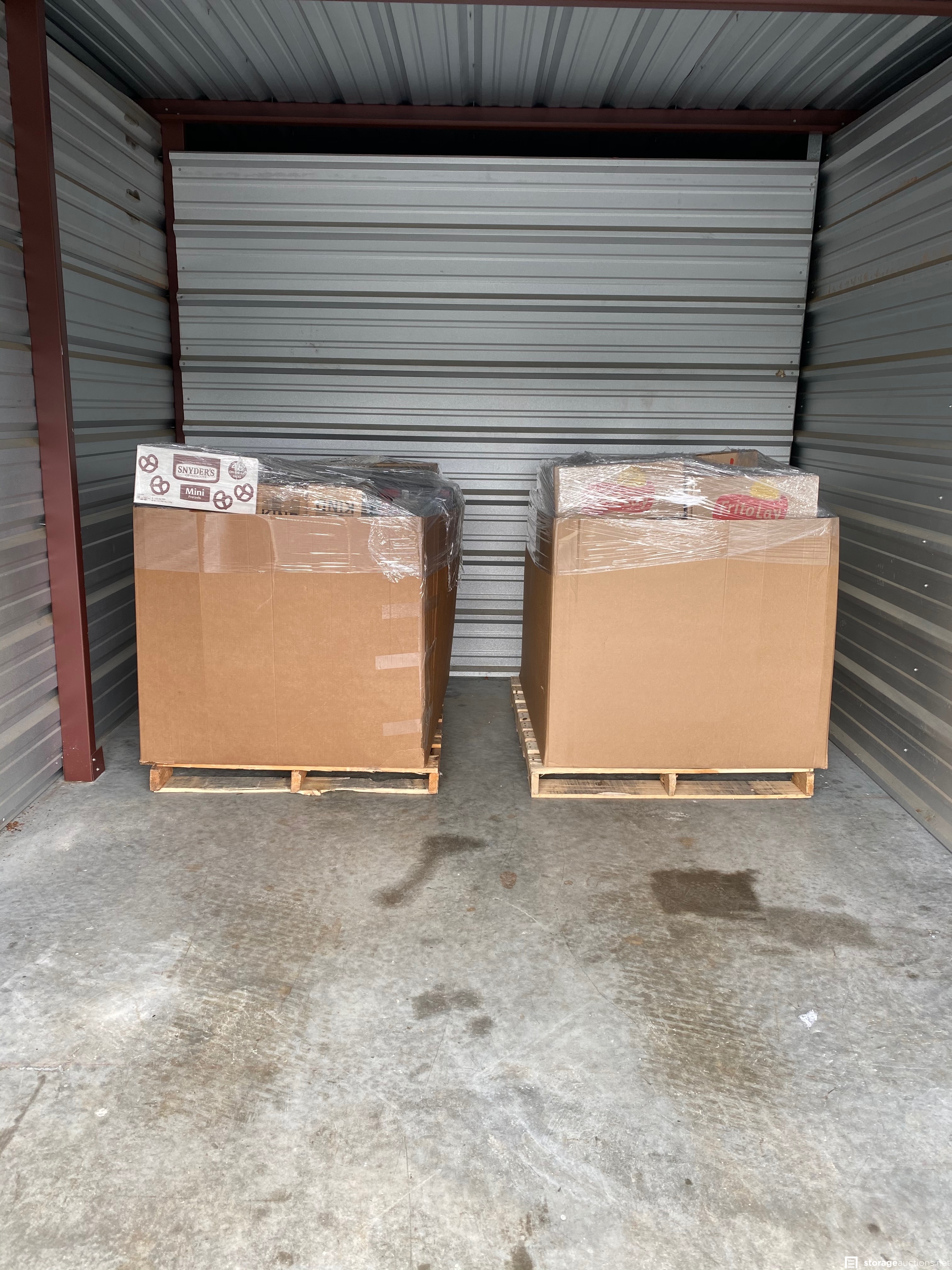 Two pallets filled with food and drink. Unit holder says it’s filled with amazon overstock and damaged box returns.