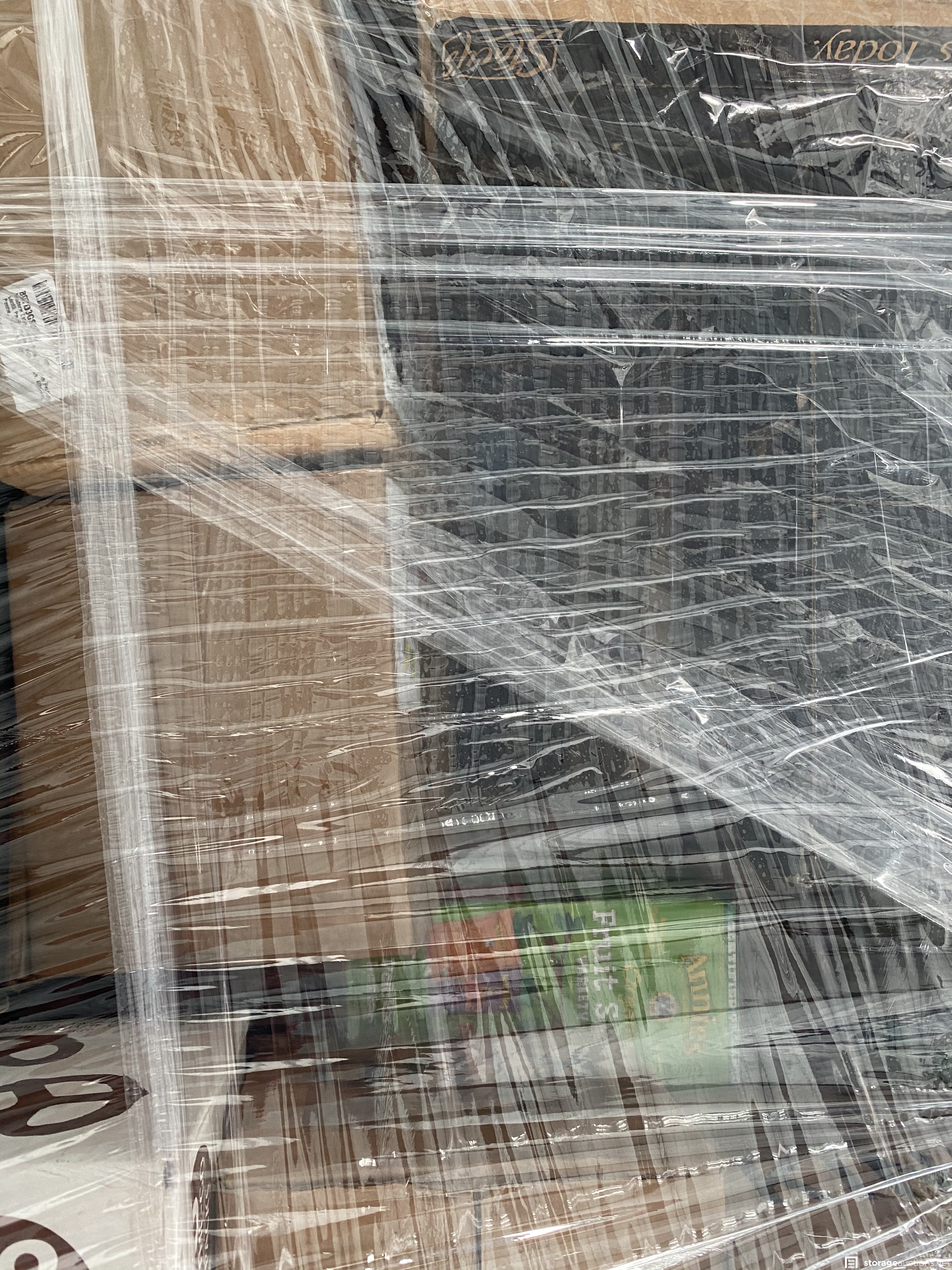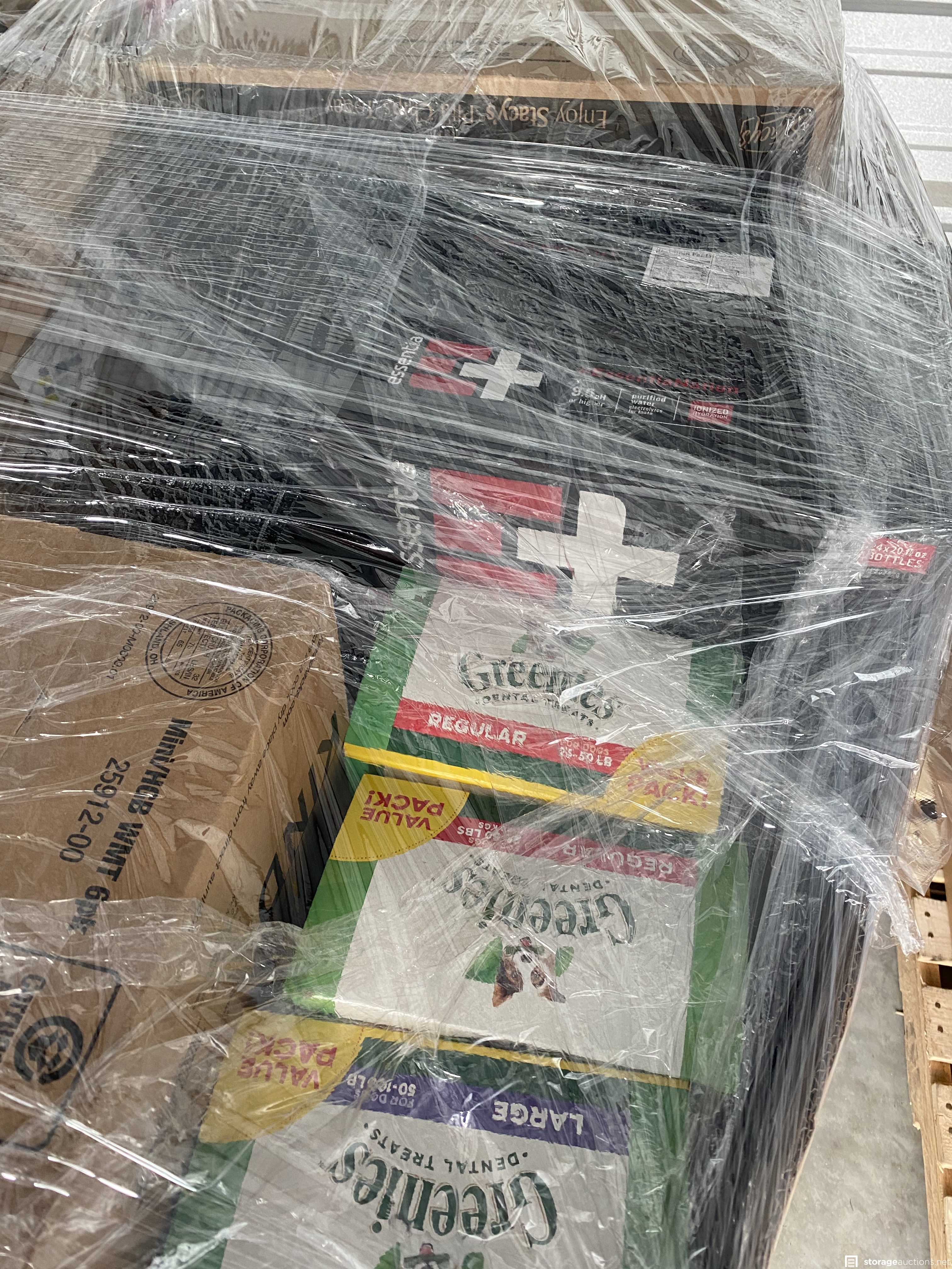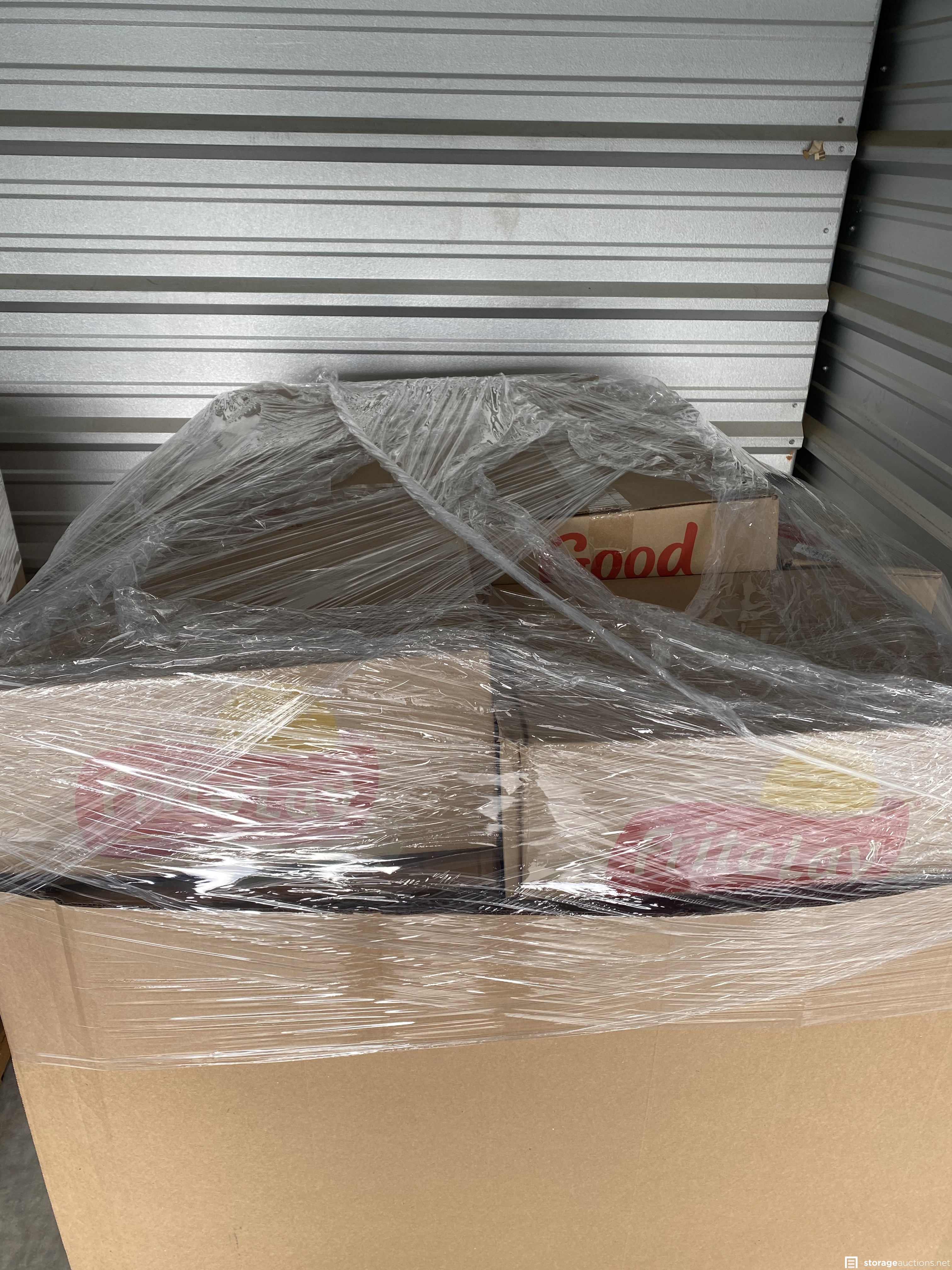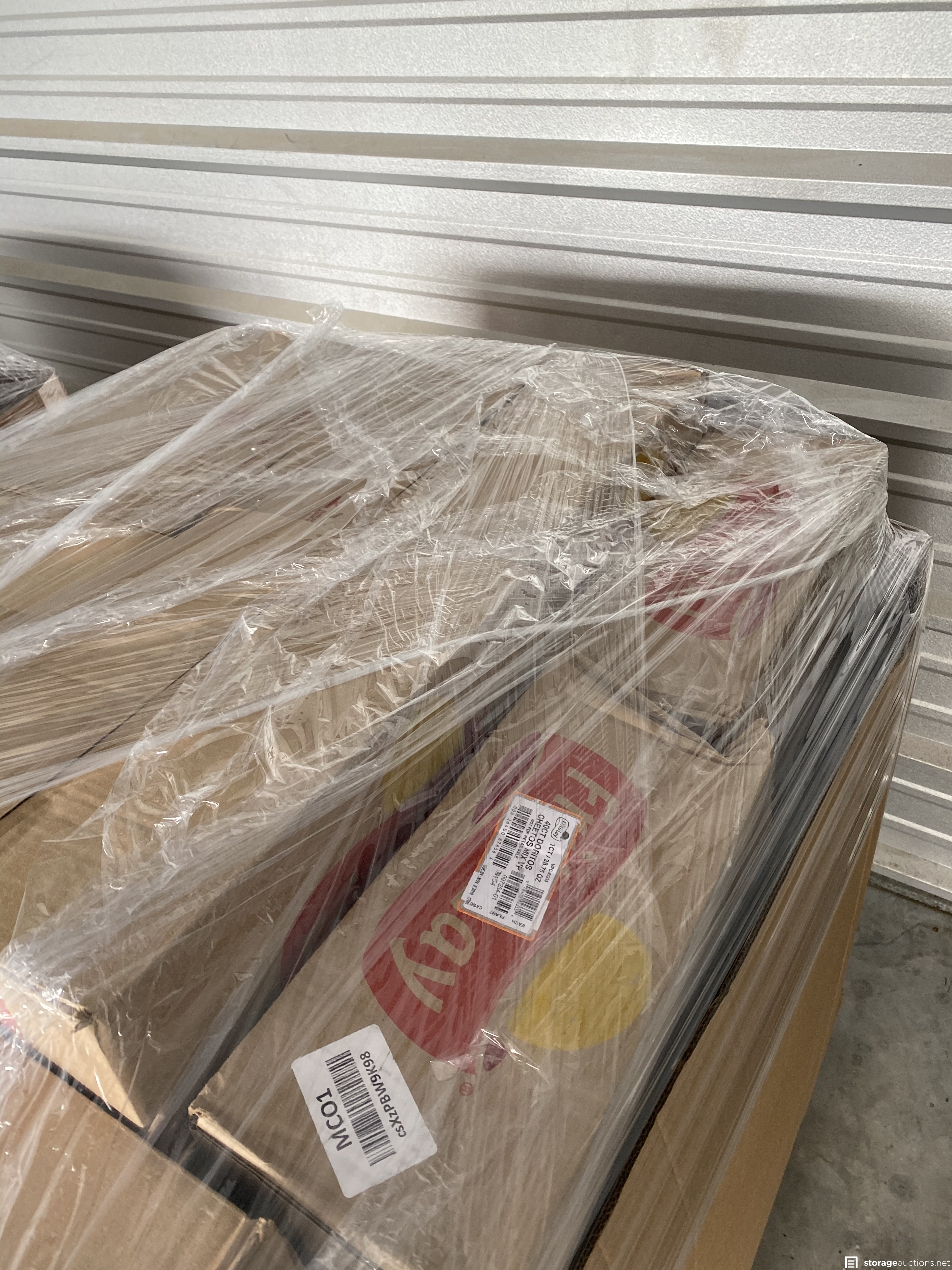 Two pallets filled with food and drink. Unit holder says it’s filled with amazon overstock and damaged box returns.