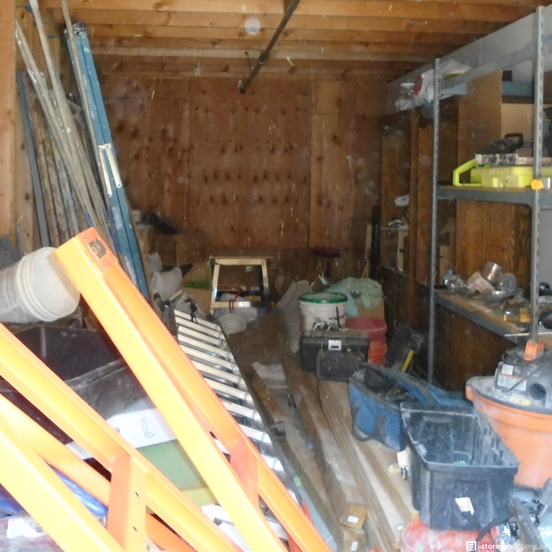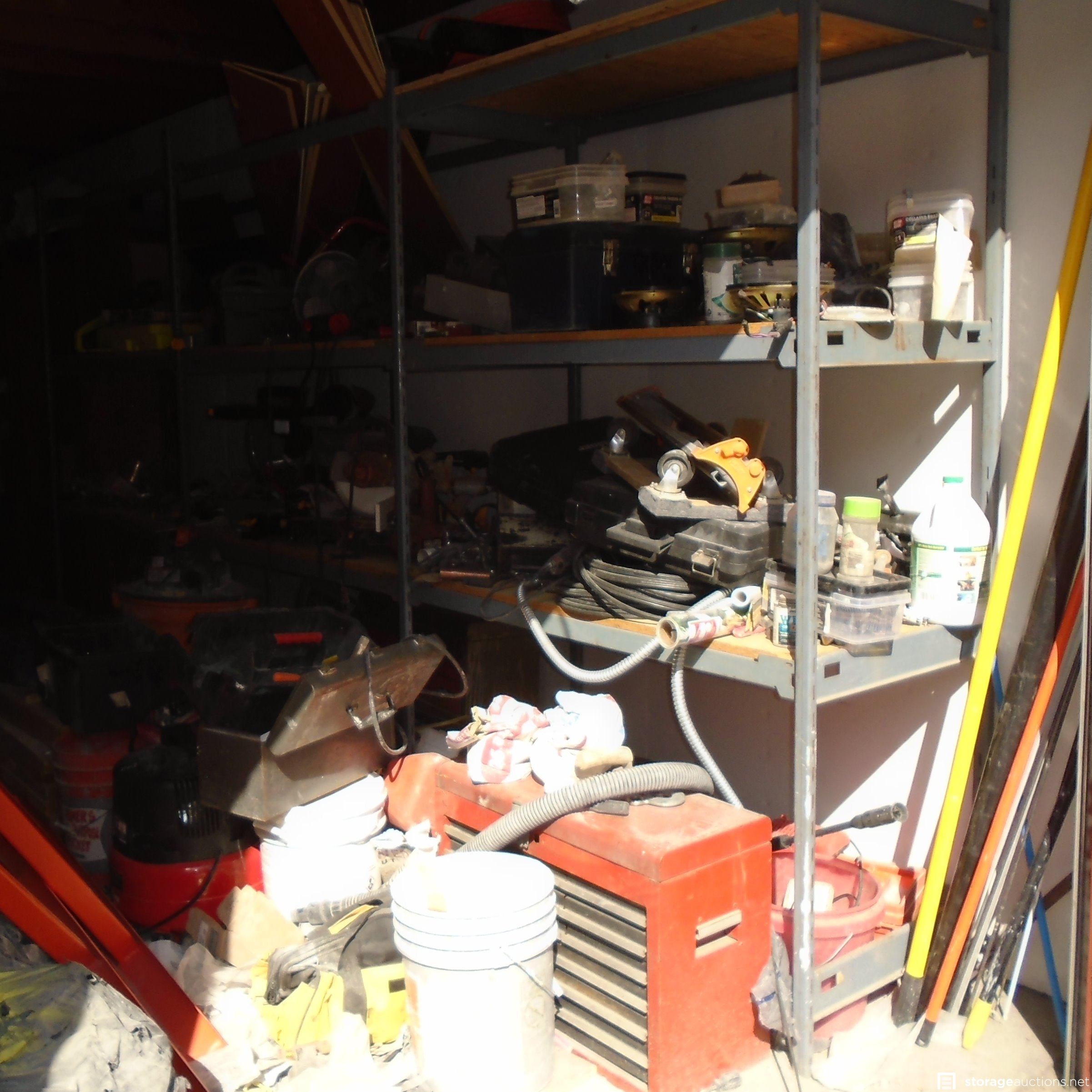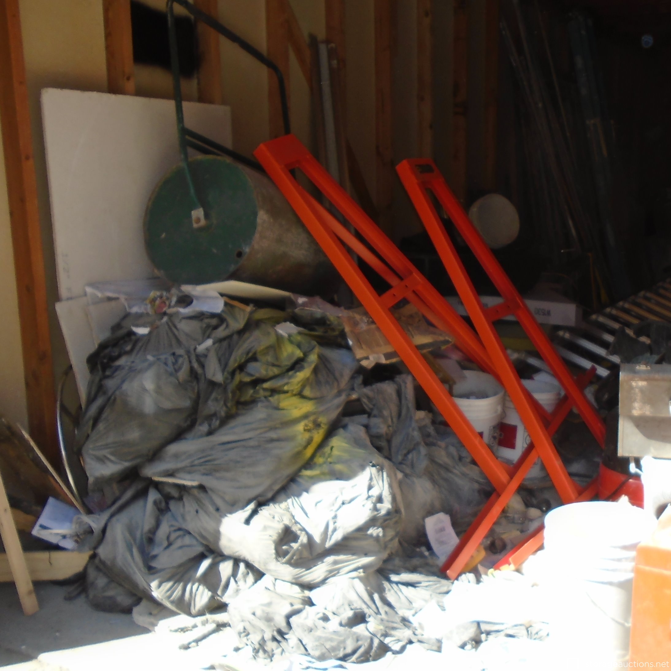 Half full! Construction Unit, ladders, shop vac, concrete compactor, tools, tool box, power tools, hand tools, boxes, totes, shelving.