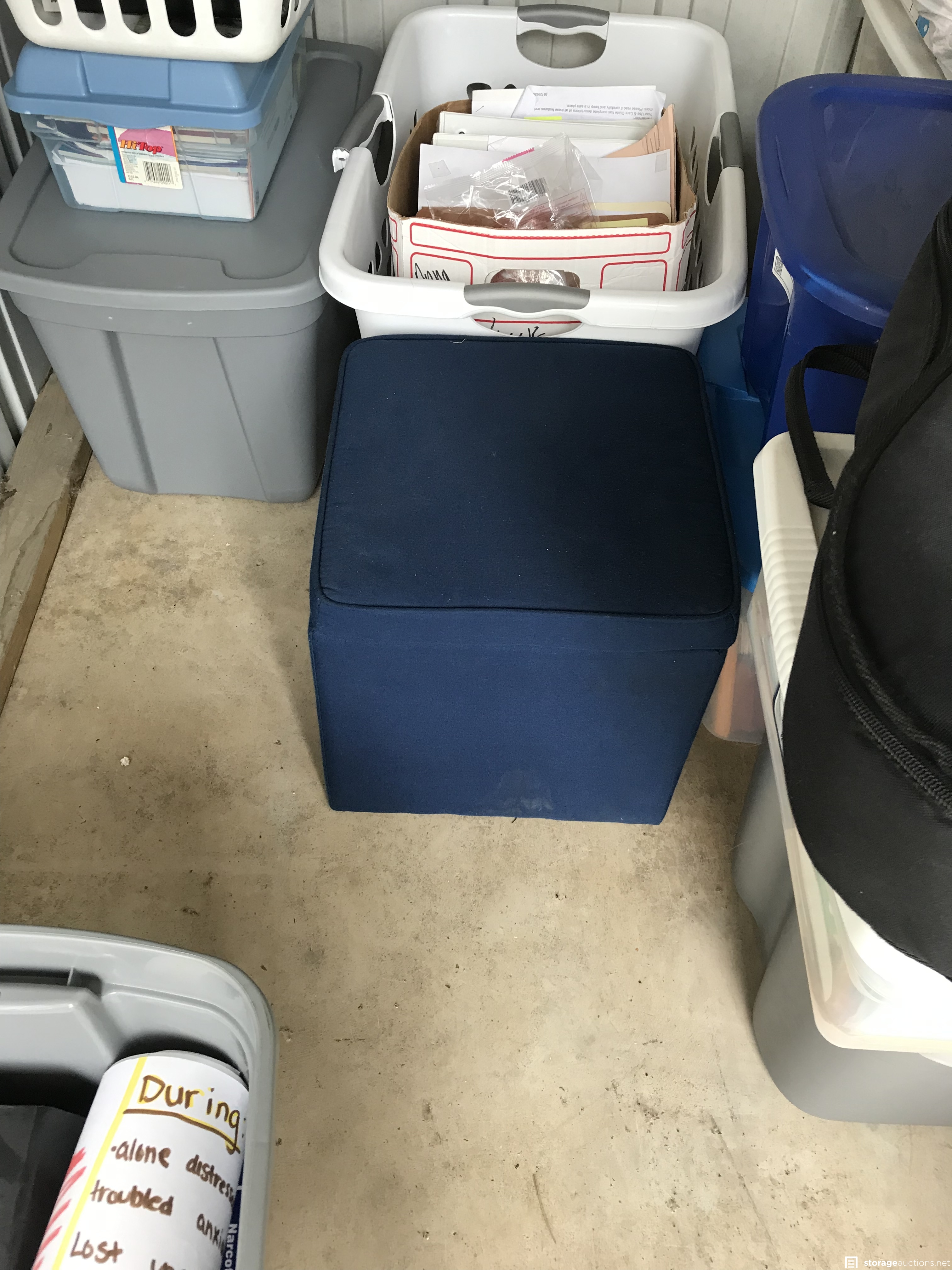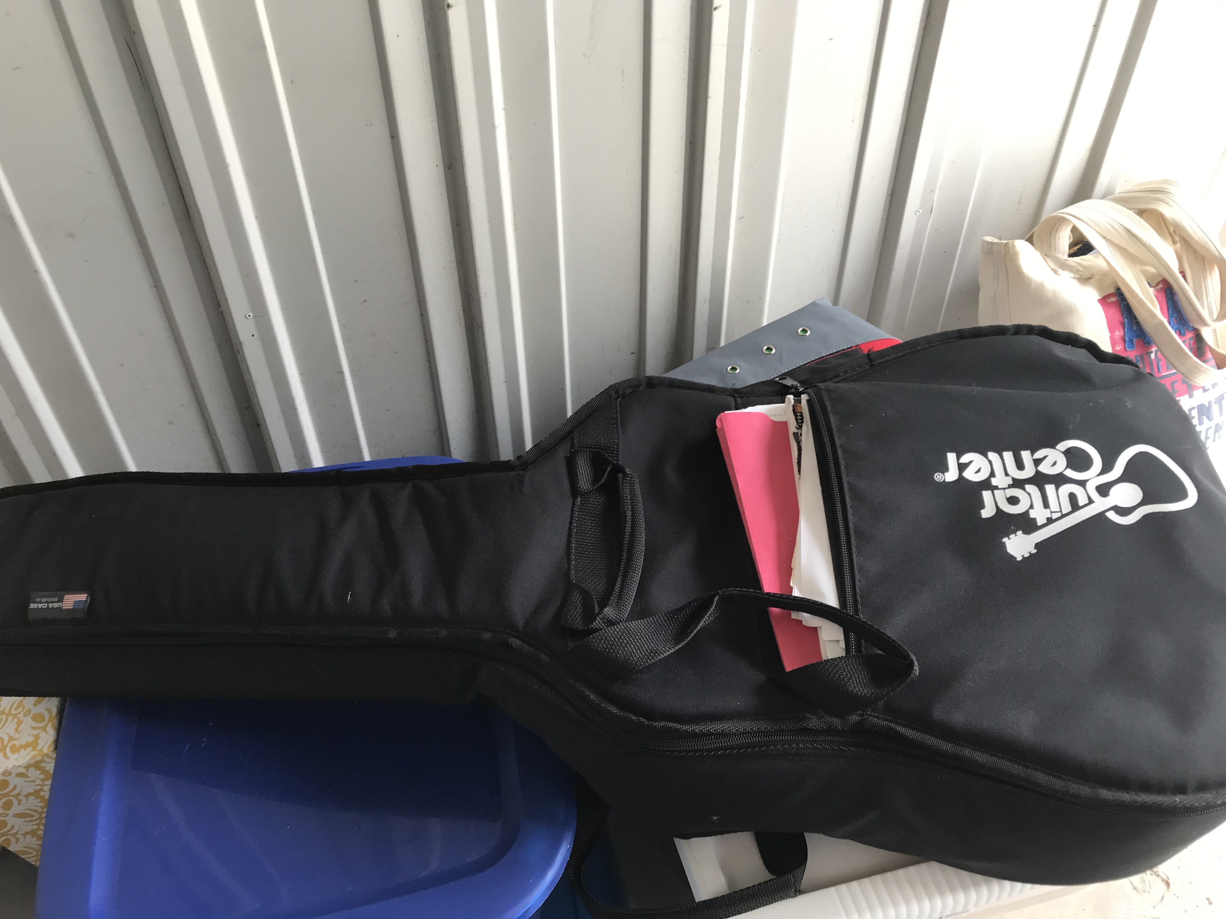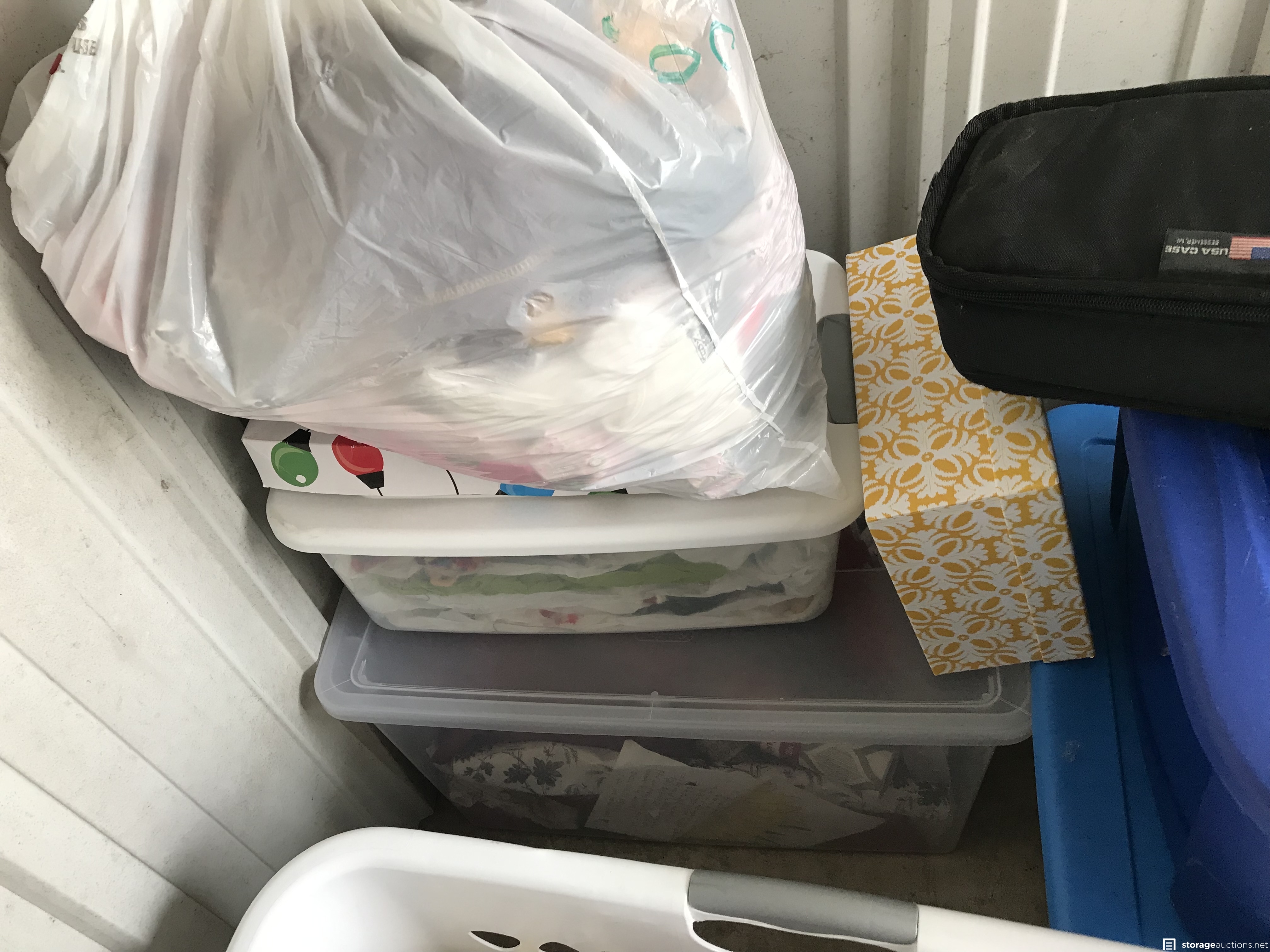 This unit appears to contain guitar, clothing, bins, scratch art, hand made quilt, small safe