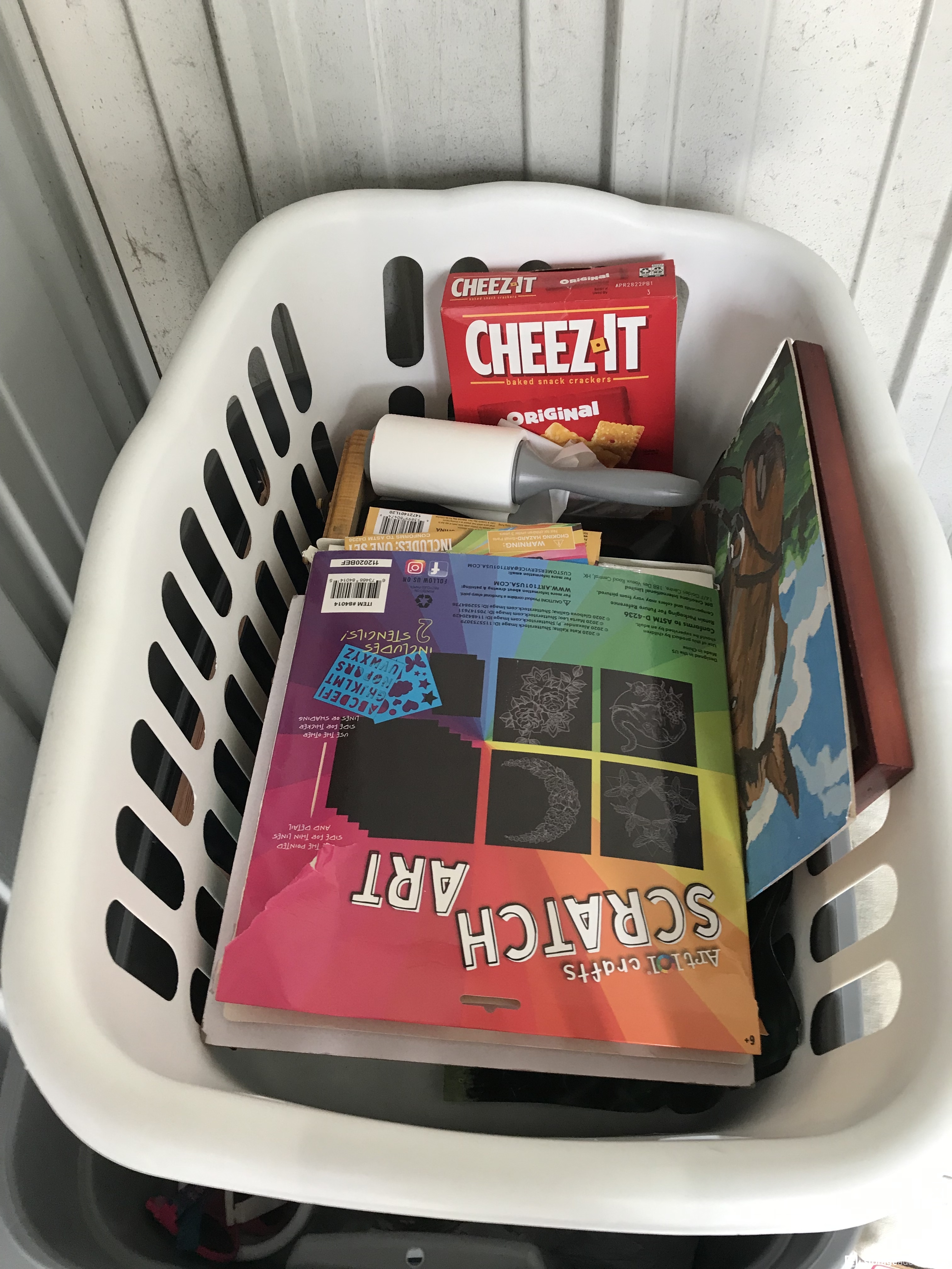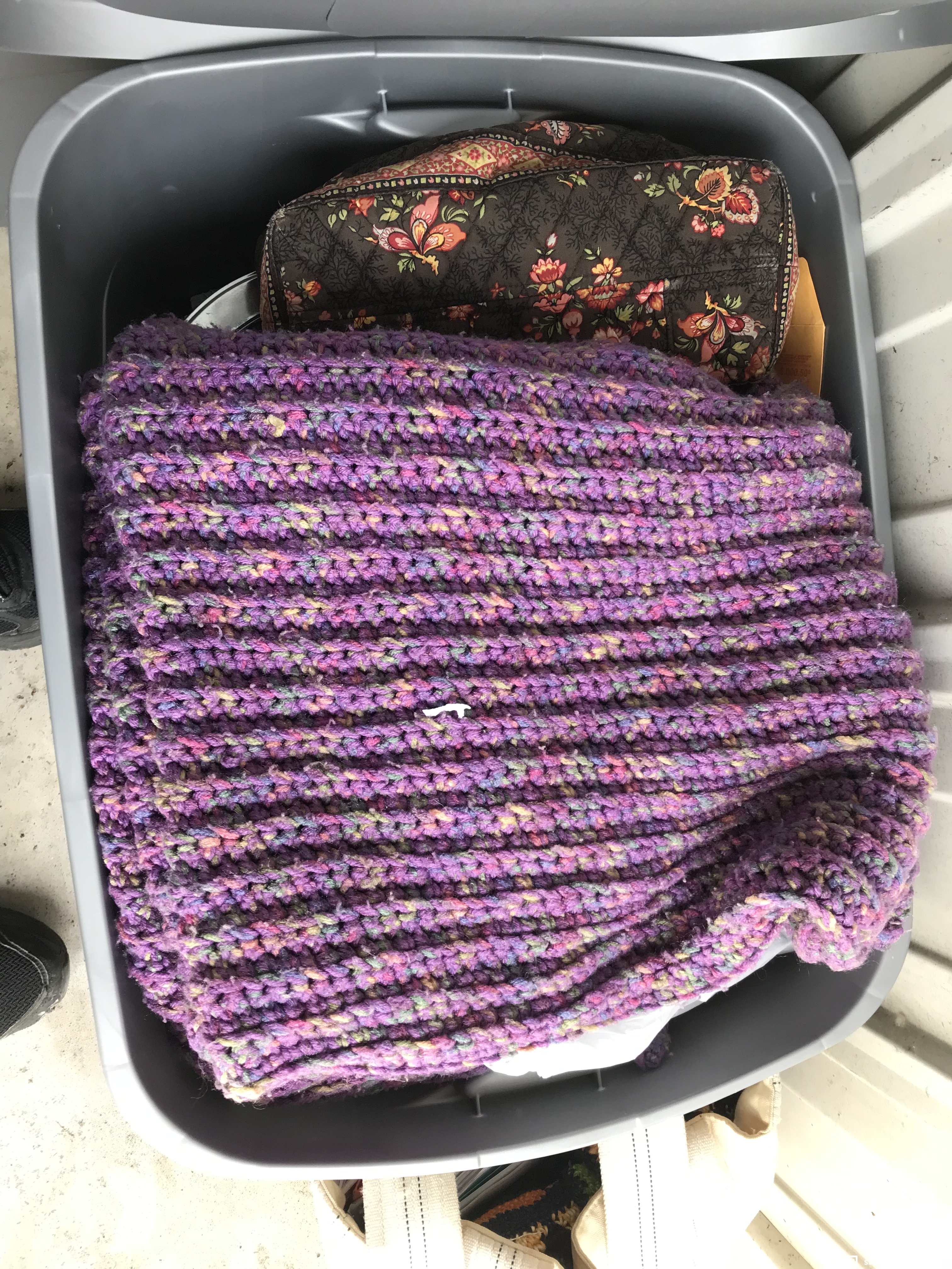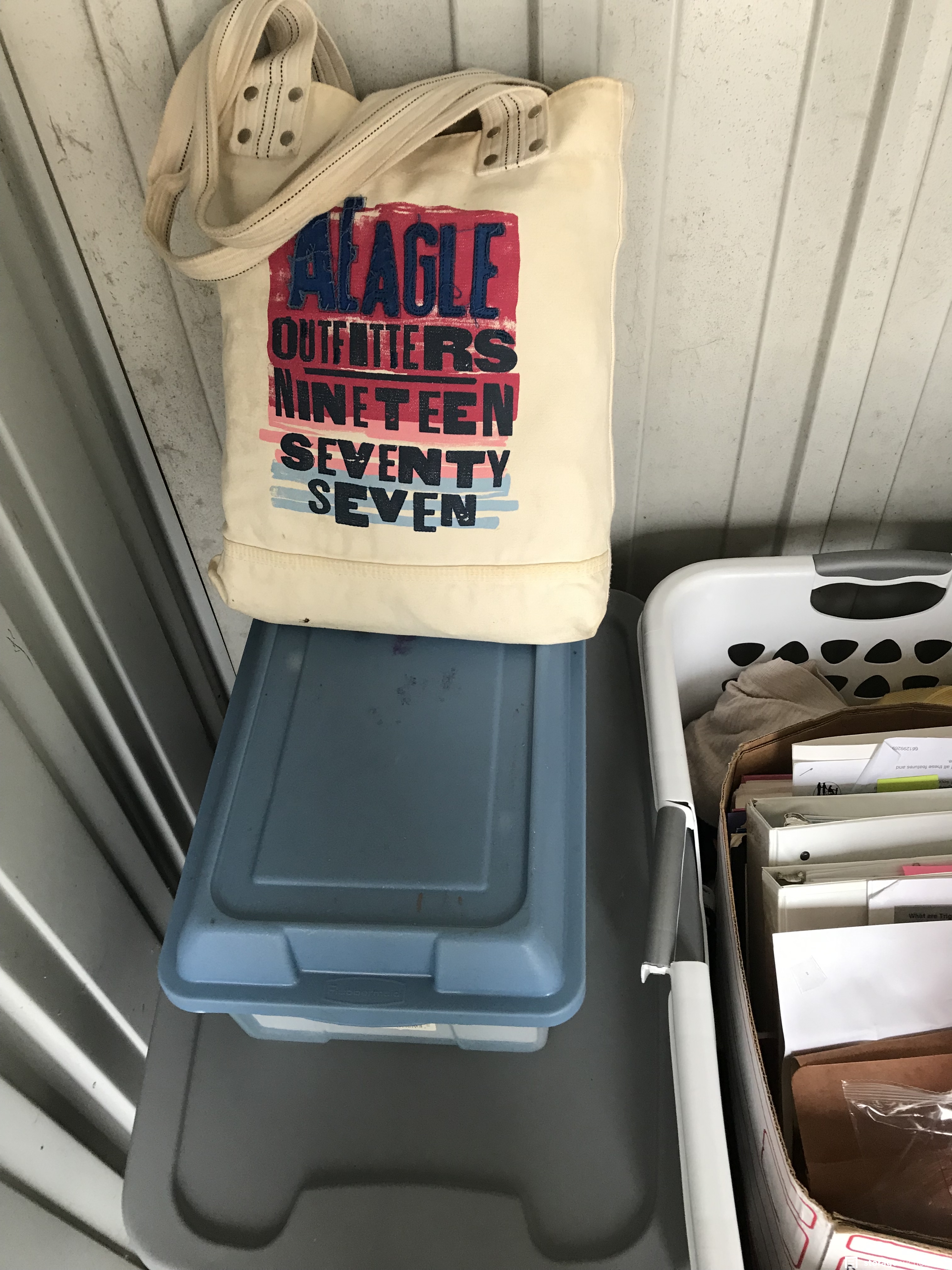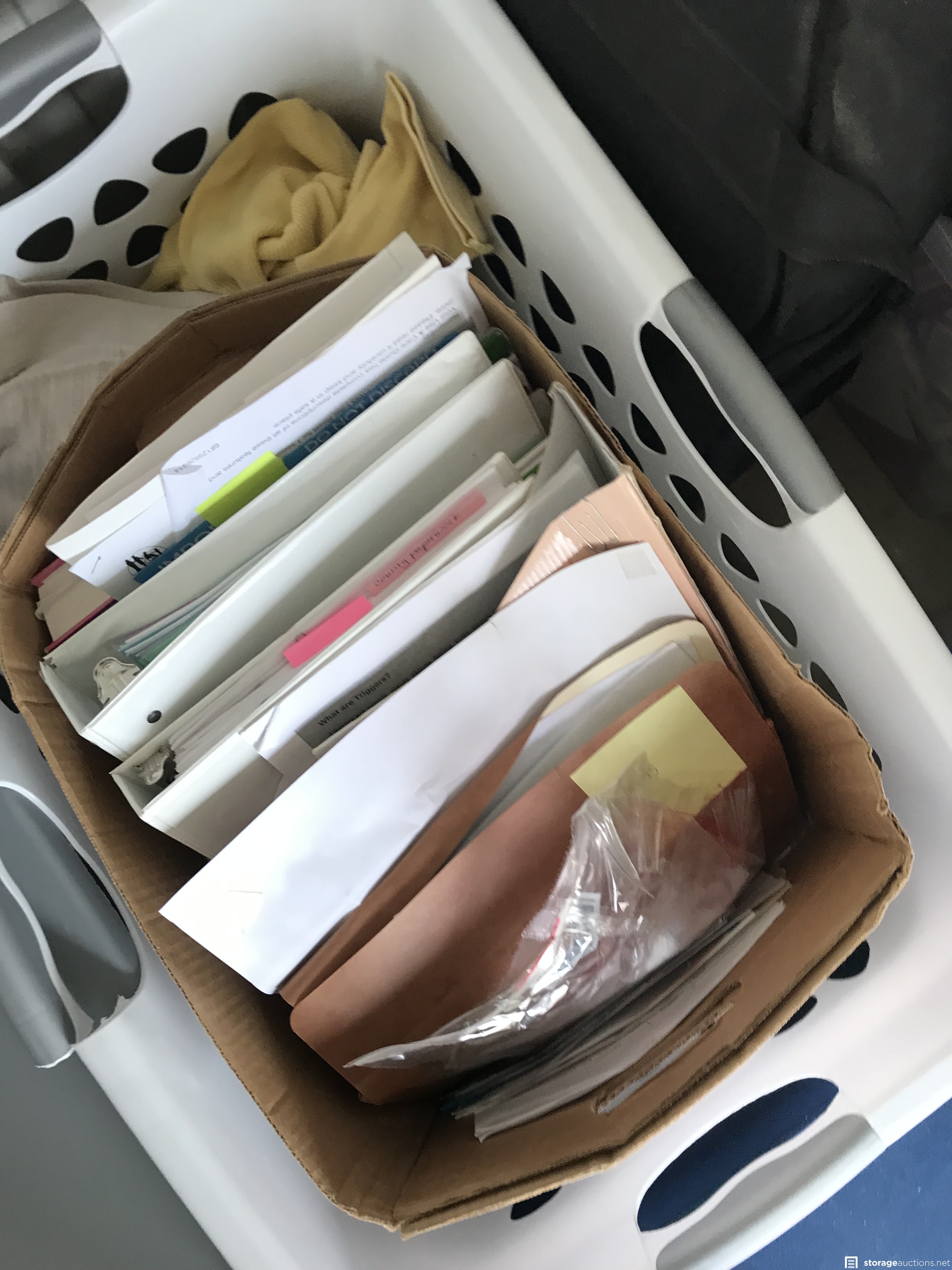 This unit appears to contain guitar, clothing, bins, scratch art, hand made quilt, small safe