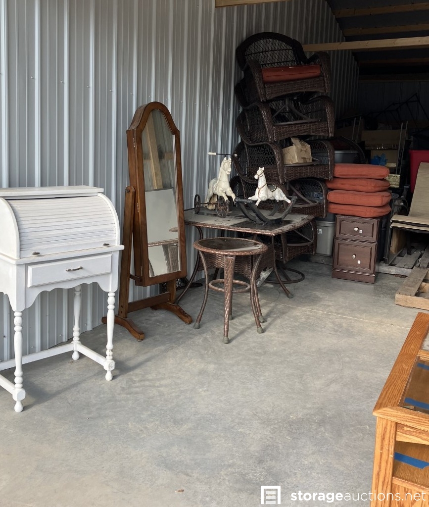 Norman Rockwell numbered collector plates, small roll top desk, antique riding horse and horse tricycle, horse tack, 2 patio chairs, full size mirror/jewelry case, glassware and dishes, glass top sofa table, 6 wicker patio chairs/cushions and 2 matching tables, much misc.
