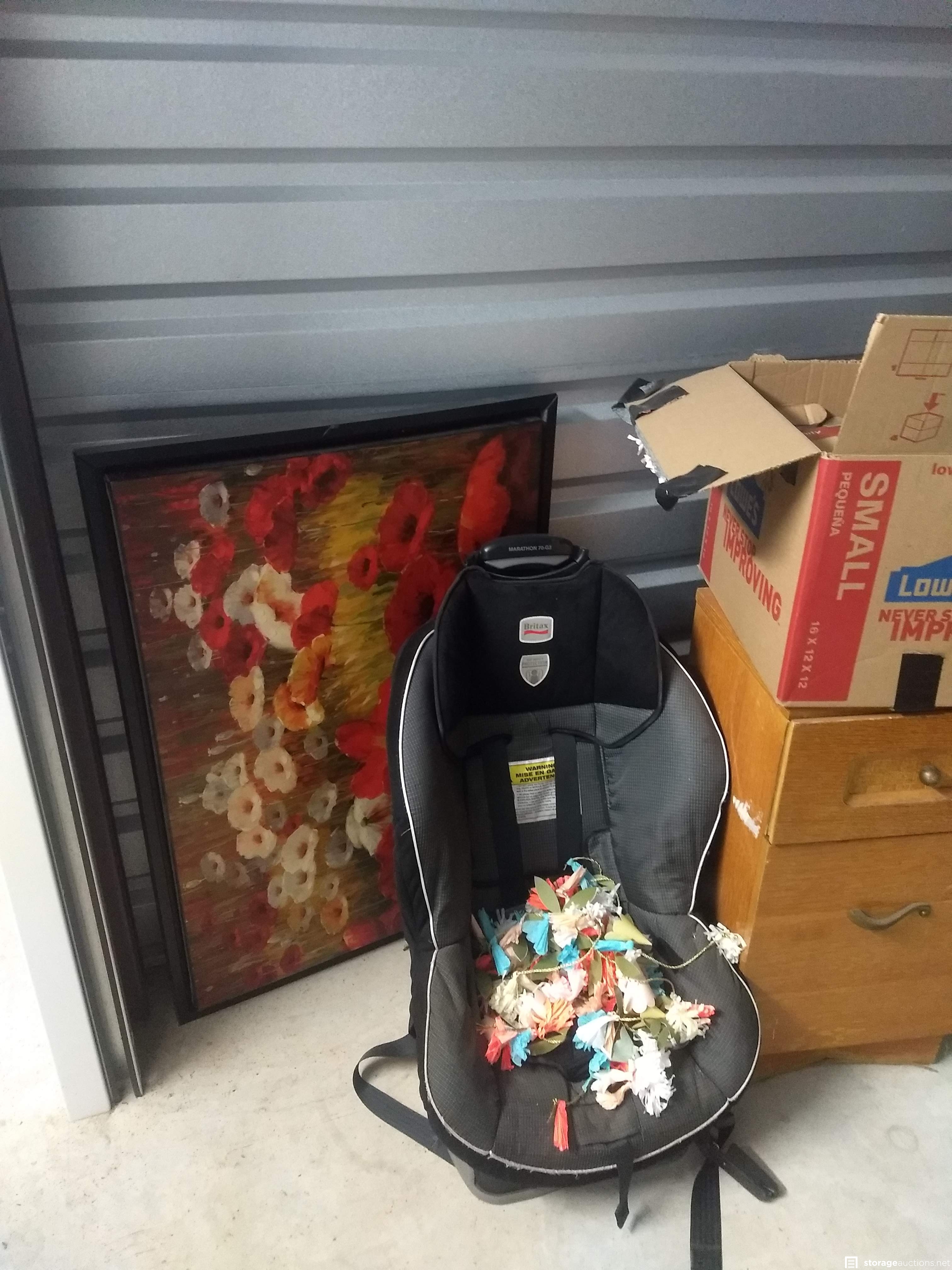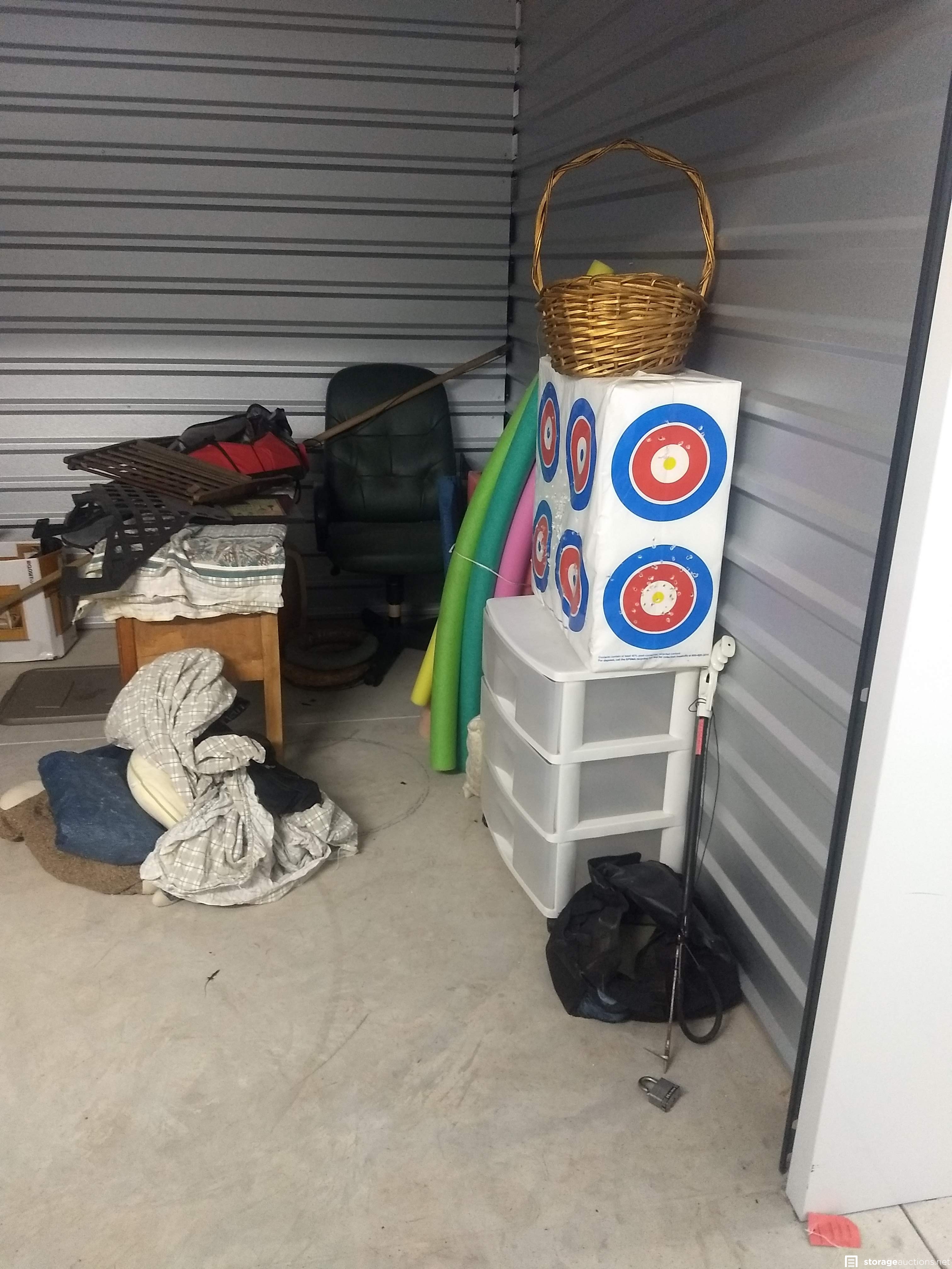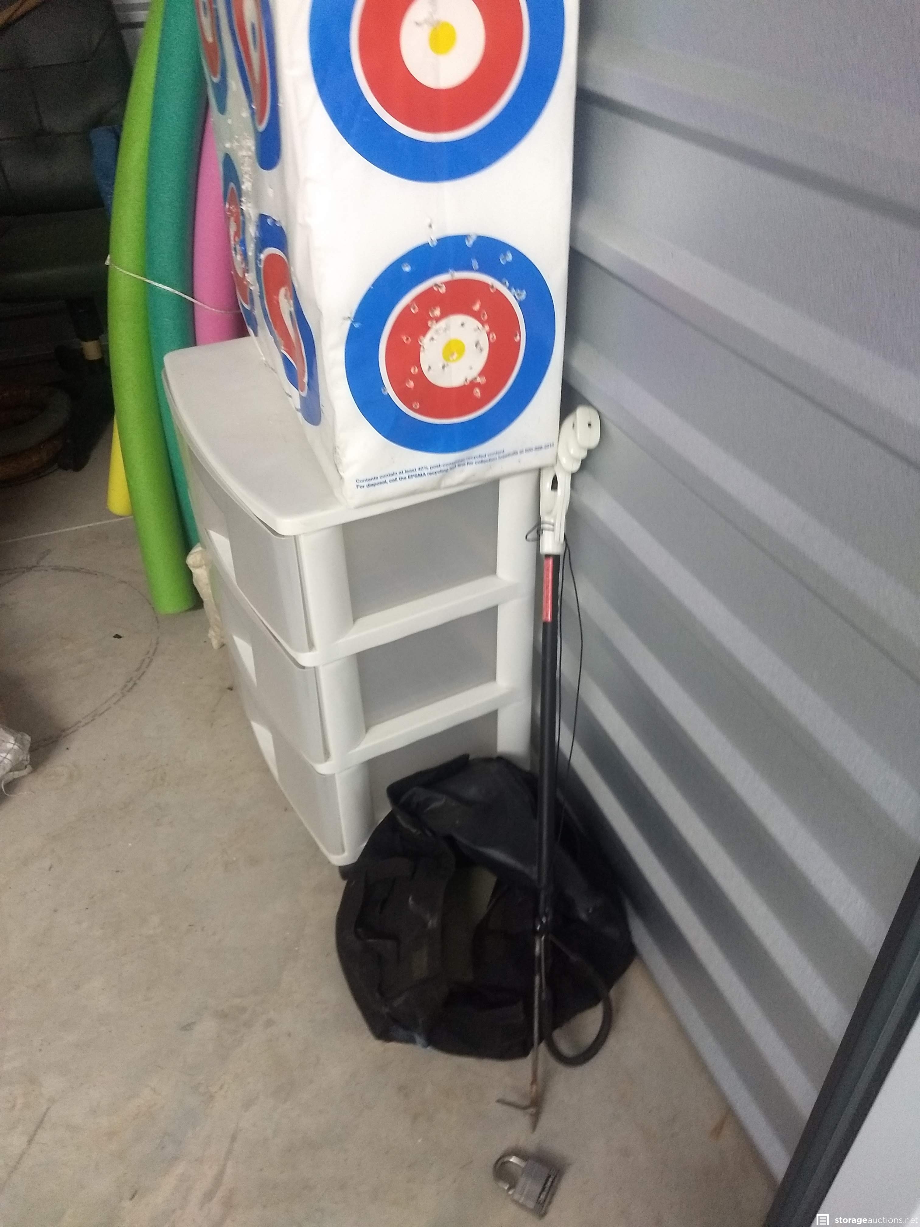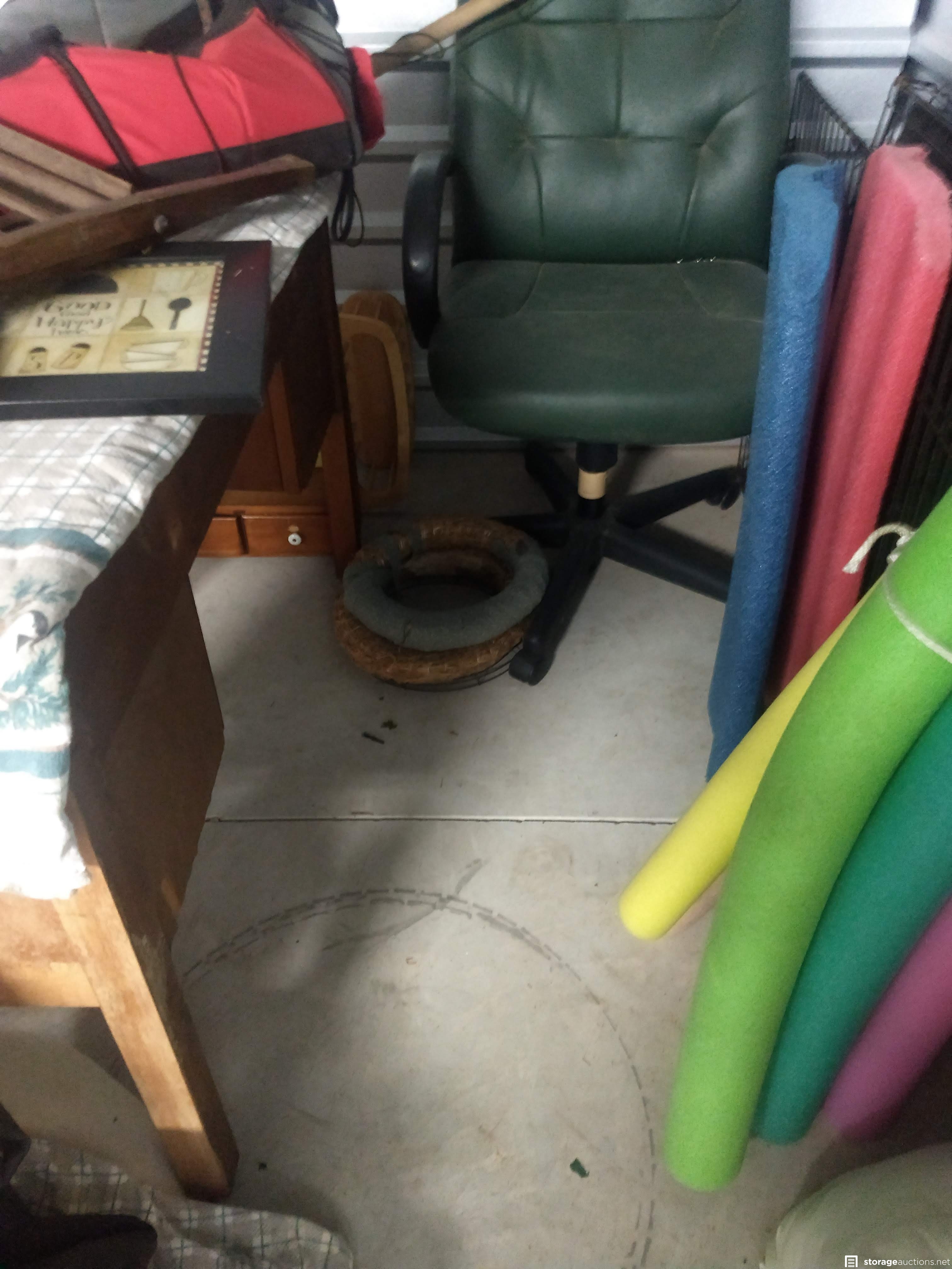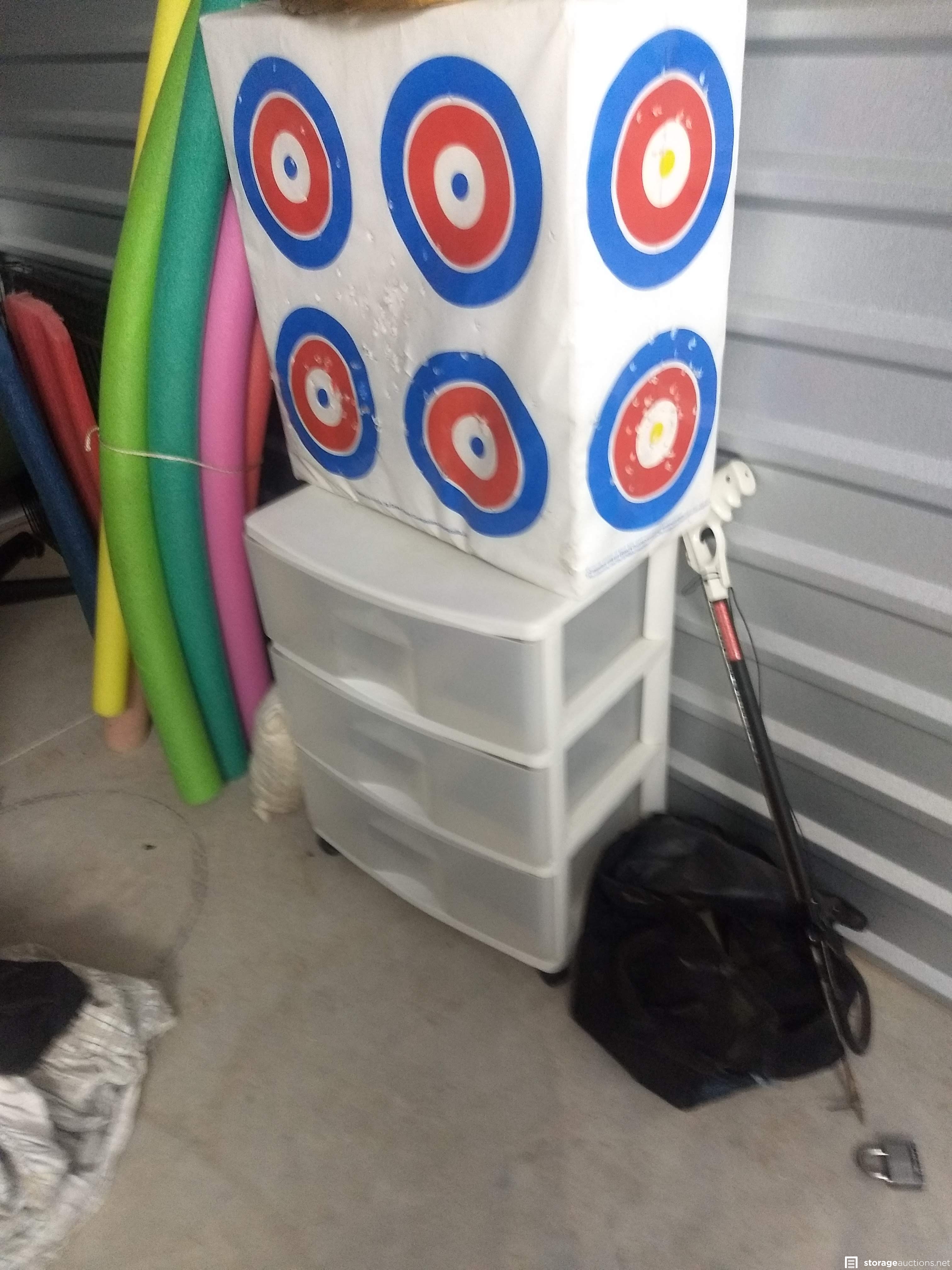 Pool Noodles, Car Seat, Complete Antique car track set, archery target, plastic drawers, Art work, Decorations, Bottles, Pool float, Desk Chair, Desk, Spice racks, Large Dog Kennel, Basket, Crates, Nightstand, Harpoon, Pillows, Fishing Spear, Tarp, Dog bed