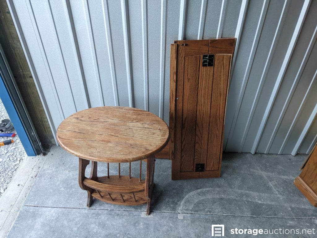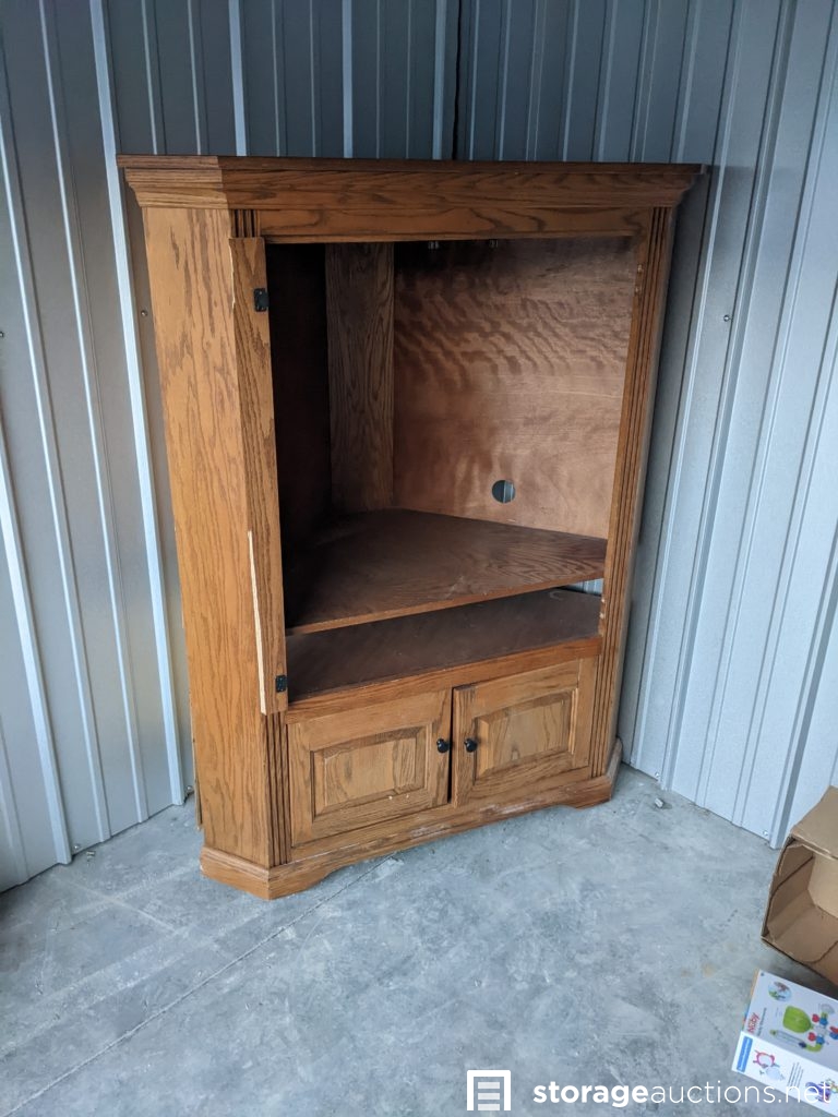 wood entertainment center, wood end table, metal bed frame, boxes, and other miscellaneous items.