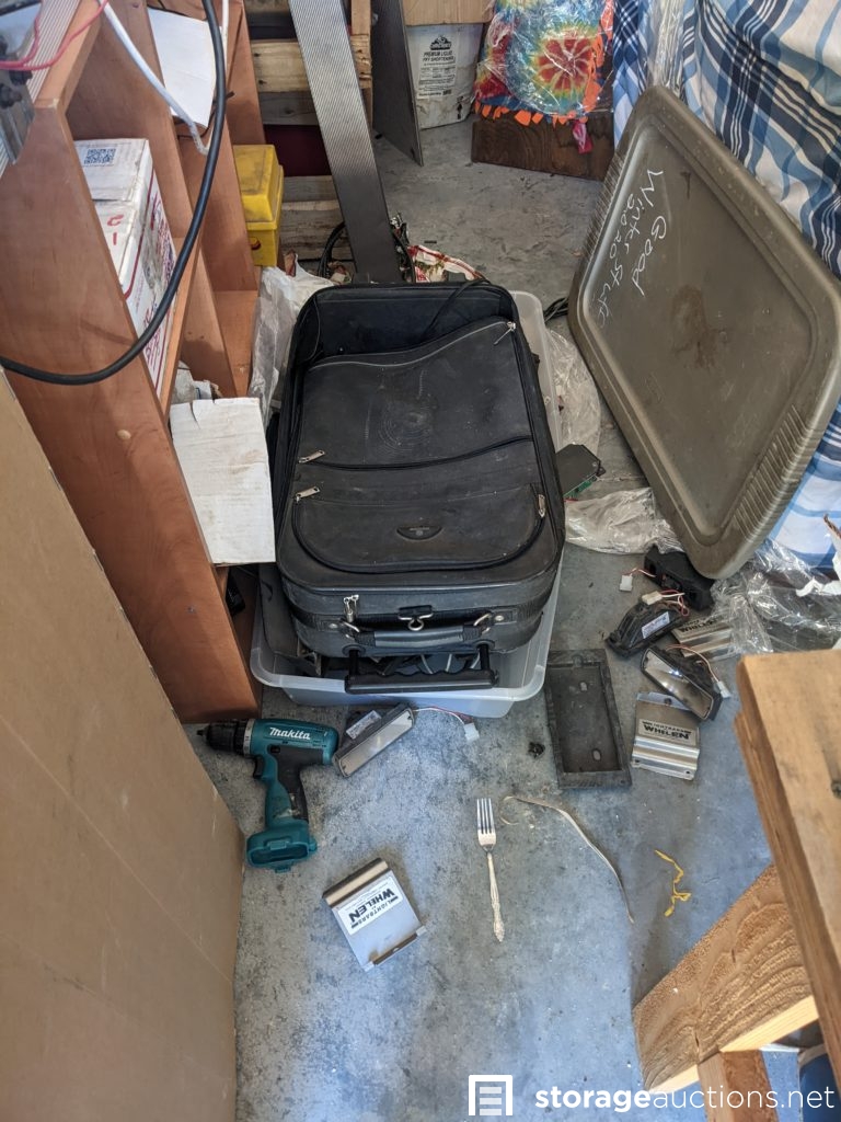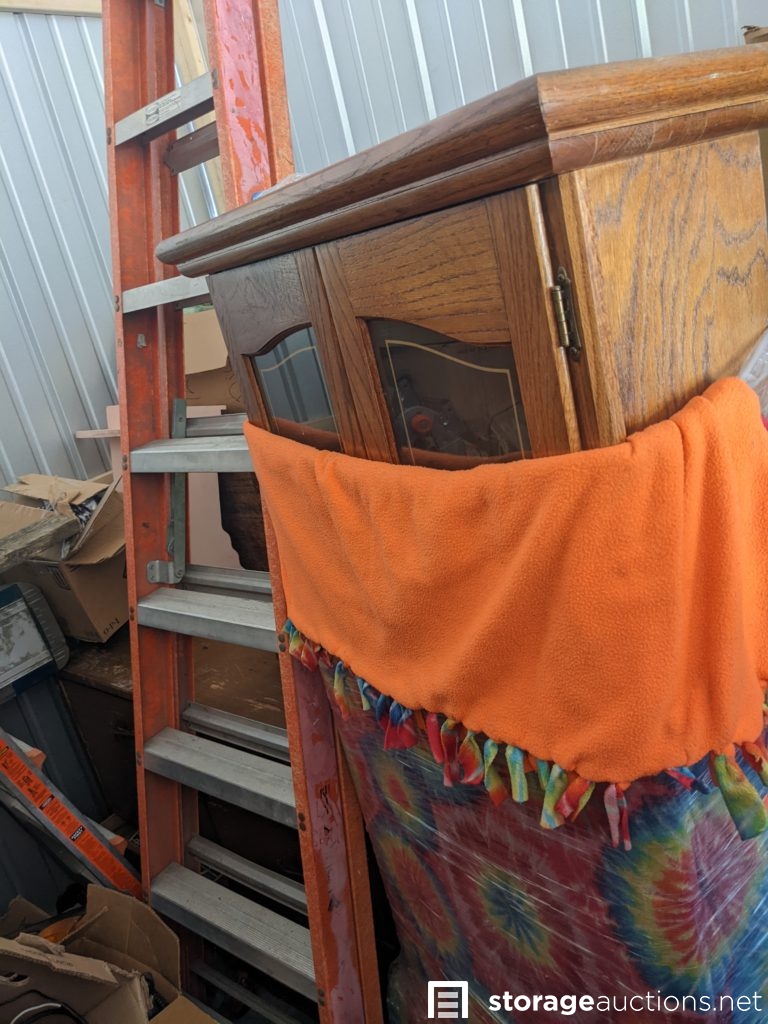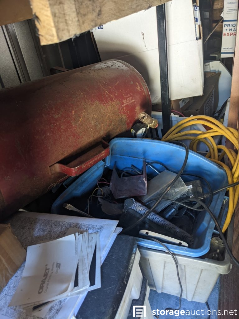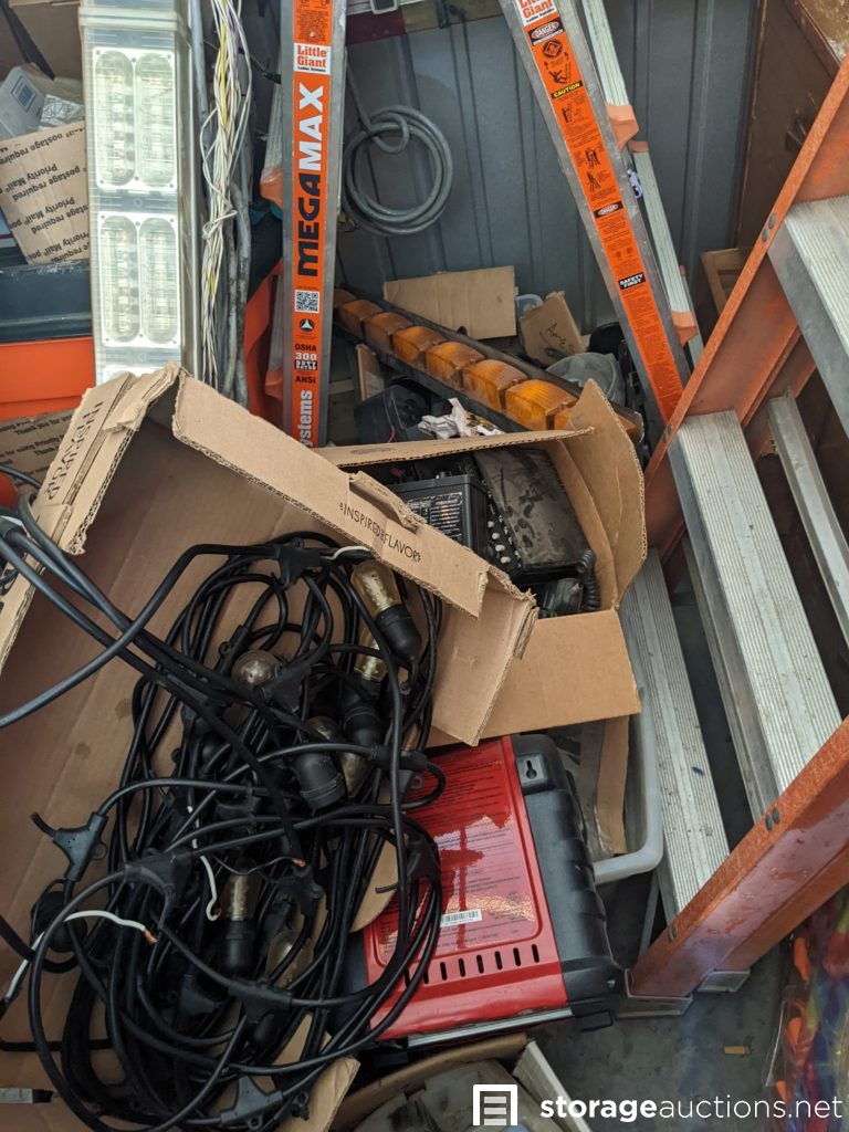 power tools, mega max multi-size ladder, lots of electronic components and parts, air compressor, cables and electronics, lots of boxes, Lights, bulbs, ladders, drill, saw, totes, cabinet, dresser, towels, bed frame, mattress, fling cabinet, suite case. Tag# 7247793