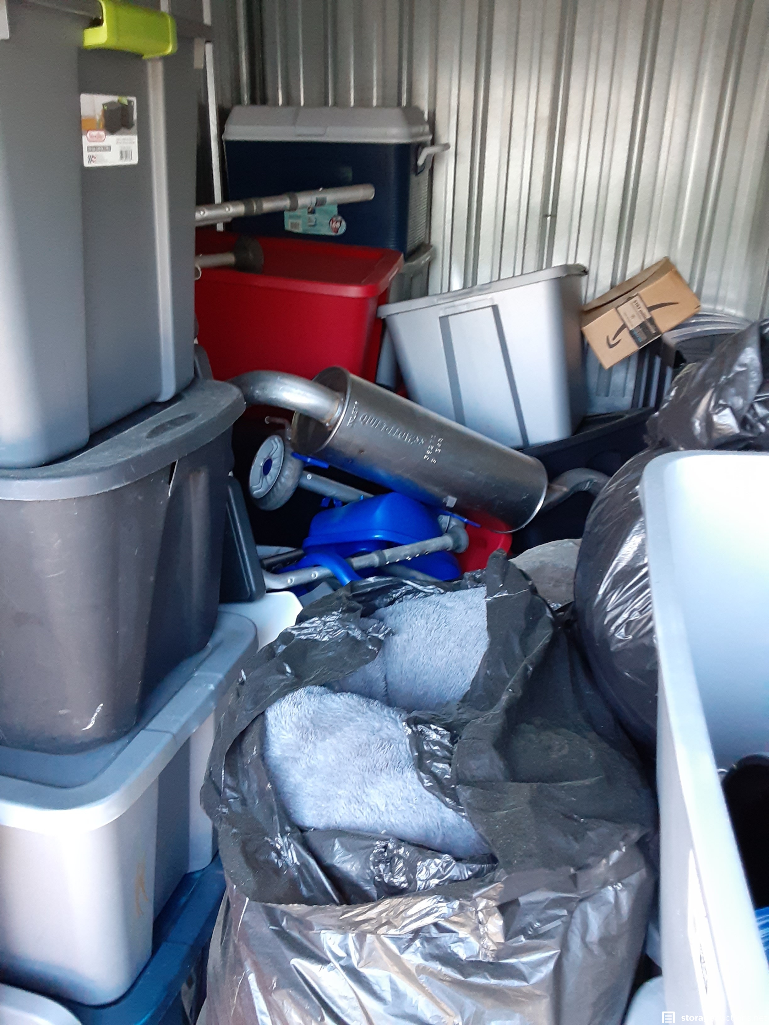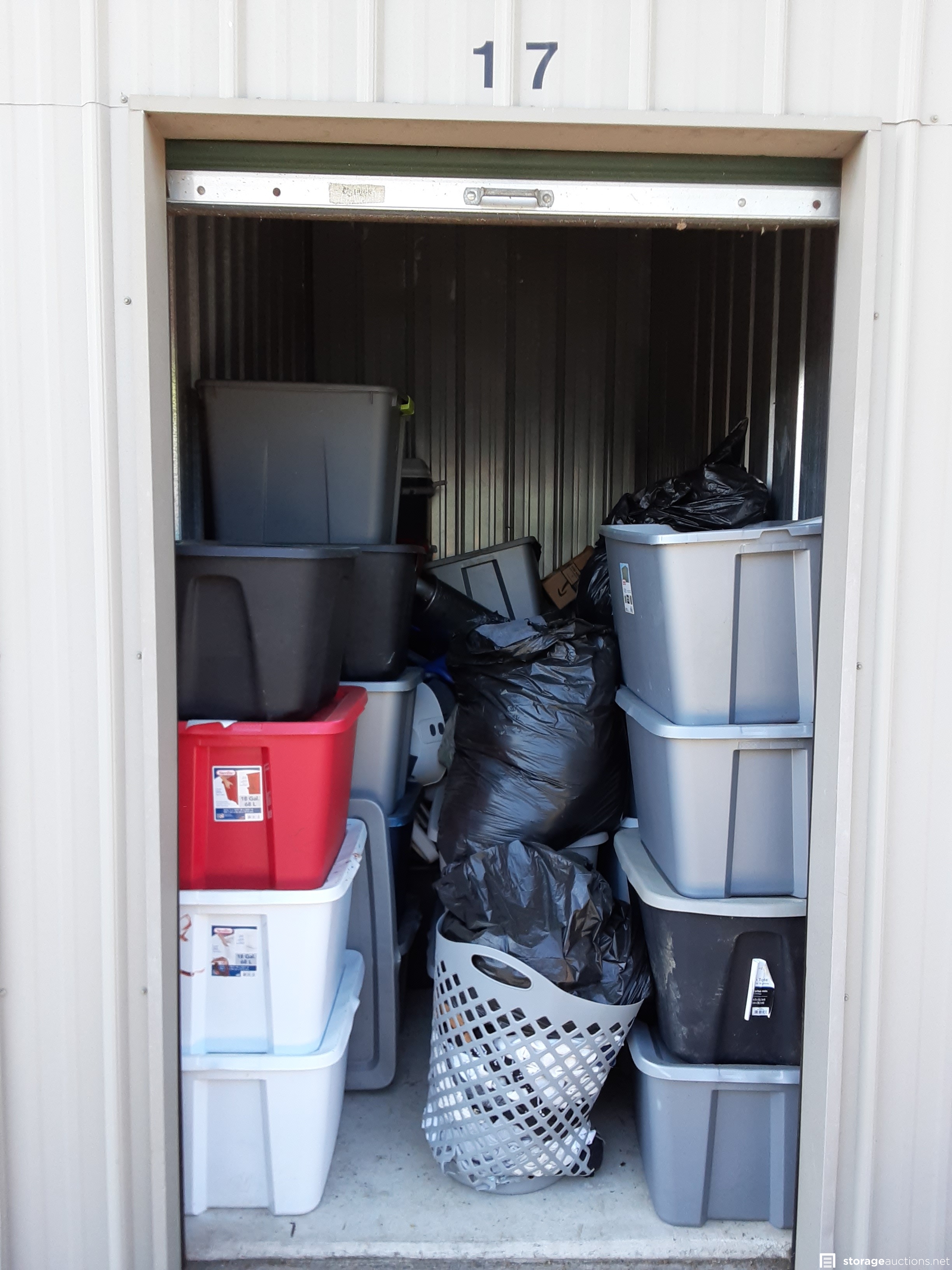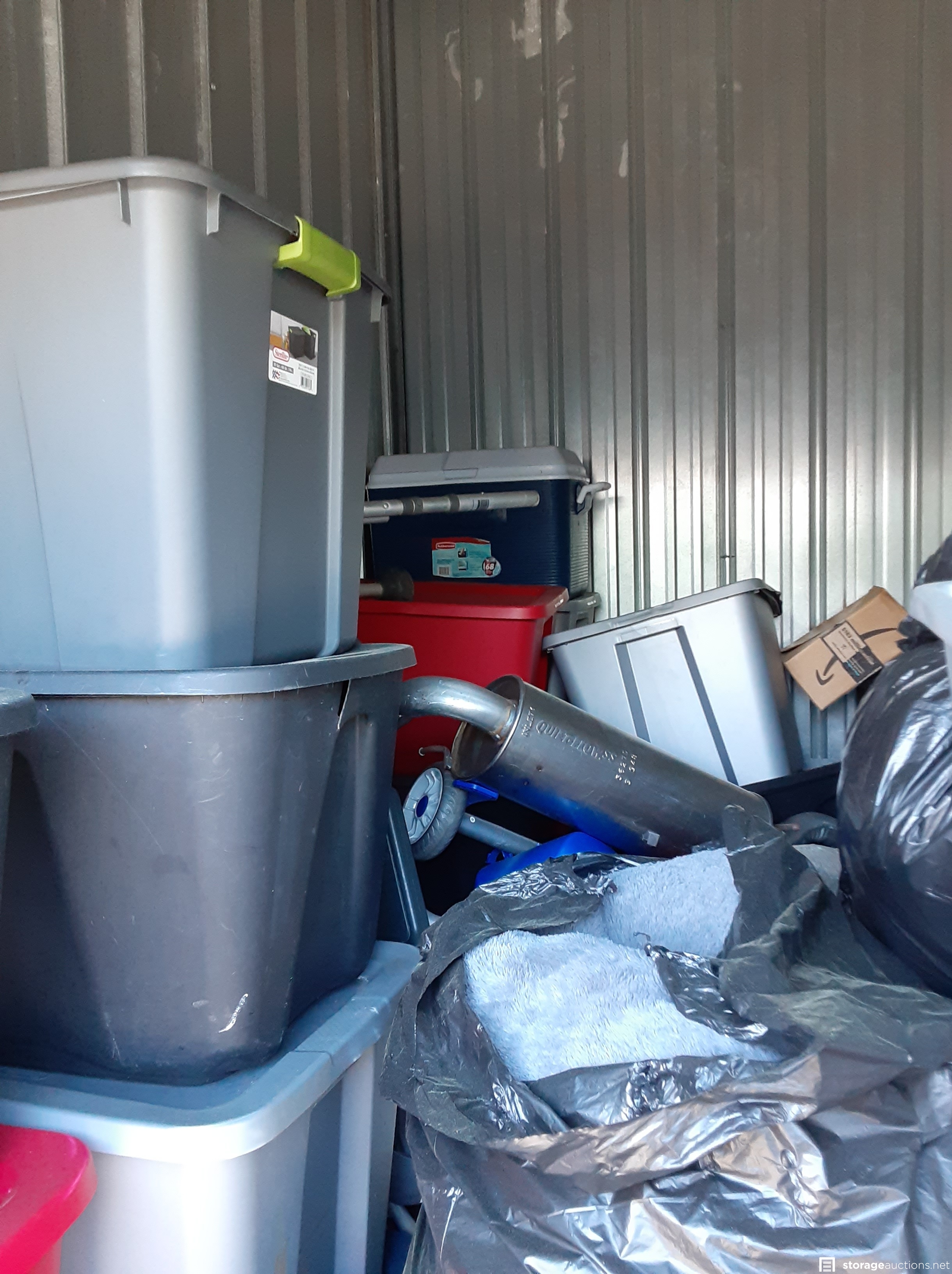 TOTES GALORE. A unit filled with totes of unknown contents. Muffler, medical equipment, and filled bags.