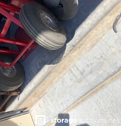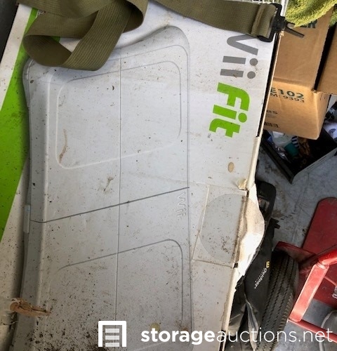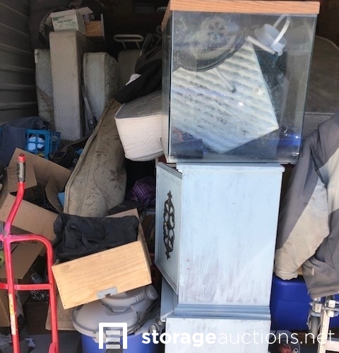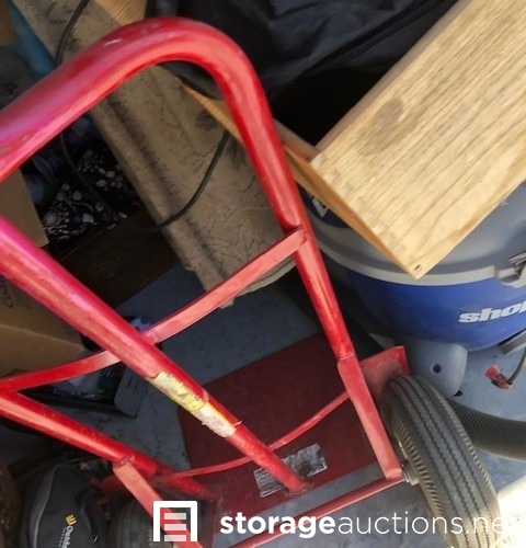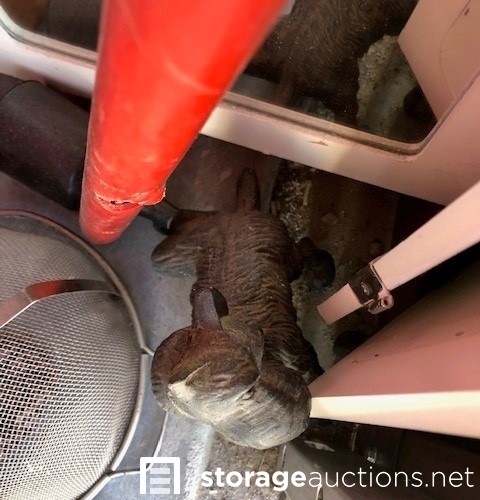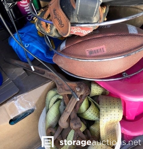 Rolled up carpet, Vacuum, 2- hand carts, Dresser, Small grill, Alien head, Shop vac, Wii Fit, Coolers, Cosmetics, Amp, Tackle box, Mirror, Mattress, Baseball gloves, Football, Dog door stop