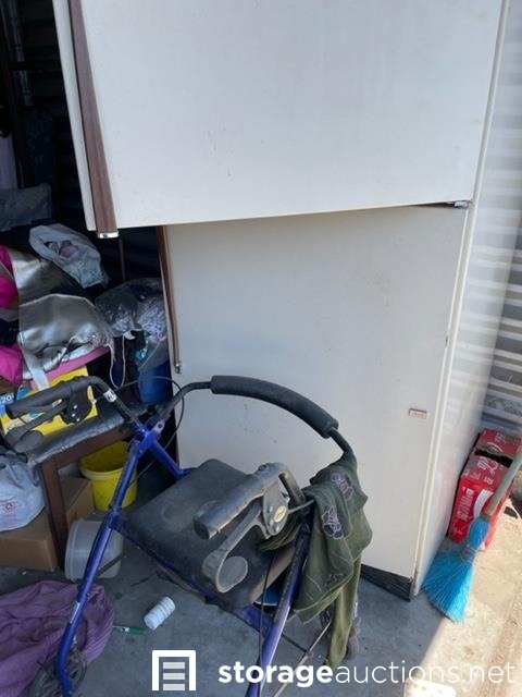 Shelve, chair, dishes, refrigerator, table, walkers, totes, TV