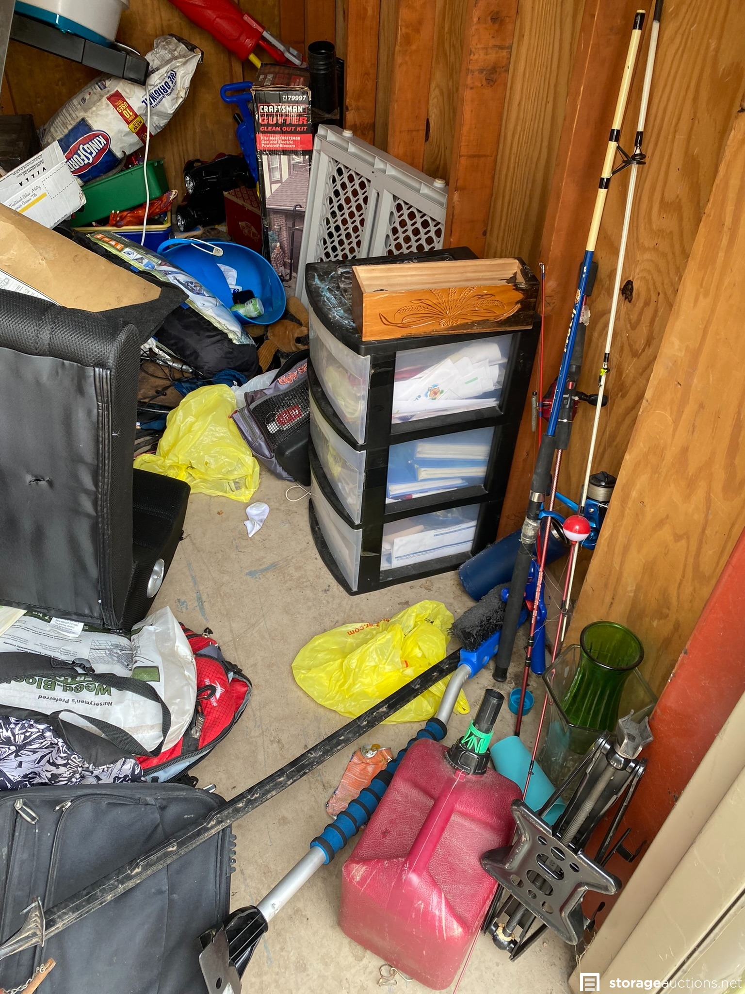 Cordless tools, backpack, fishing poles, gas can, jack, toys, storage chest, and various other household items.