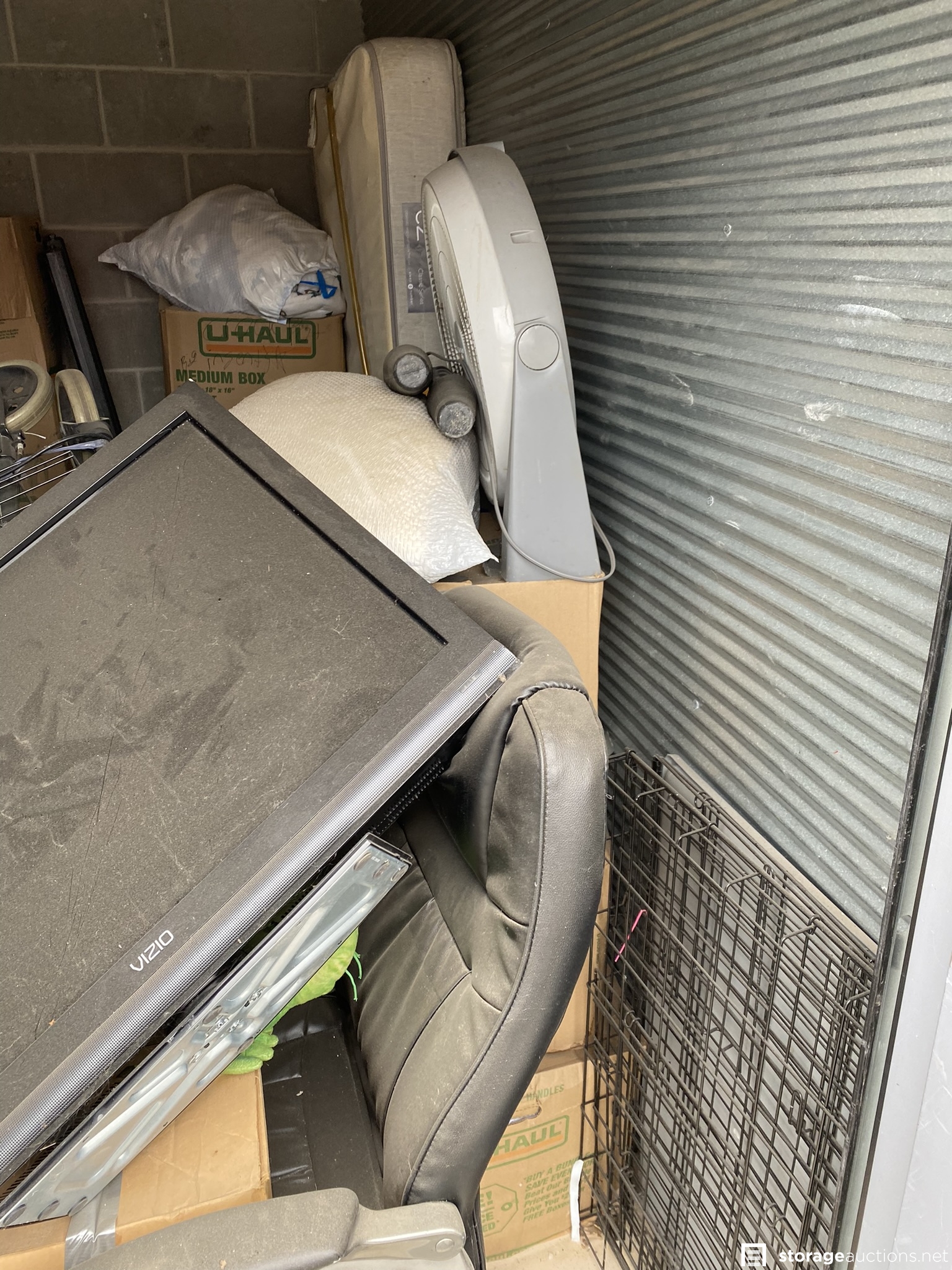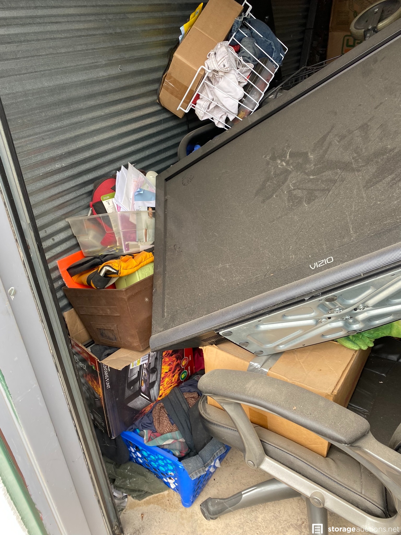 Vizio flat screen TV, office chair, deep freezer, fan, metal wire shelving, bed frame and mattress and various other household items.