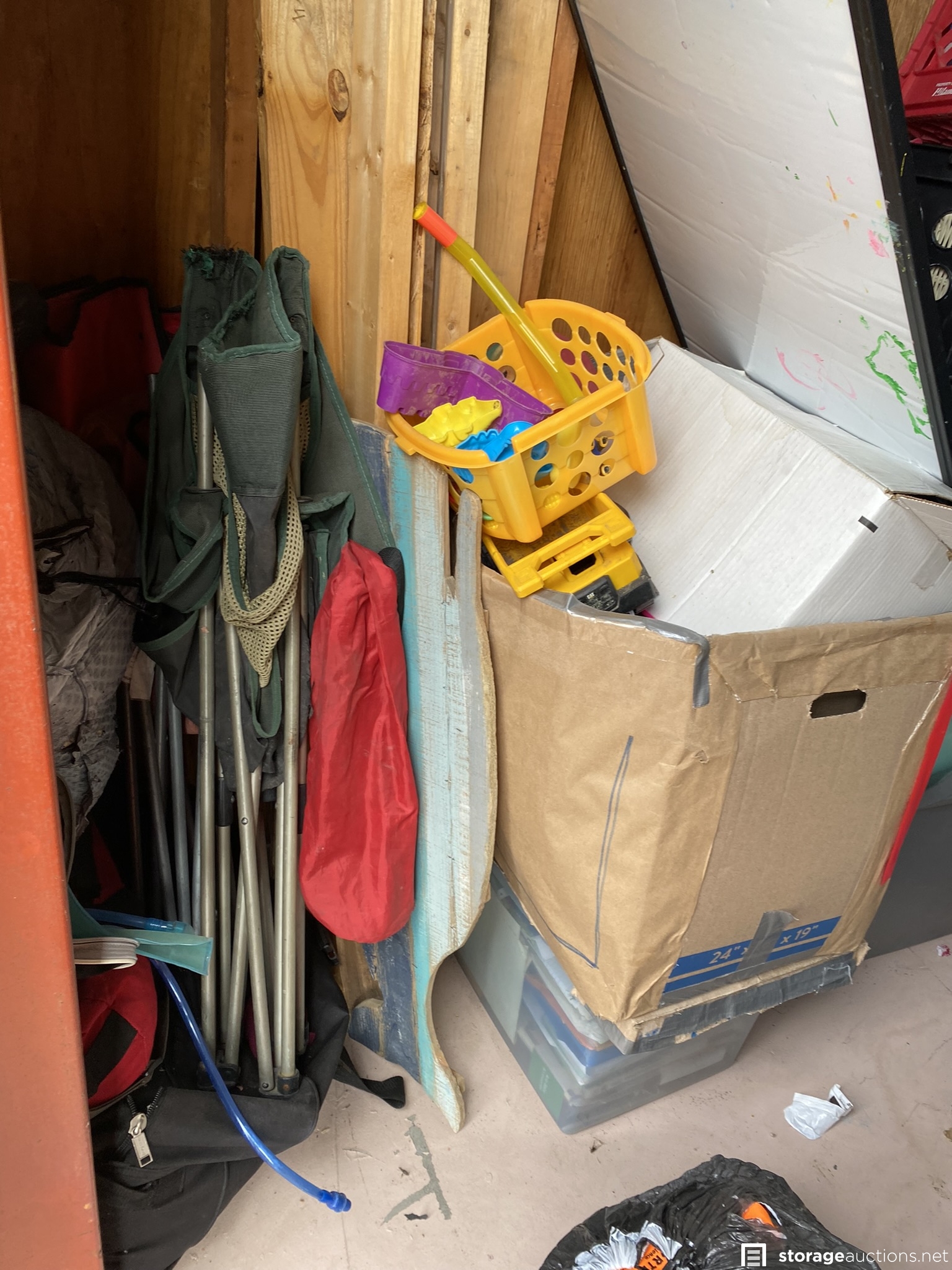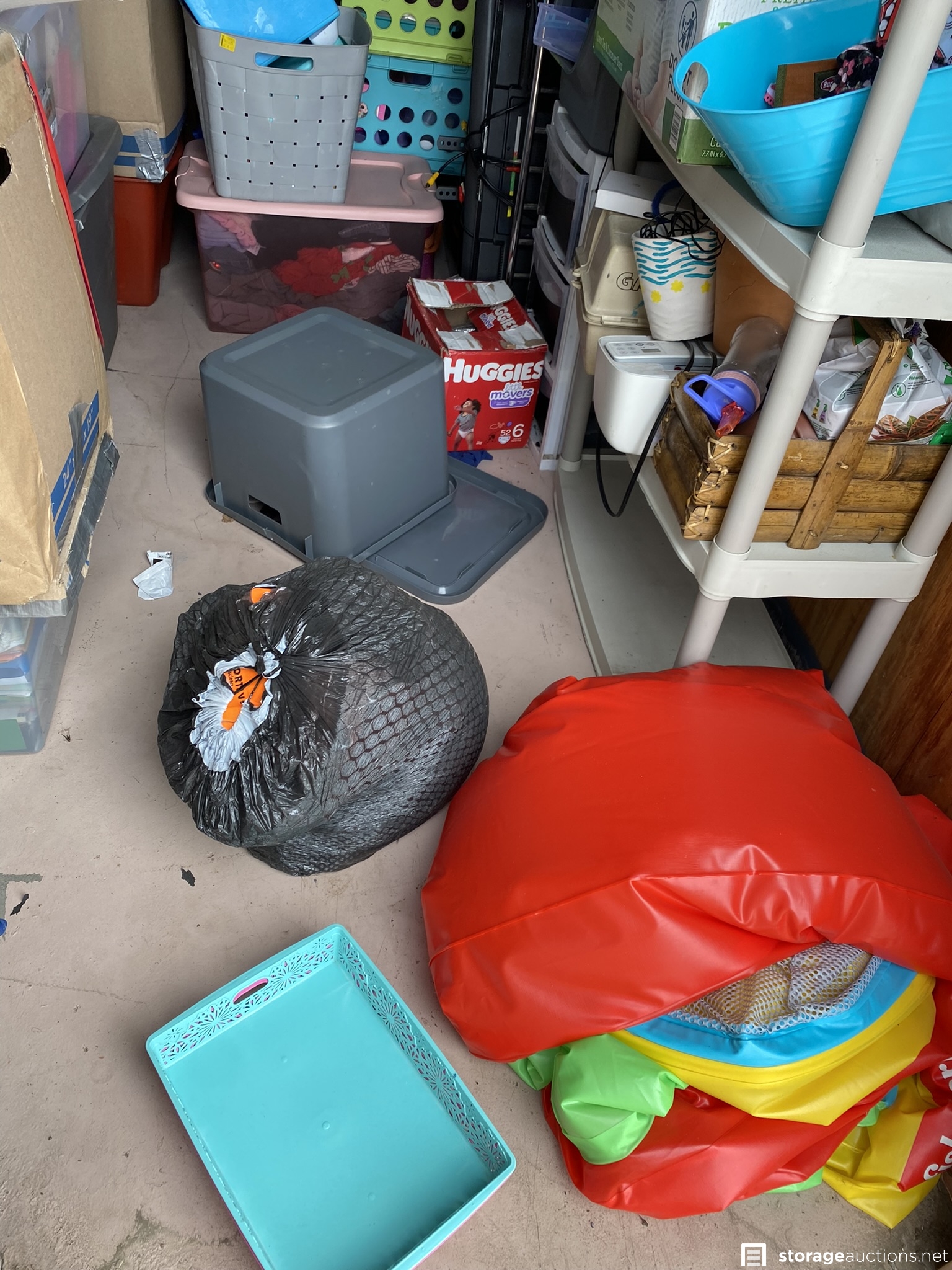 Plastic shelving, lots of plastic crates and totes, folding lawn chairs, toys, flat screen TV, and various other household items.