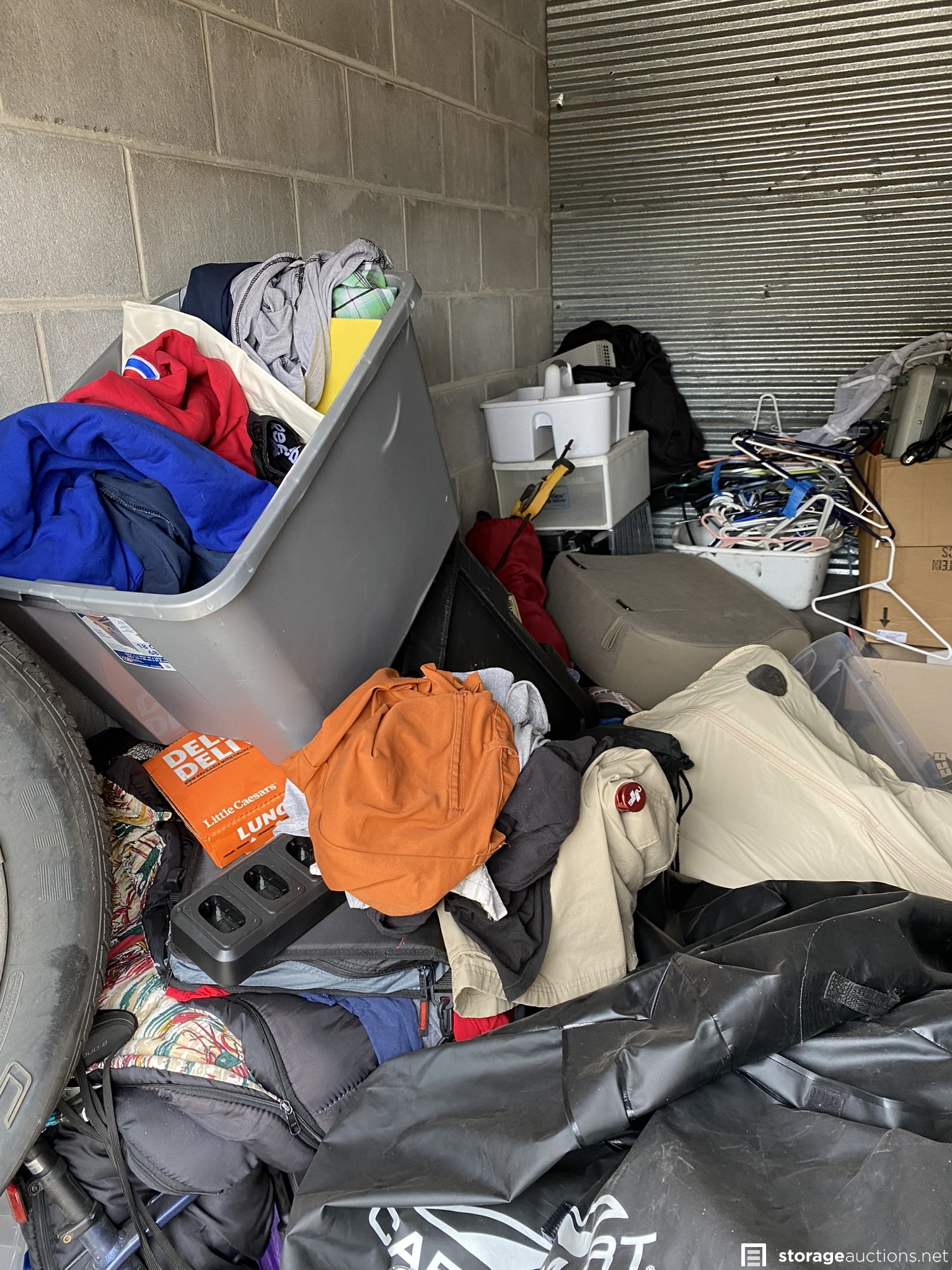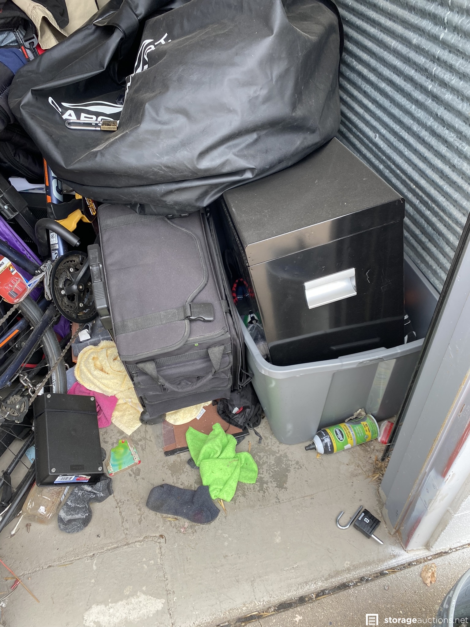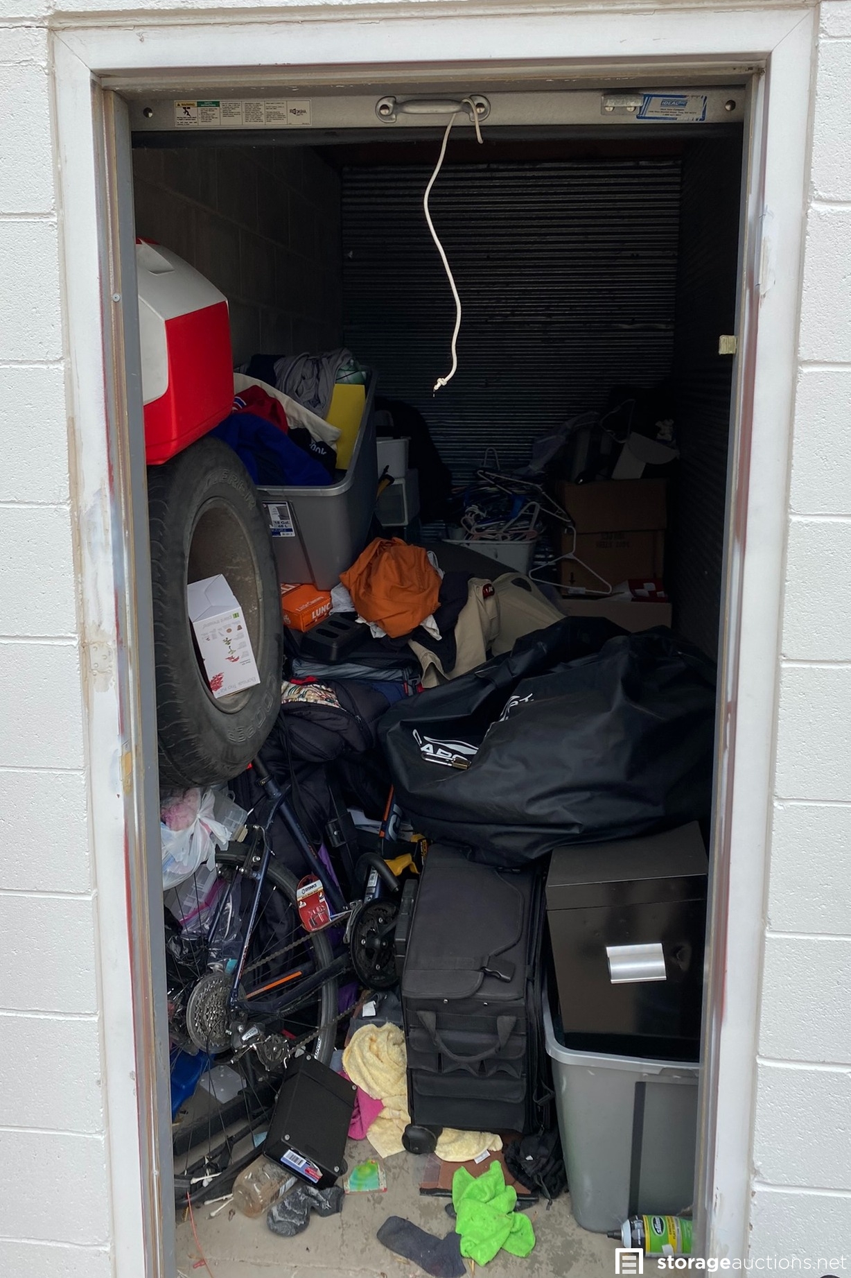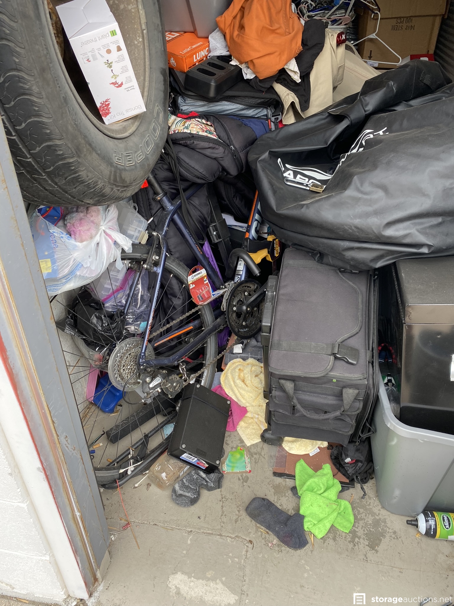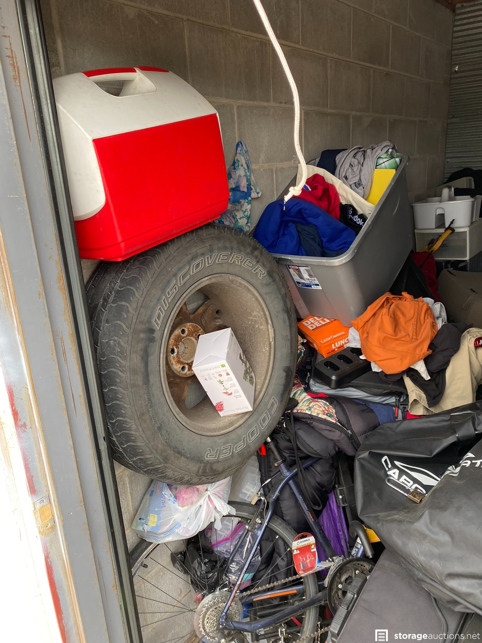 Bike, filing cabinet, tire and rim, luggage, cooler, sleeping bag, tools, plastic totes and various other household items.