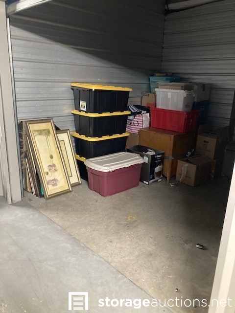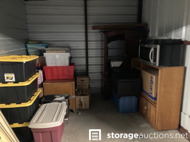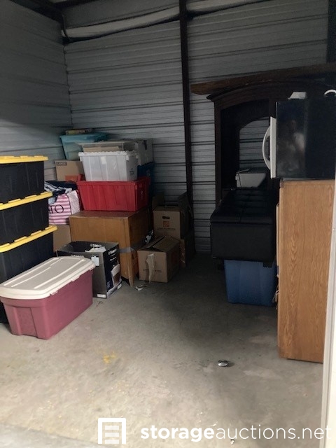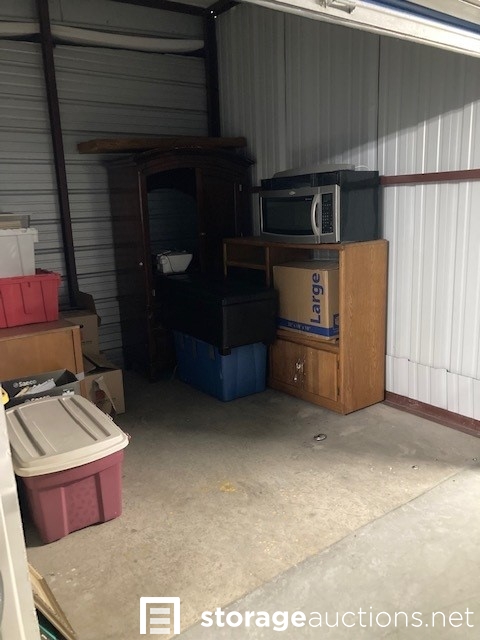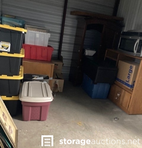 The contents of the unit visibly include but is not limited to: Totes, boxes, bags, cabinets, microwave.