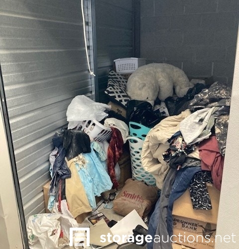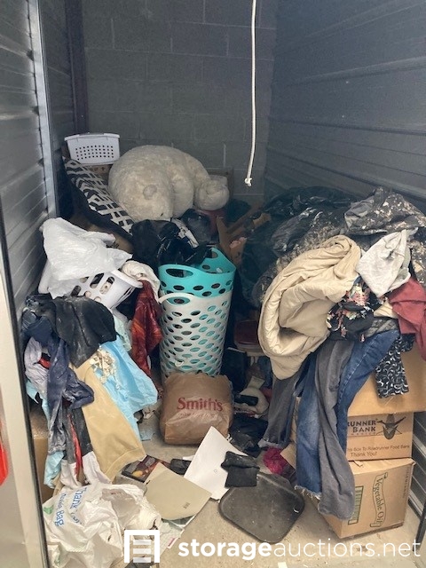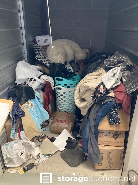 The contents of the unit visibly include but is not limited to: Bags, Boxes, Clothes, laundry basket, stuffed animals.