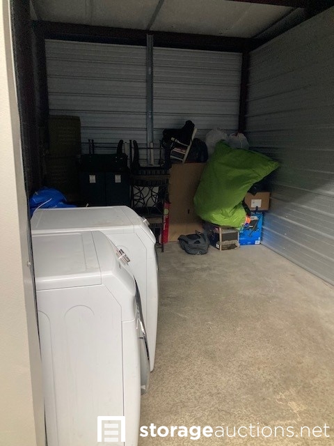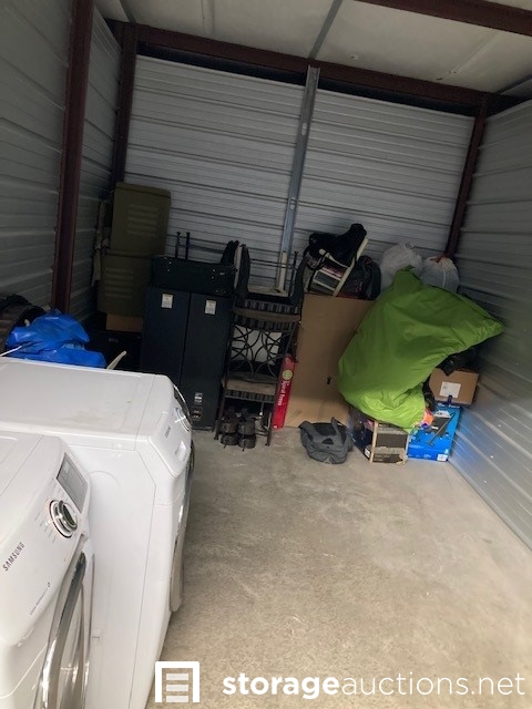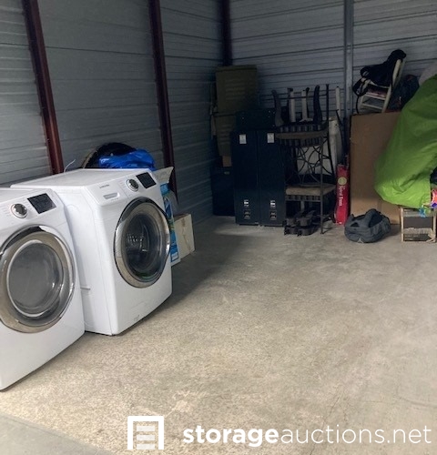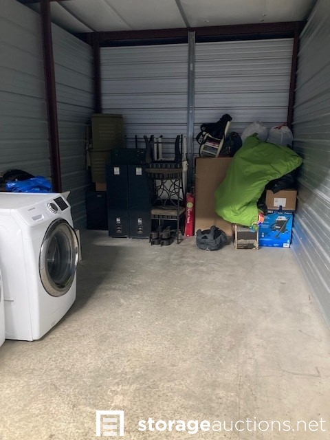 The contents of the unit visibly include but is not limited to: Washer dryer set, pool, vacuum, speakers, mini fridge, chair, bags, clothes, boxes.