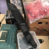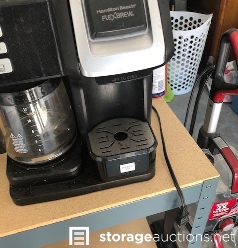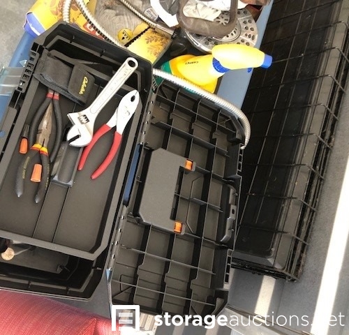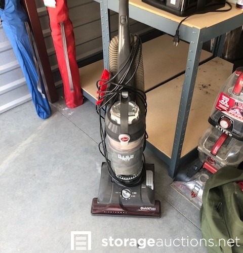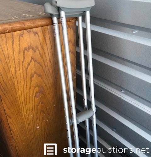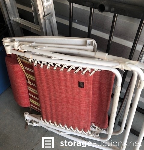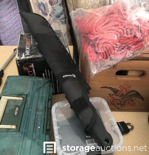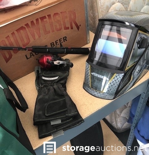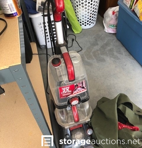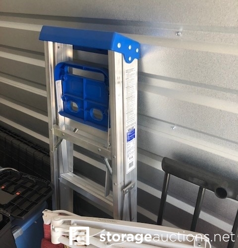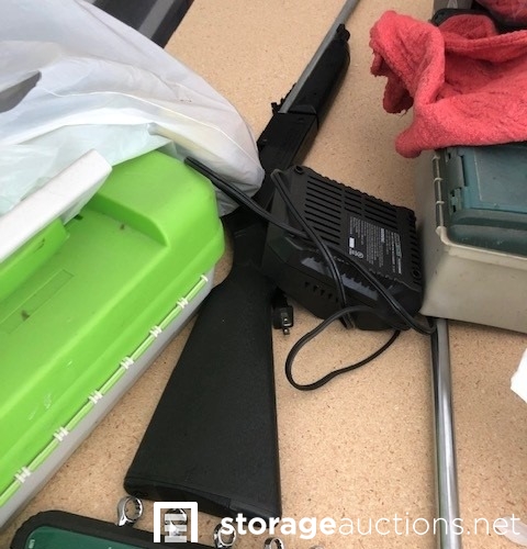 Stool, Vacuum, Carpet Cleaner, 3 folding chairs, Coffee maker, Ladder, Welding Mask and gloves, Combo Wrench set, Pellet gun, Machete, Yard toss beanbag game, Dresser, Luggage, 2 fishing rods, Dog Kennel, Crutches