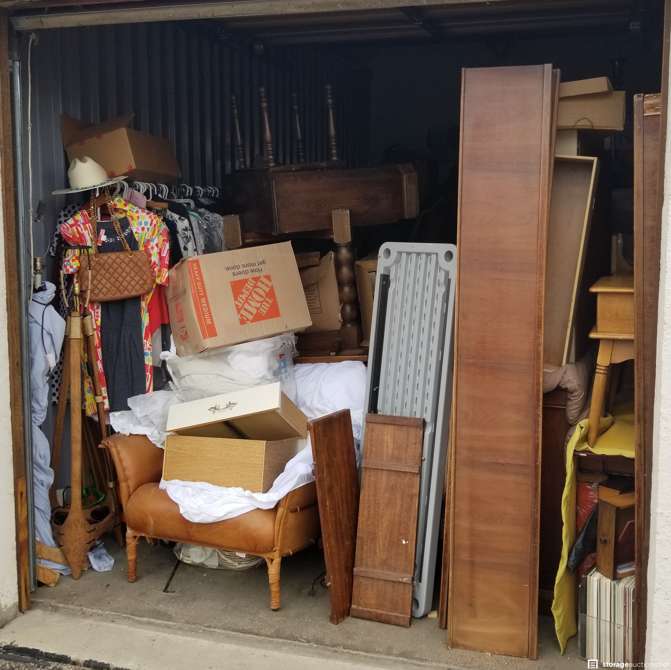 shelving, clothing, furniture, personal items, unopened boxes, back packs, unit is very full