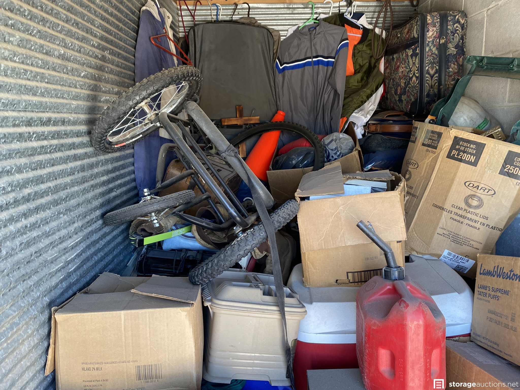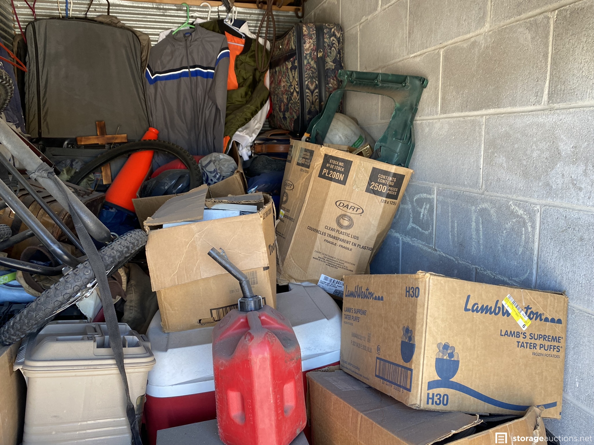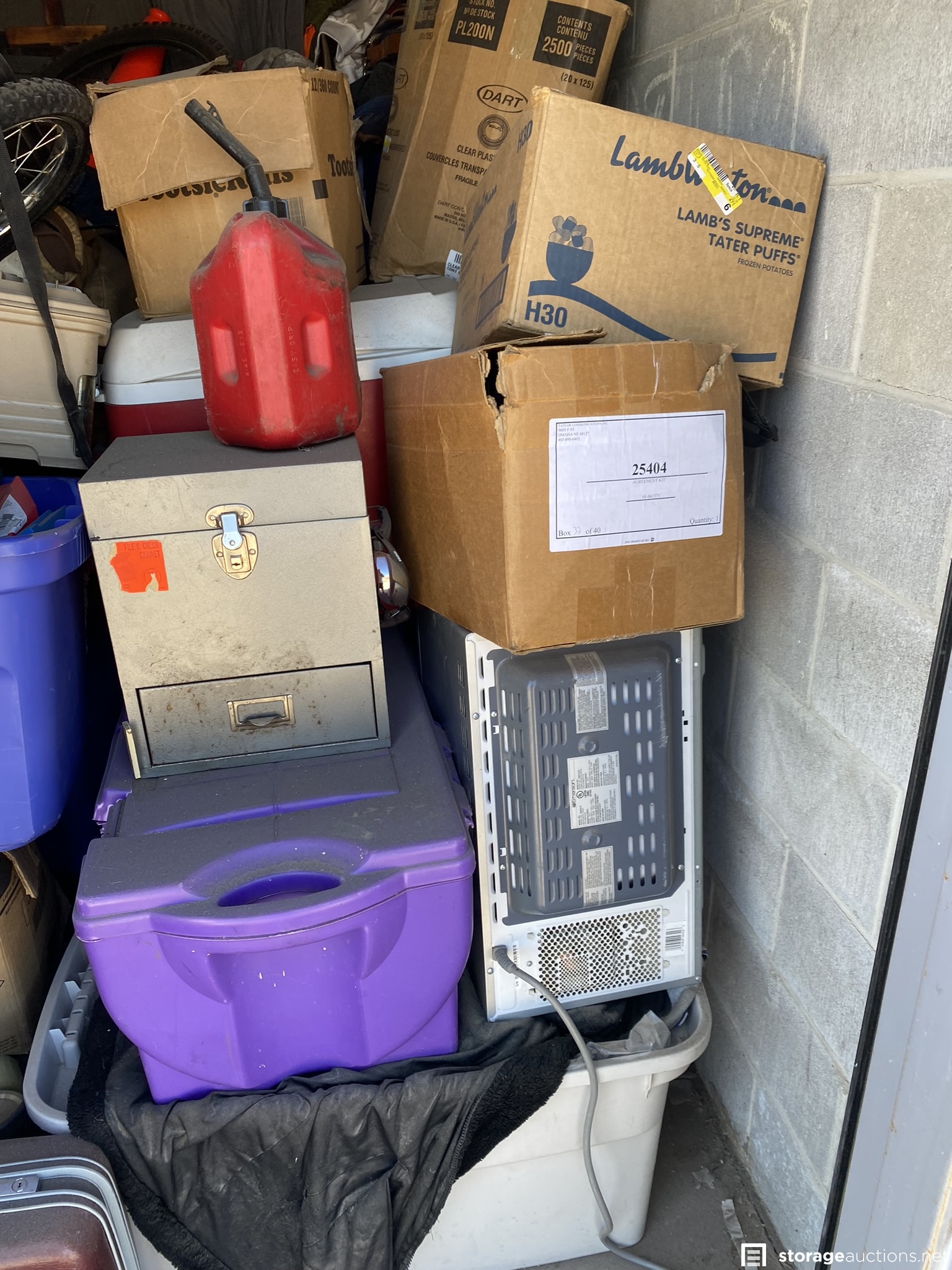 Suitcases, metal lock box, gas can, hard side cooler, microwave, Scout bow, 3 wheeler, hard hat, jackets, totes, various household goods.