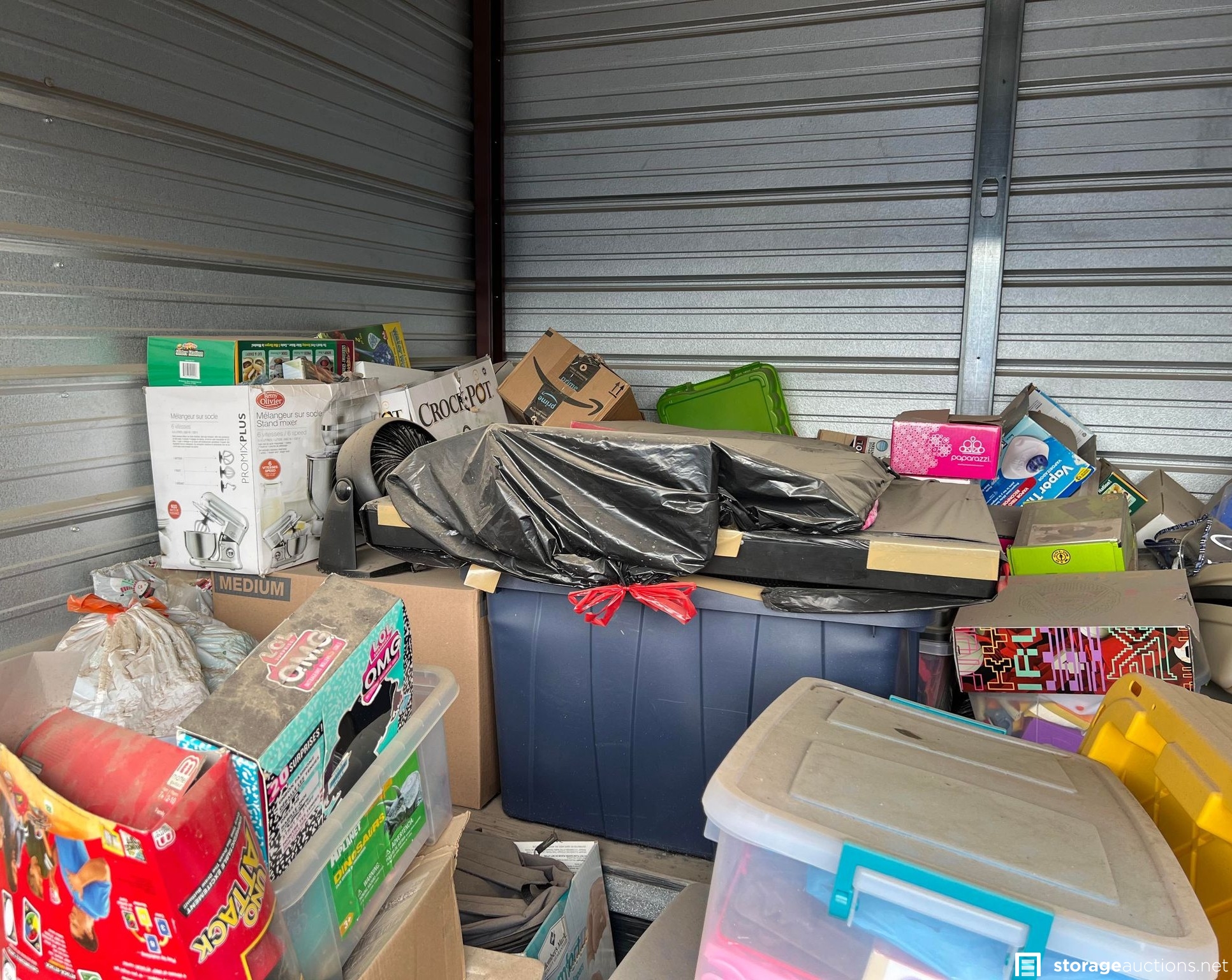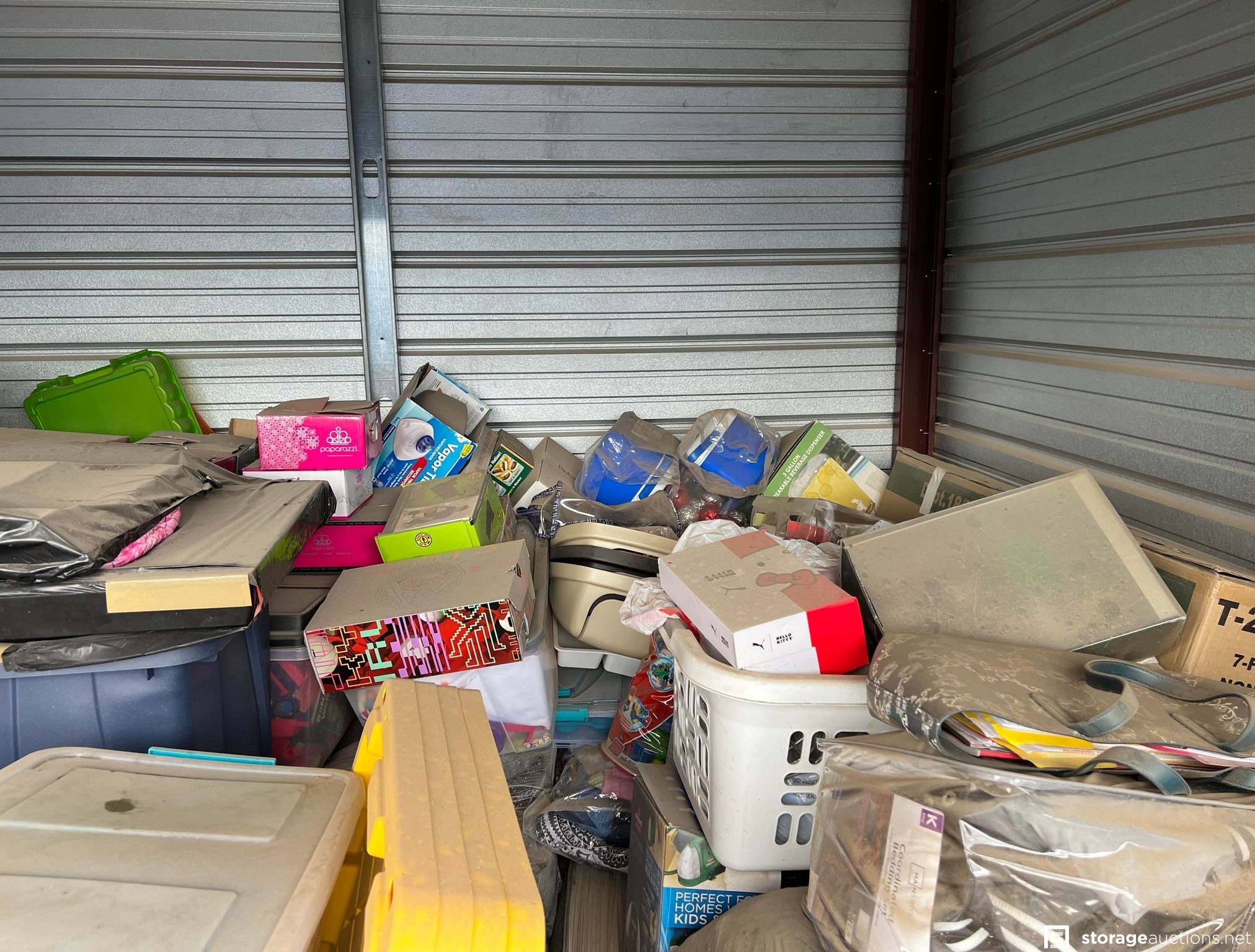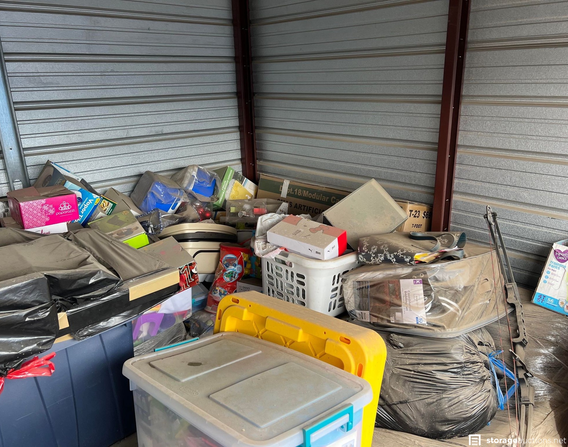 The contents of the unit visibly includes but is not limited to: totes, boxes, couch, chairs, a compound bow, coolers, and a christmas tree.