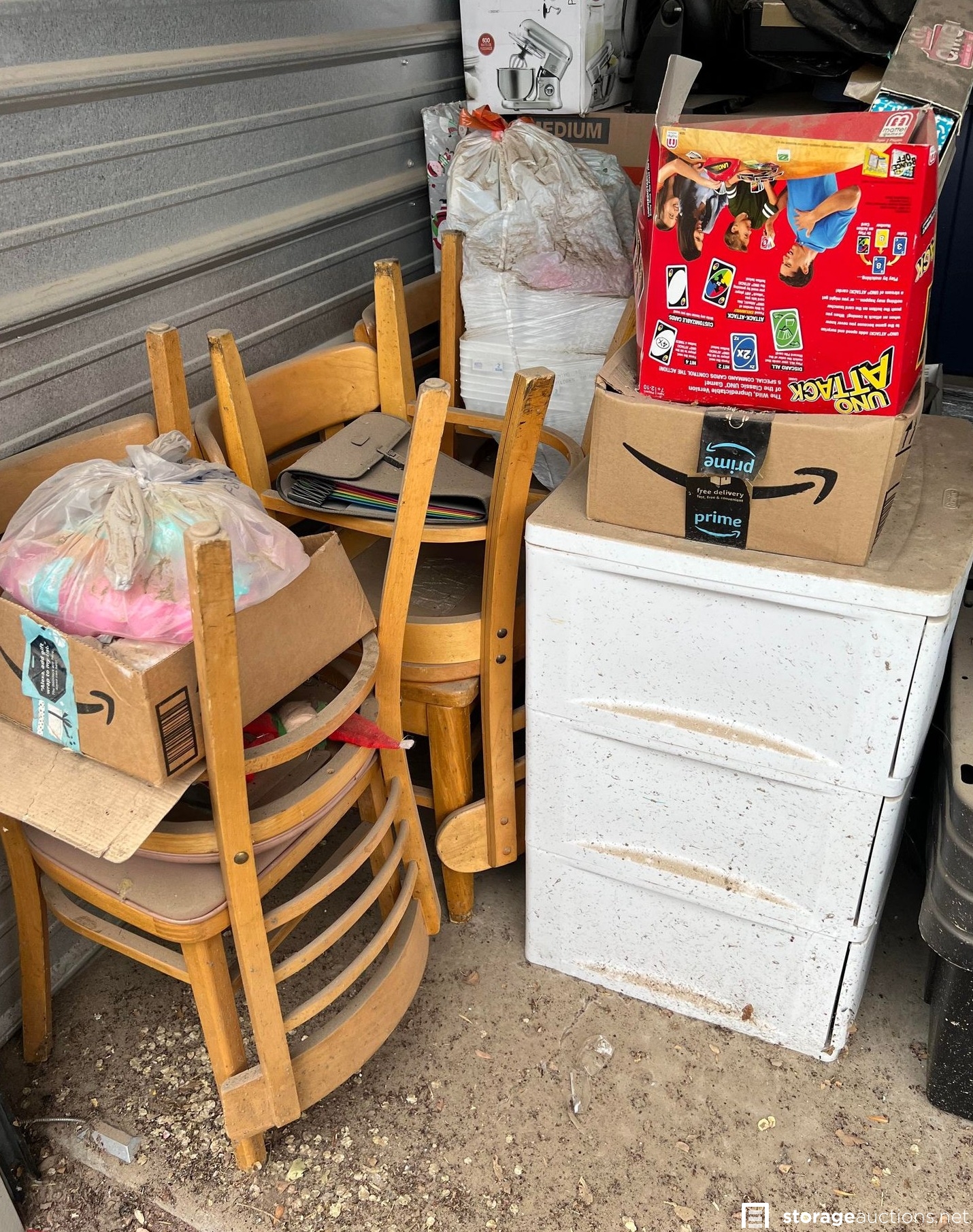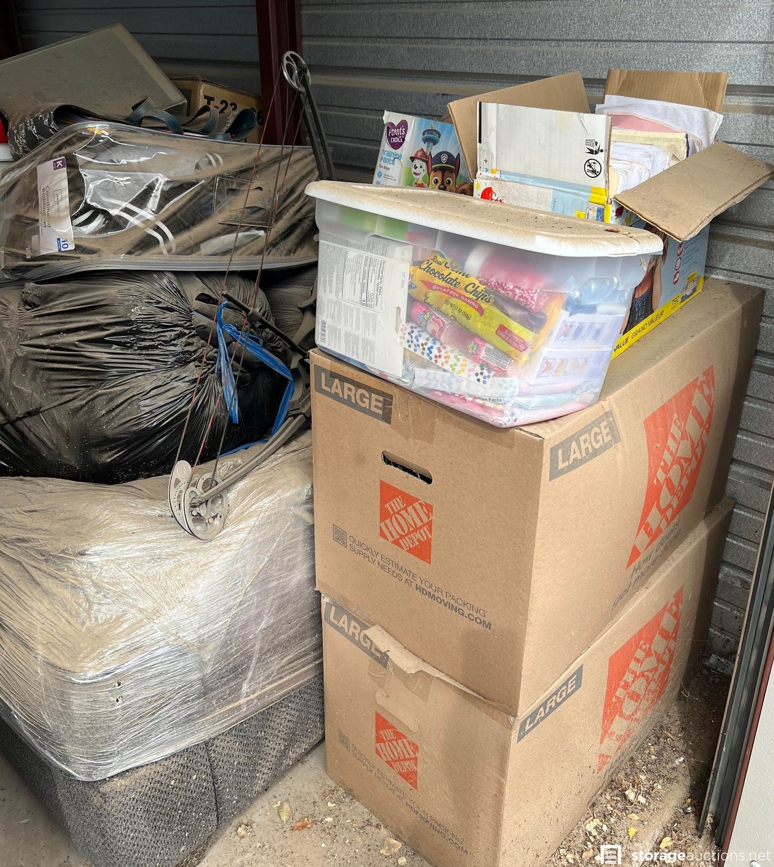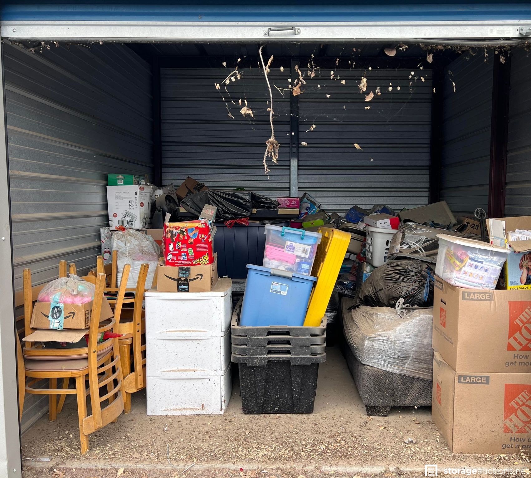The contents of the unit visibly includes but is not limited to: totes, boxes, couch, chairs, a compound bow, coolers, and a christmas tree.