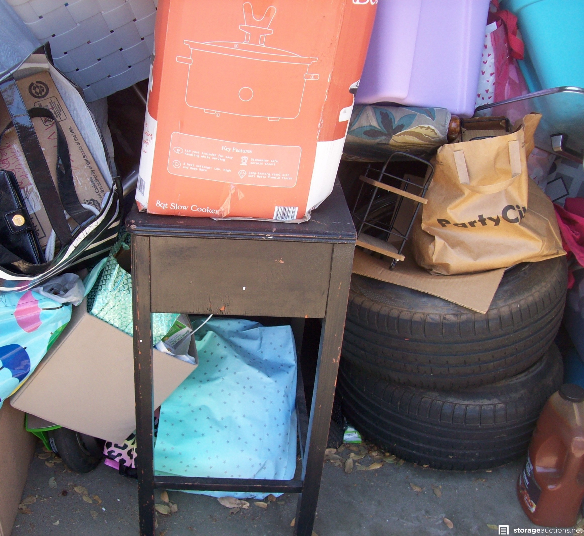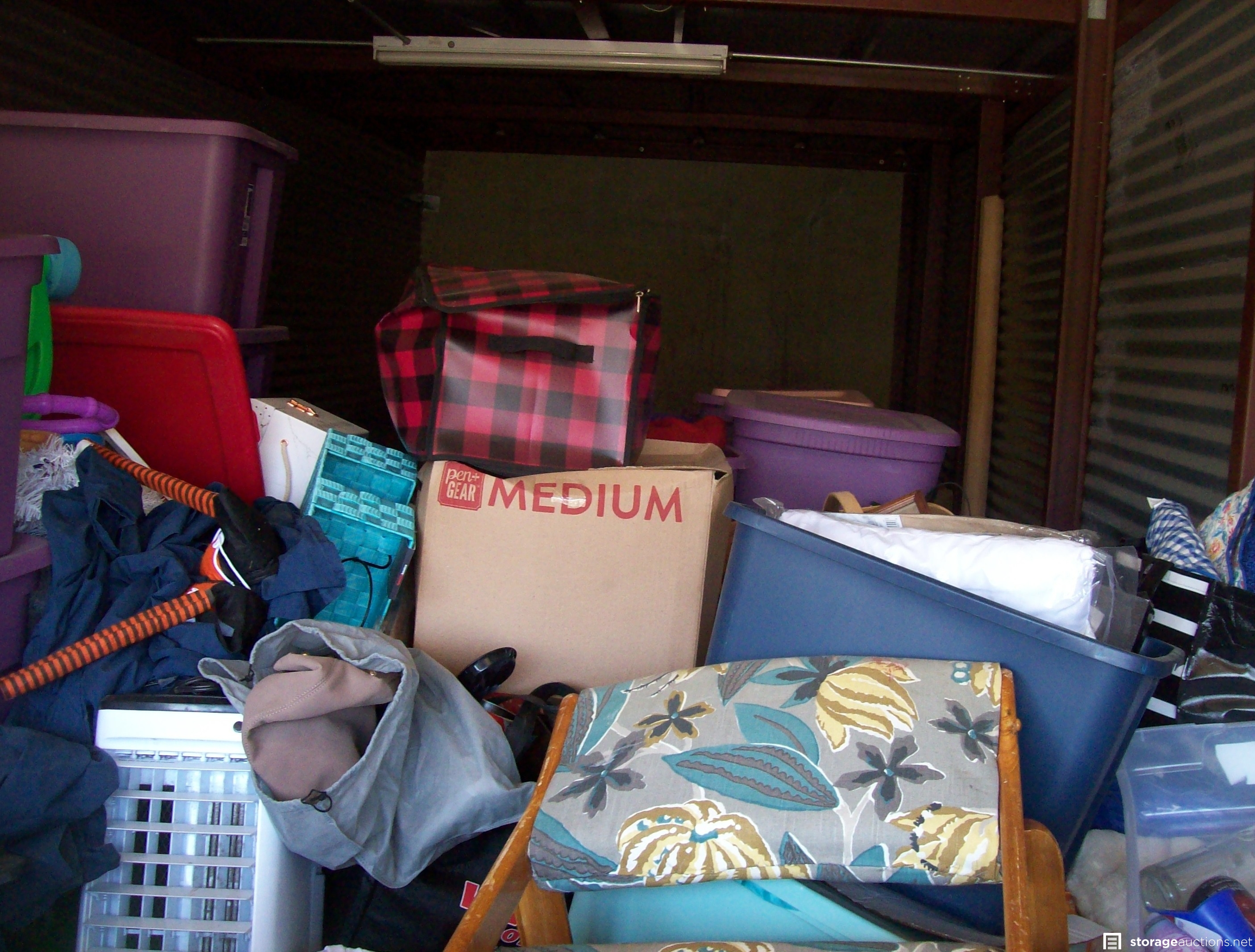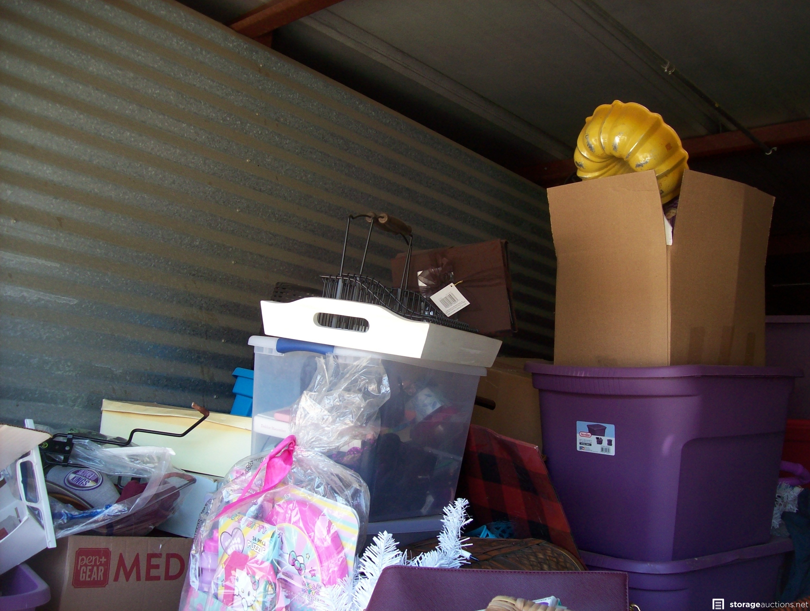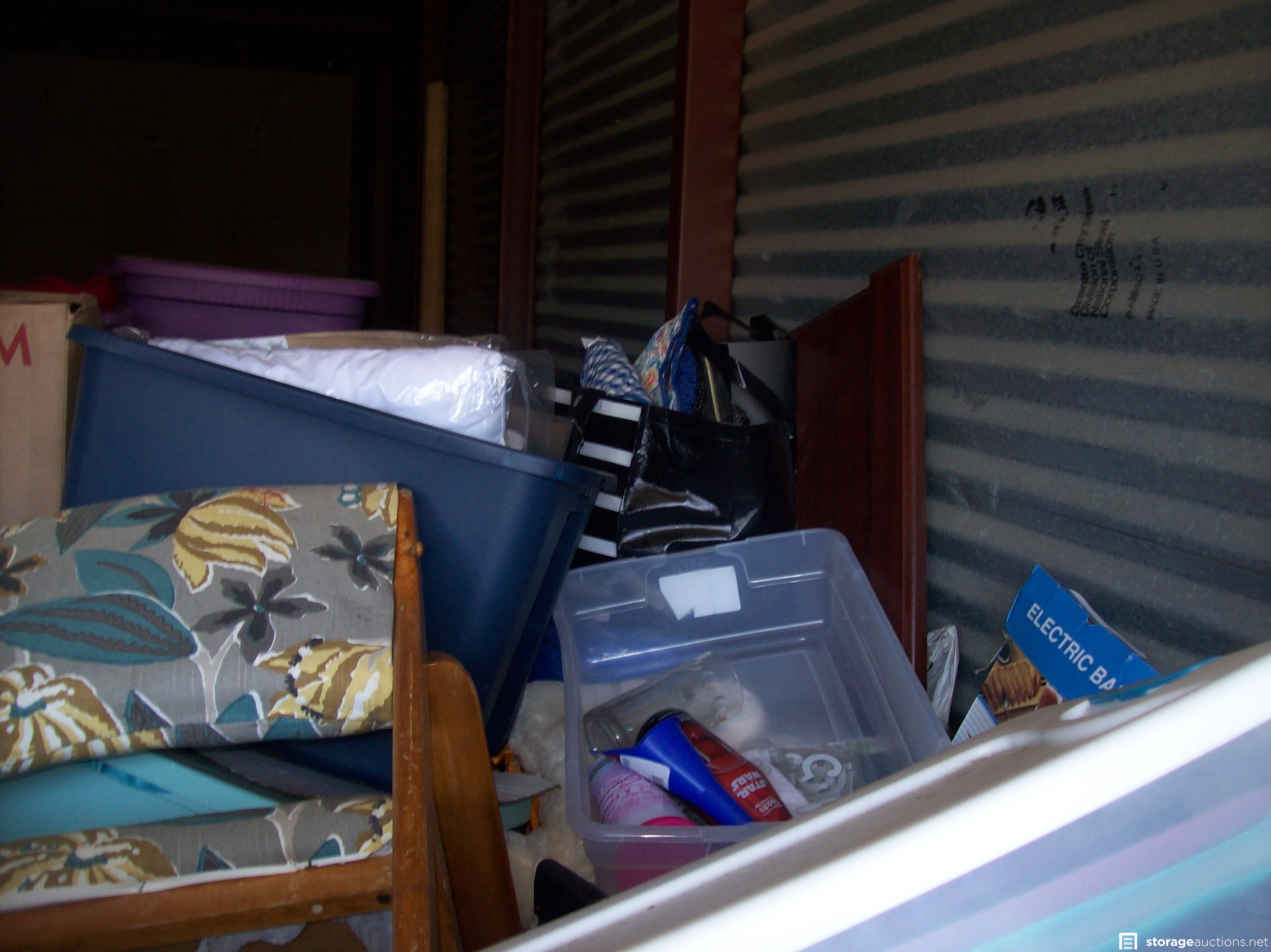 Boxes, totes, chairs, tires, wheel chair, toys, hats, shower chair, subwoofer, household items, tables. THIS UNIT HAS A CAR IN BACK OF UNIT AND IS NOT INCLUDED IN THE AUCTION. iT IS NOT FOR SALE.