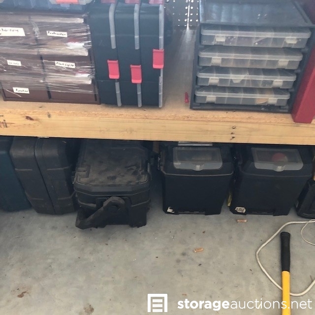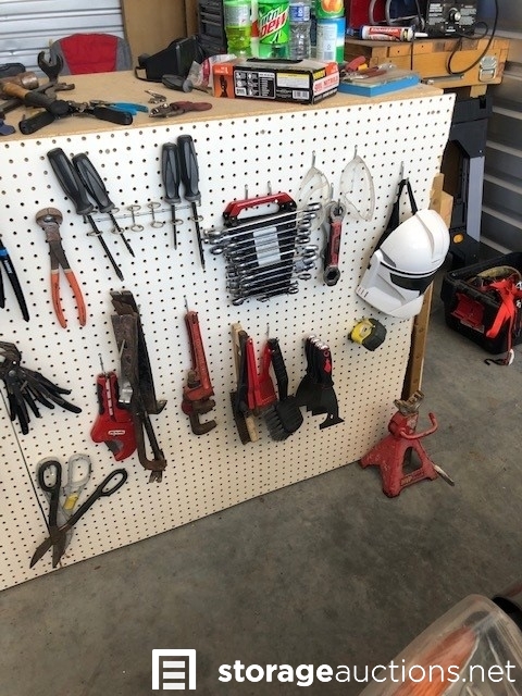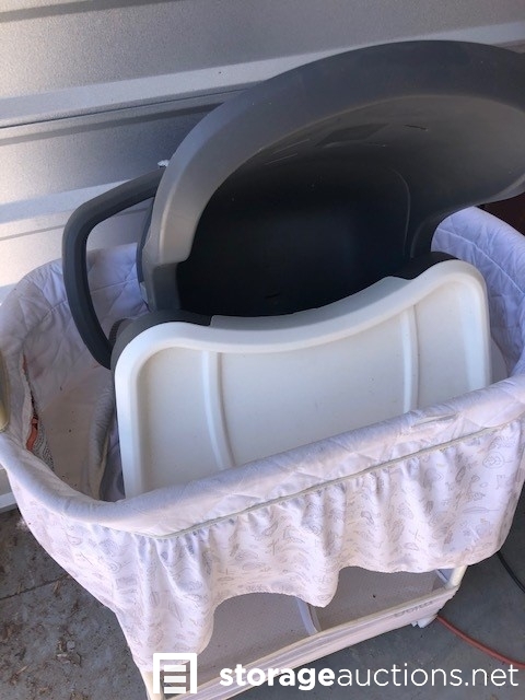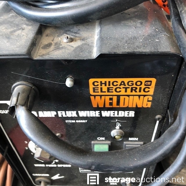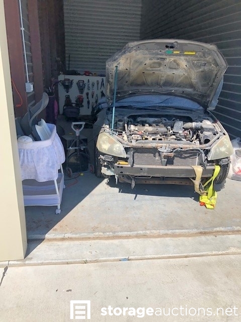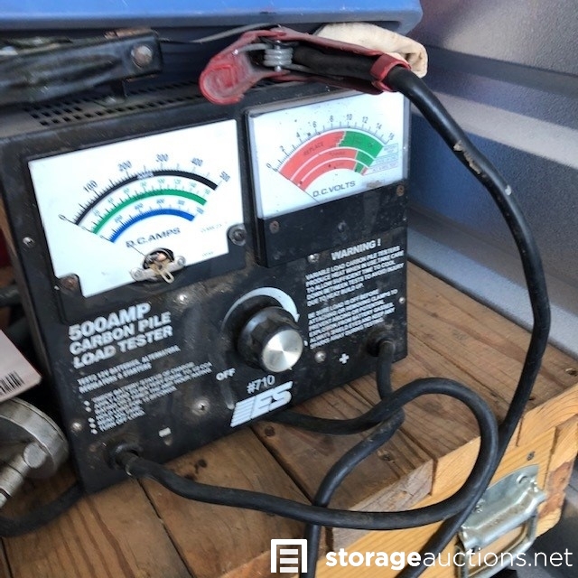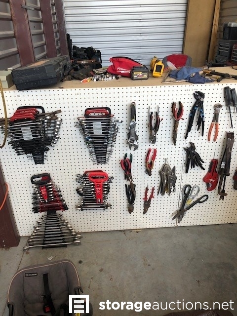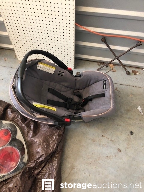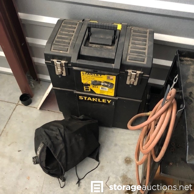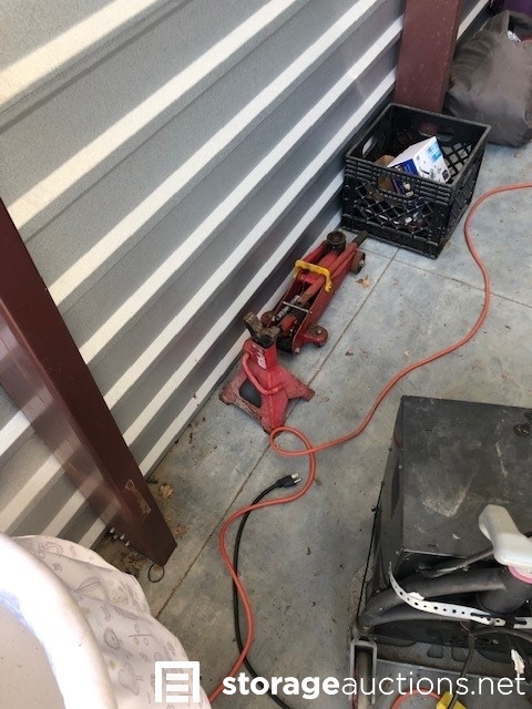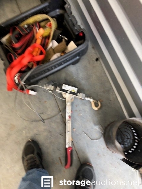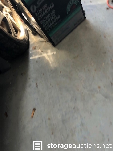 Vehicle NOT included, baby carrier, jack, jack stand, battery starter and charger, golf clubs, lots of wrenches, car seat, come-along, 500 amp load tester, chairs, flux wire welder, Stanley rolling work shop, charging ports, tools, rolling seat-tool box, extension cords, pressure gauge, socket sets, screwdrivers, pressure washer, large floodlight