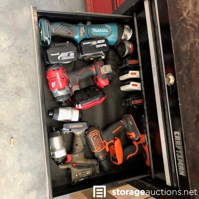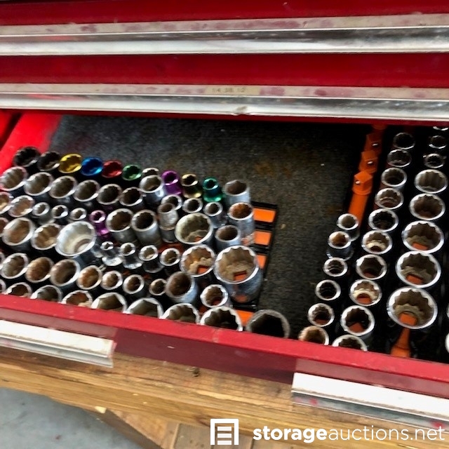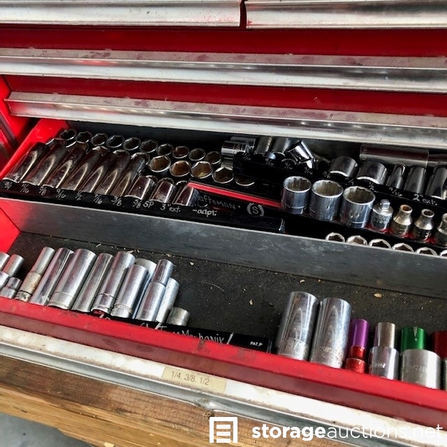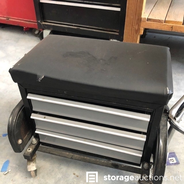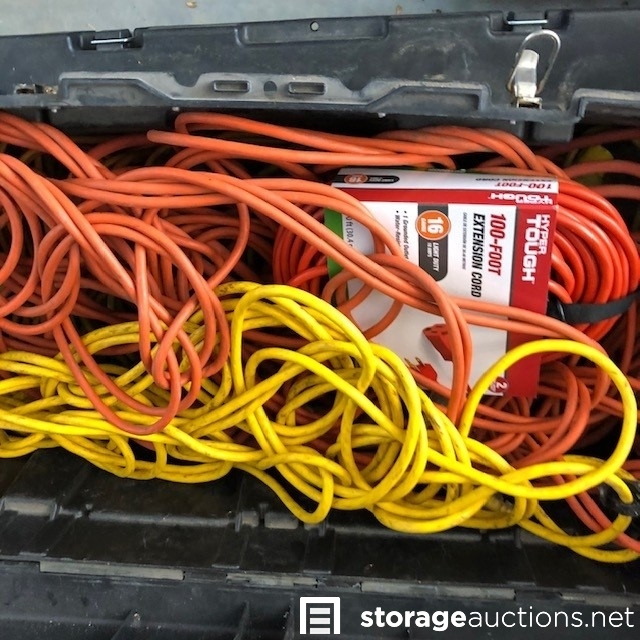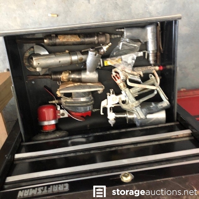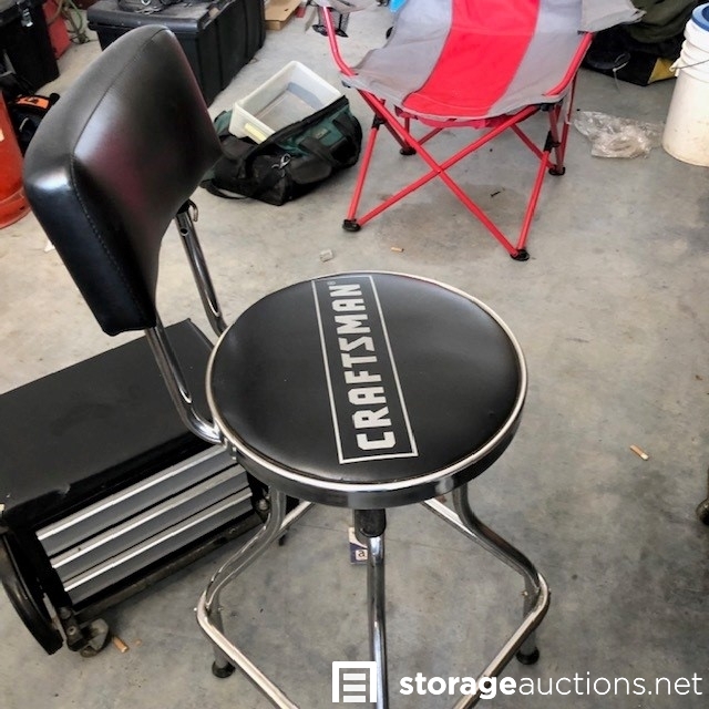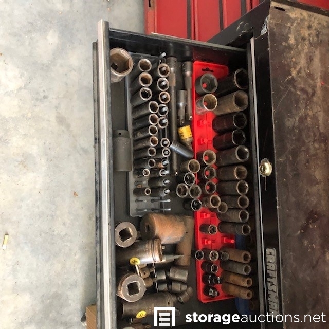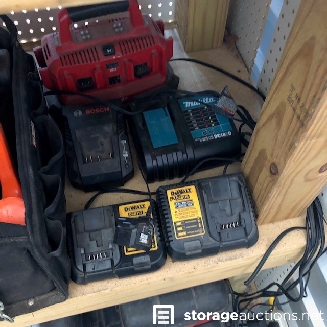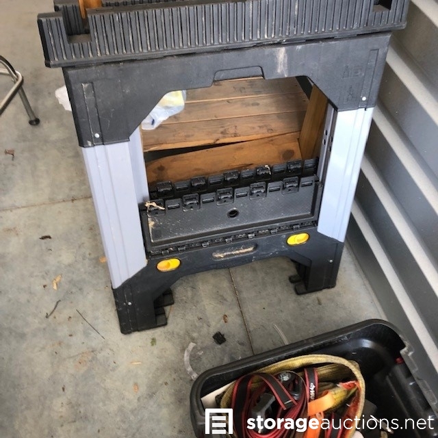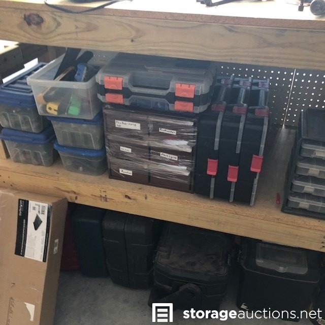 Vehicle NOT included, baby carrier, jack, jack stand, battery starter and charger, golf clubs, lots of wrenches, car seat, come-along, 500 amp load tester, chairs, flux wire welder, Stanley rolling work shop, charging ports, tools, rolling seat-tool box, extension cords, pressure gauge, socket sets, screwdrivers, pressure washer, large floodlight