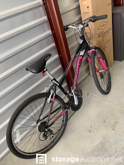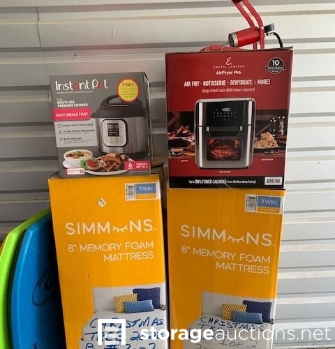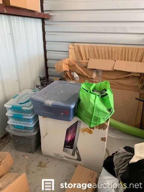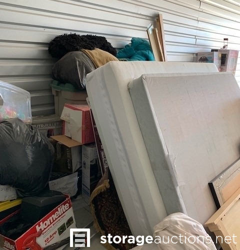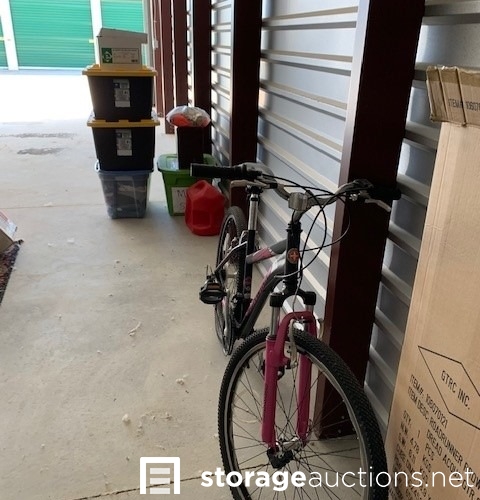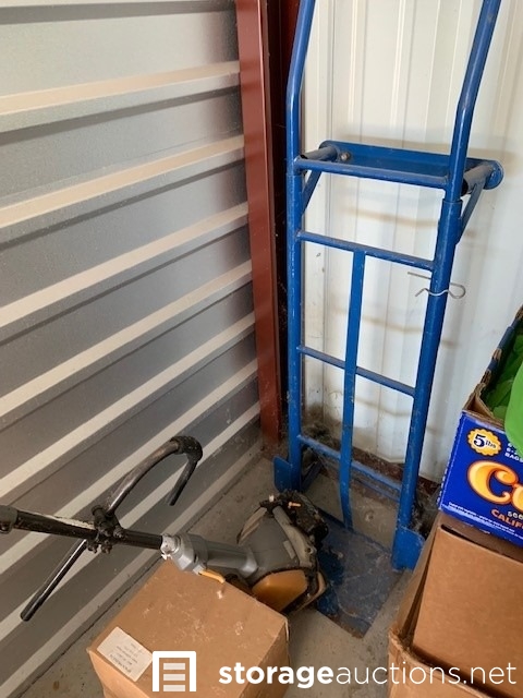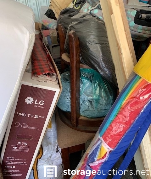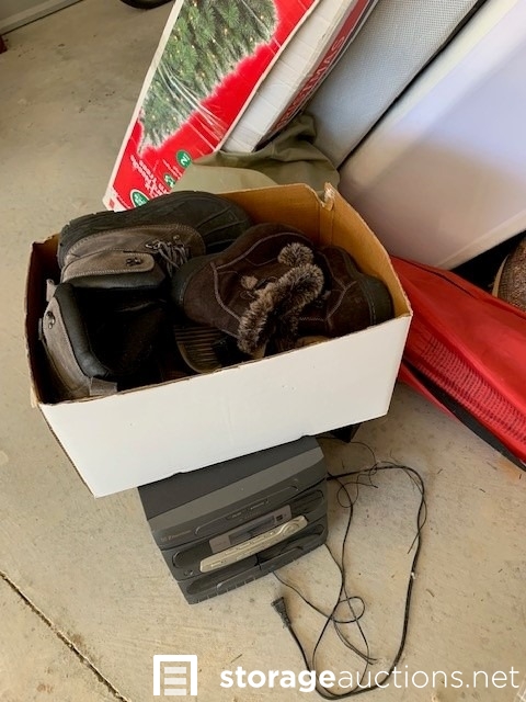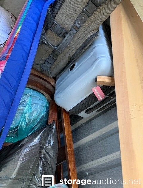 Luggage, chairs, bed & frame, clothes, boots, bicycle, dolly cart, pet kennel, weed trimer, totes, lots of miscellaneous