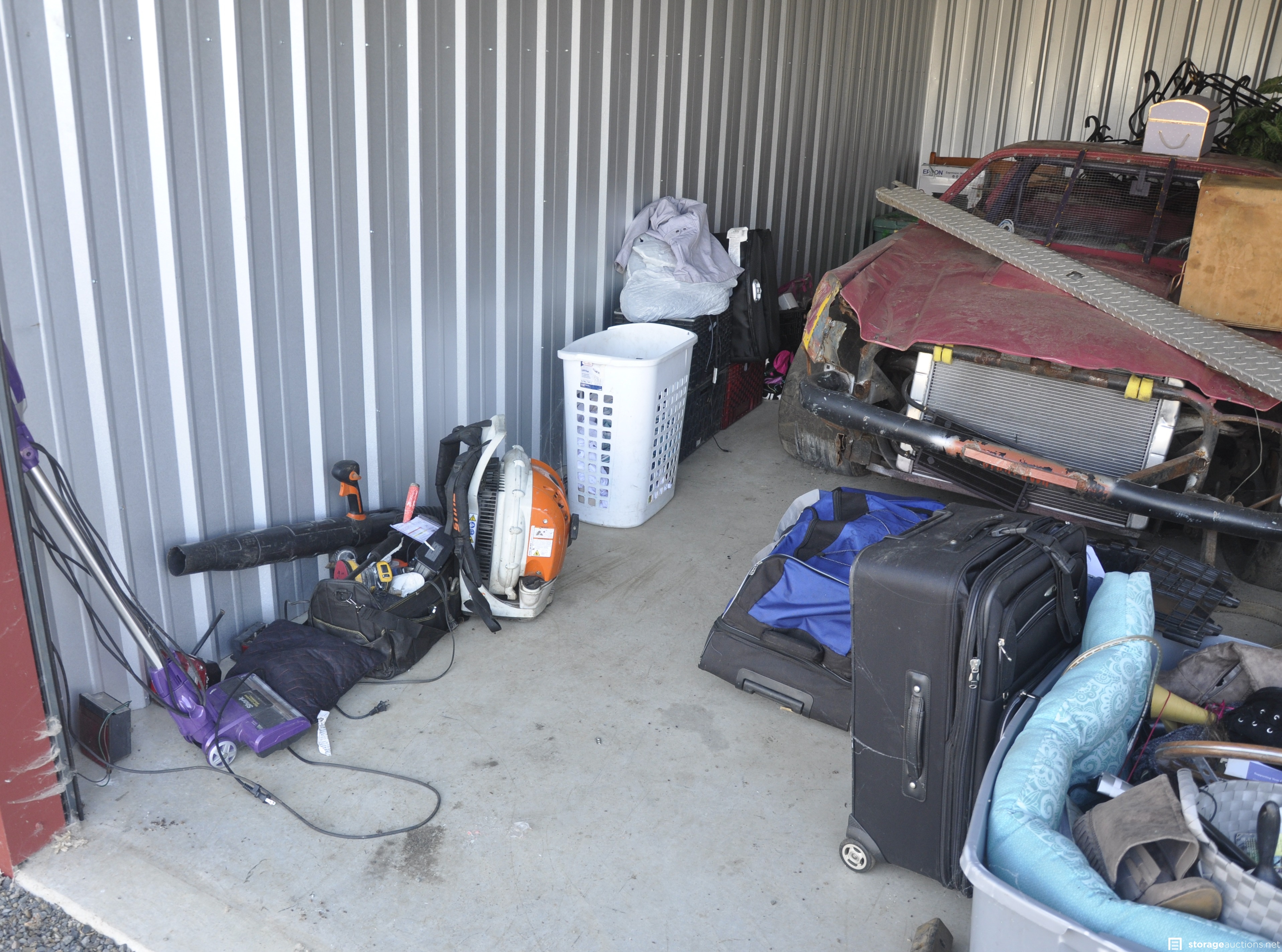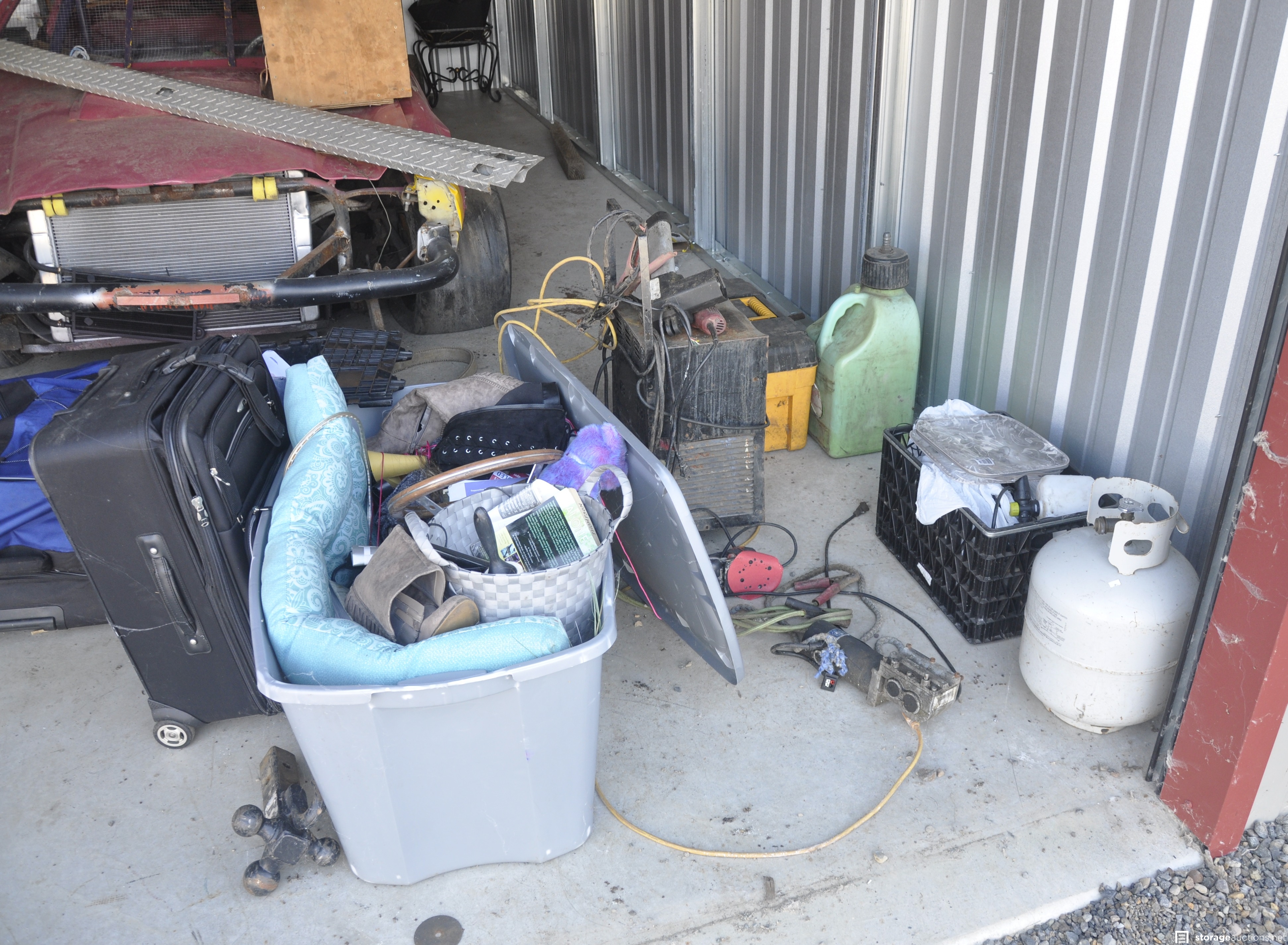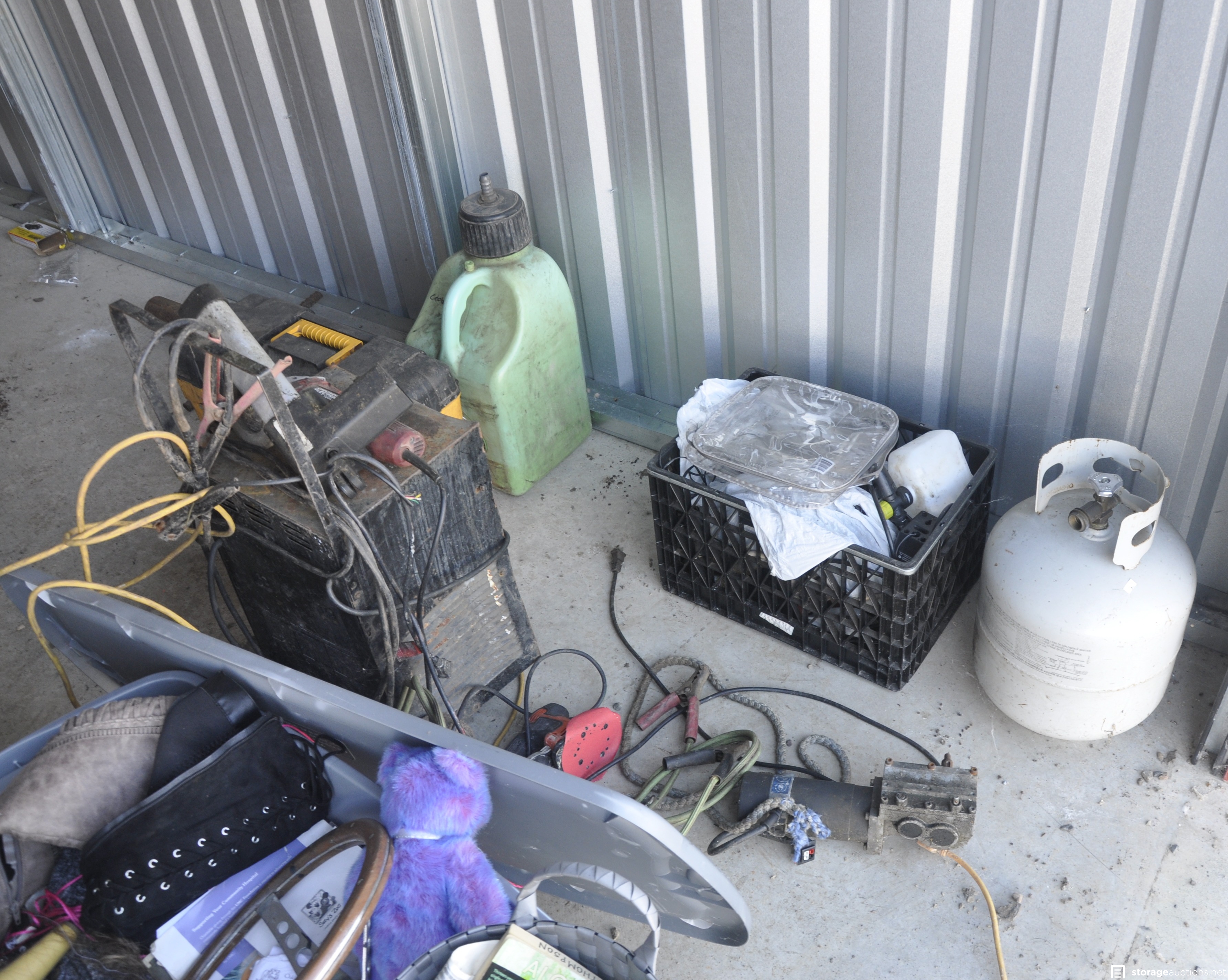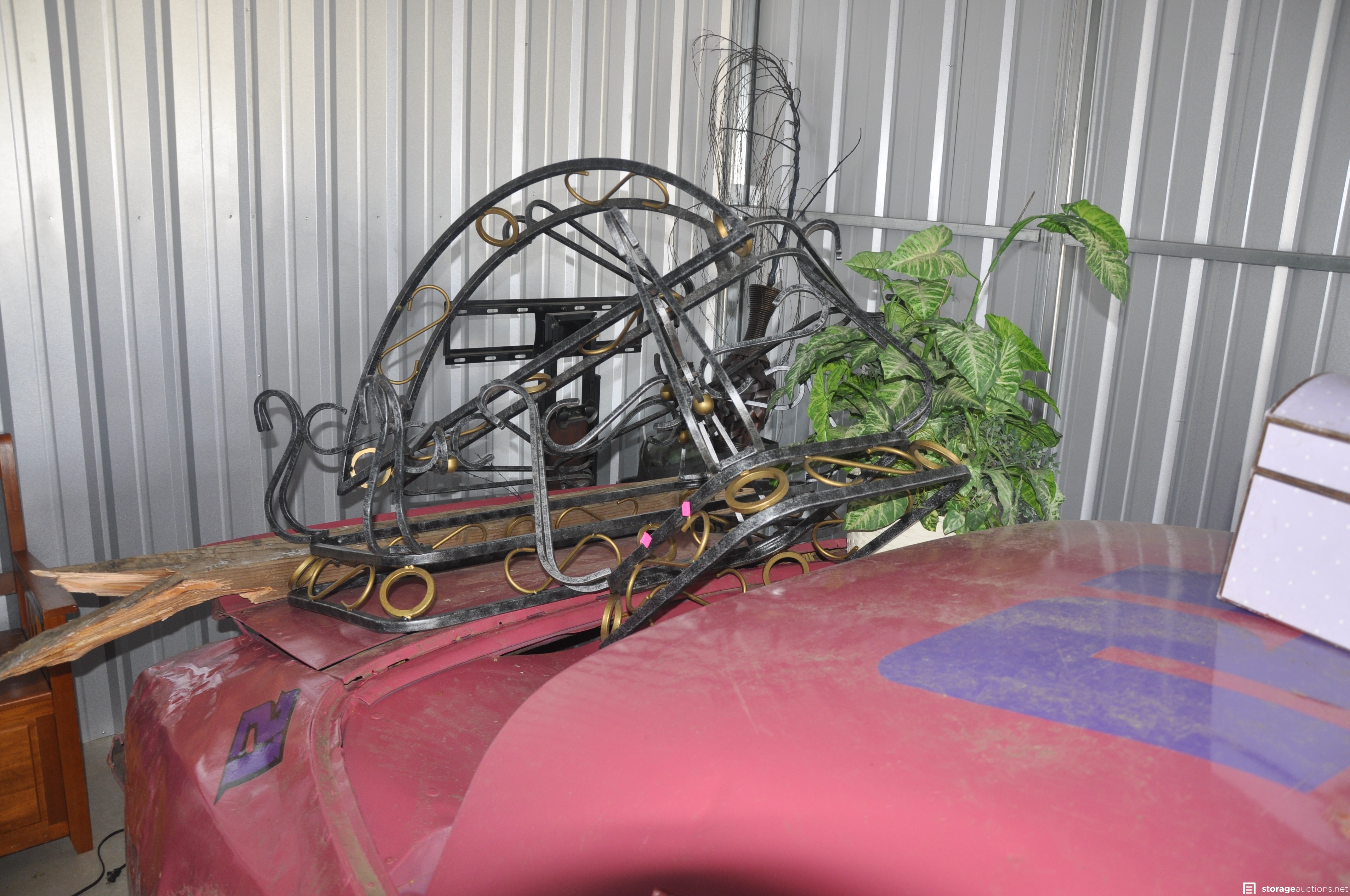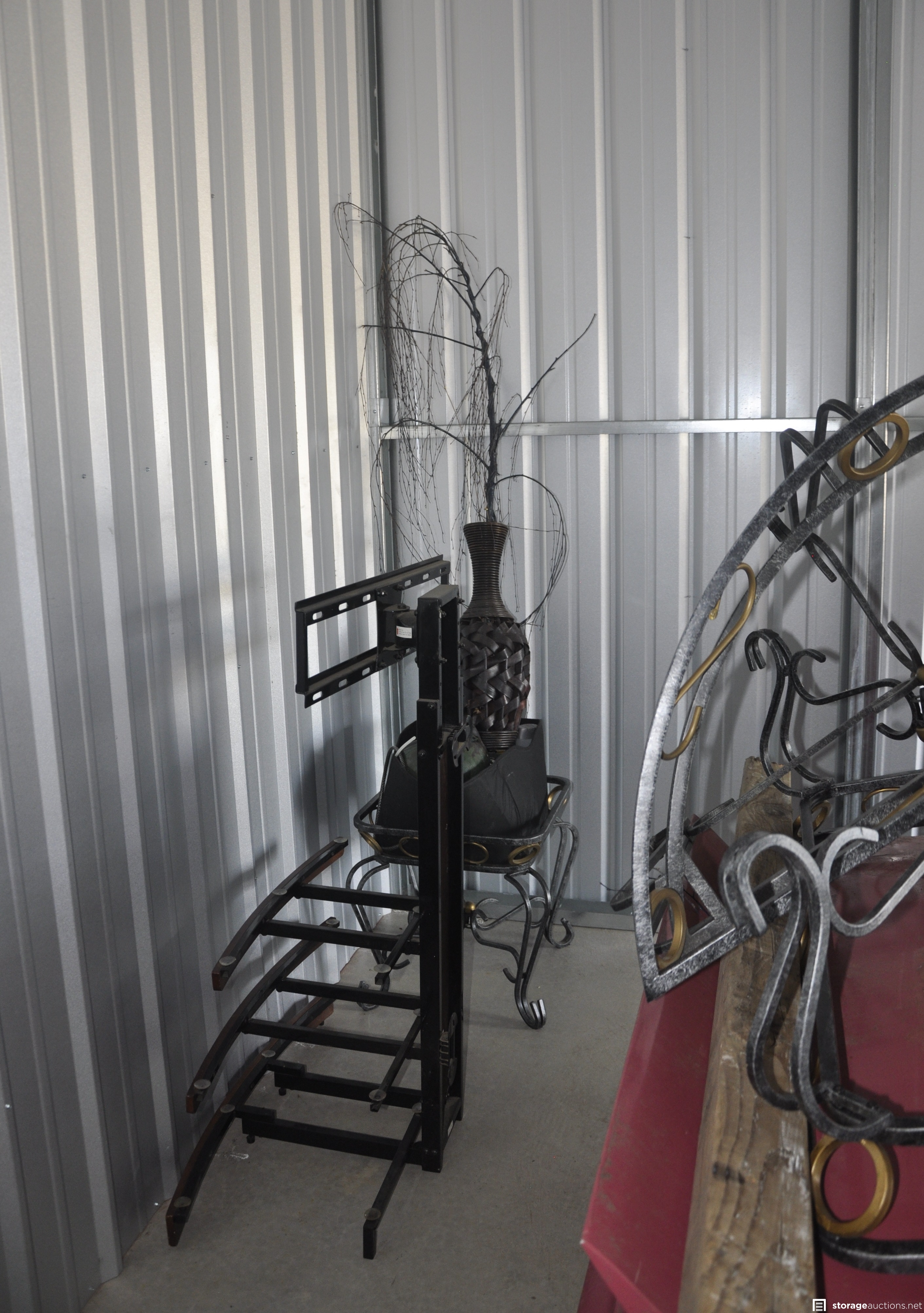 Unit appears to contain; leaf blower, shark vac, battery tester, toolbox, storage bench, metal tv stand, metal set of coffee table-2 end tables-entry table (no glass), tow hitch. car for maybe demo derby.